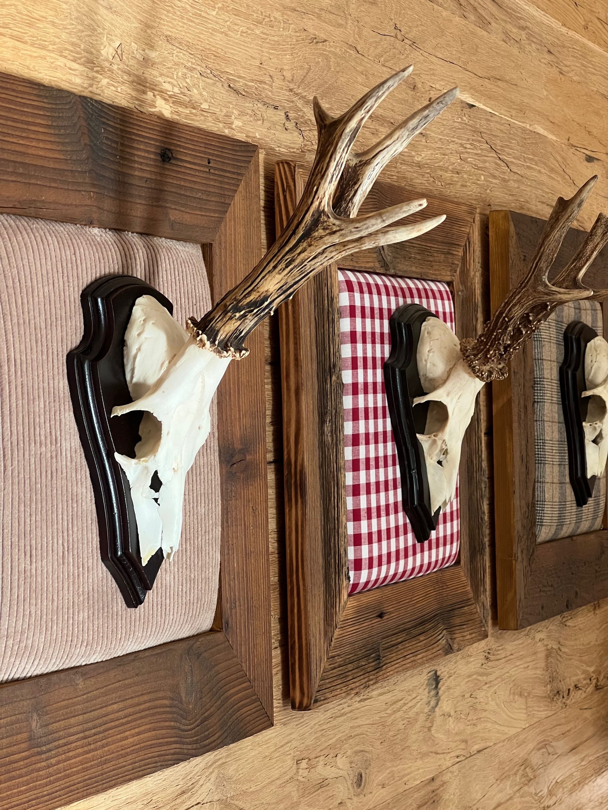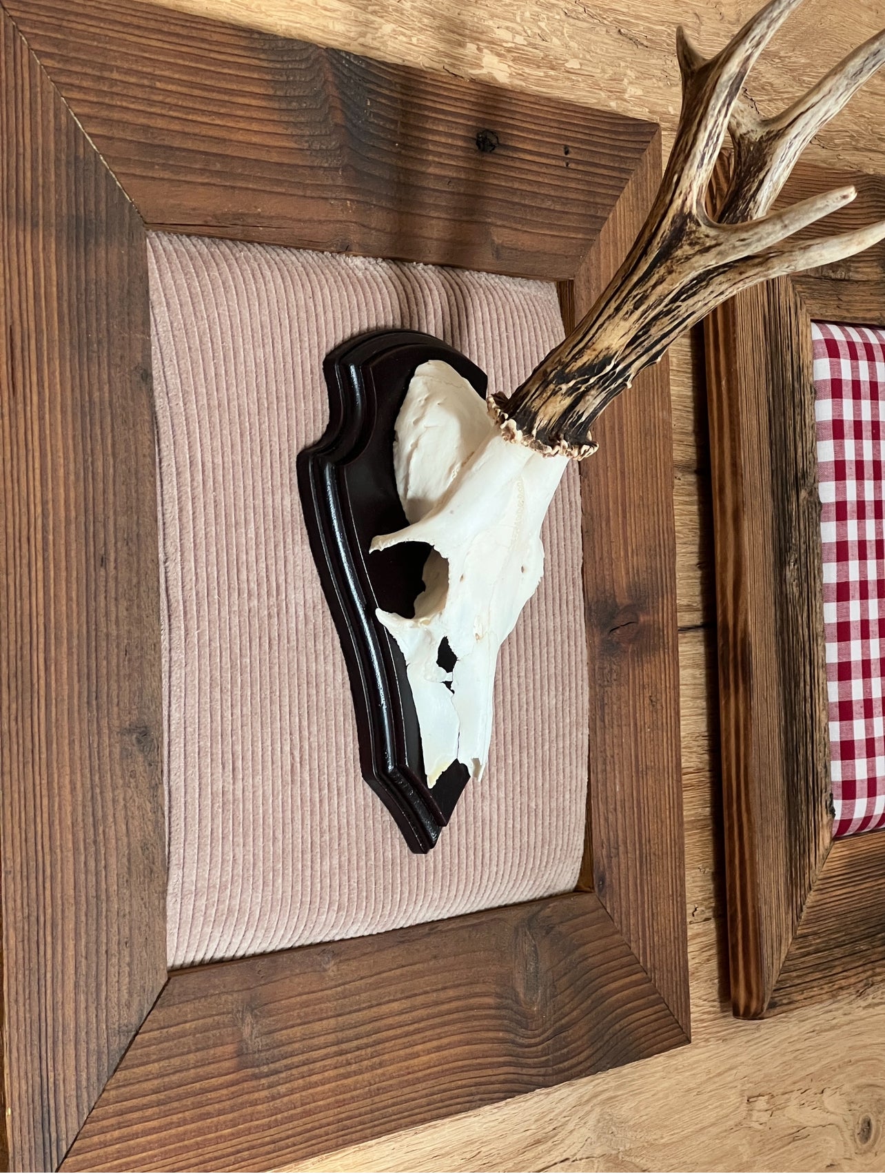 Dieses handgefertigte Bild mit echtem Rehgehörn verbindet alpine Tradition mit modernem Design und schafft so einen einzigartigen Blickfang im Chalet-Stil.