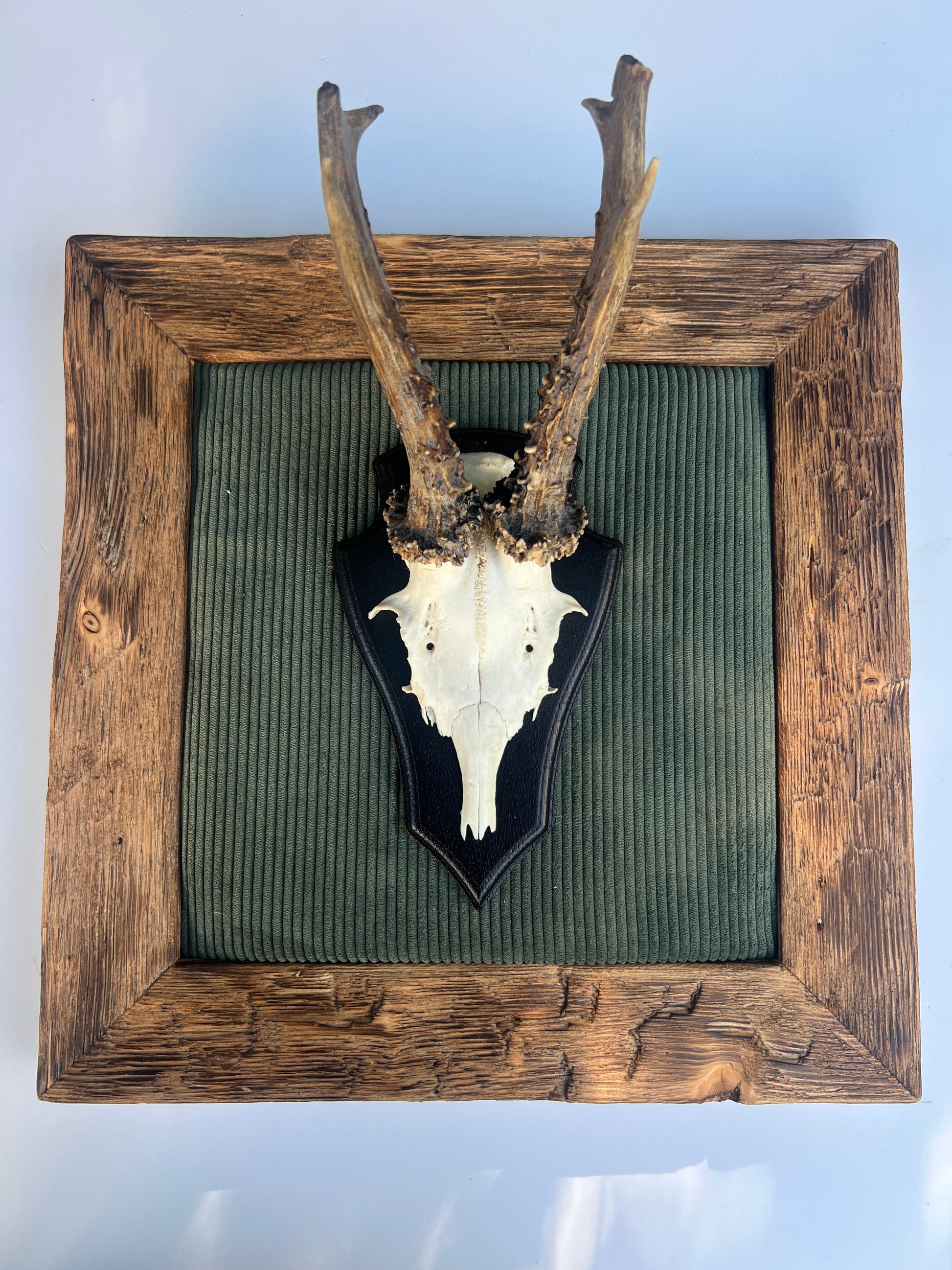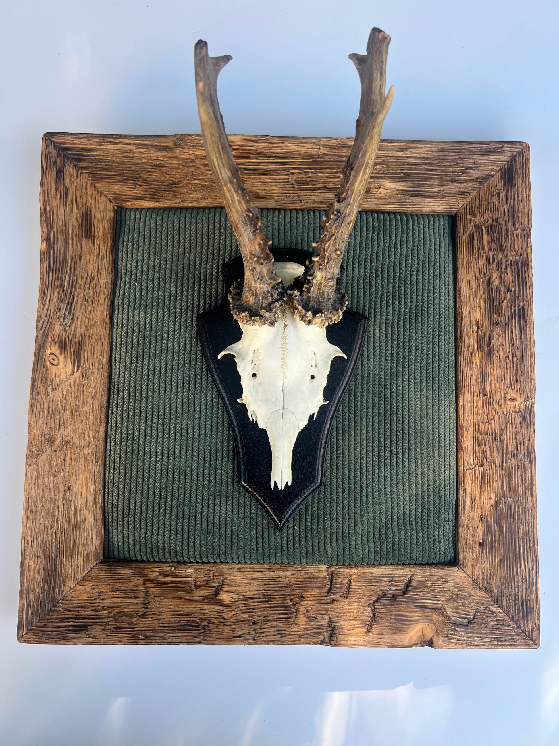 Für Jägerinnen und Jäger ist das Bild auch ohne Gehörn erhältlich – die eigene Trophäe wird an einer Schraube (ist bereits auf dem Polster angebracht) auf dem mit Stoff bezogenem Polster eingehängt.