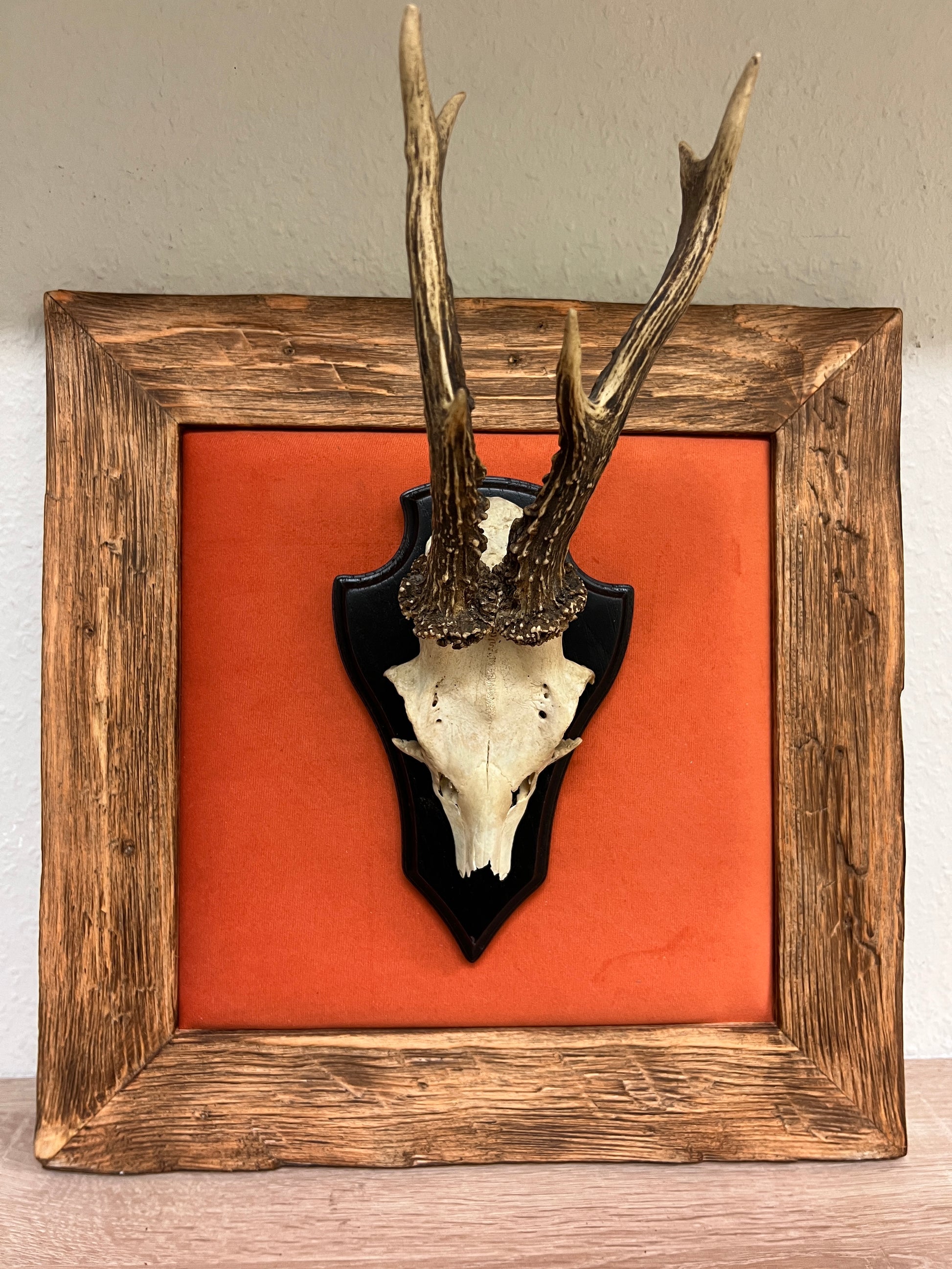 Hinweis für Jägerinnen und Jäger: Das Geweihbild wirkt sehr harmonisch, wenn ein Trophäenbrett in der Größe 13cm x 21 cm verwendet wird.