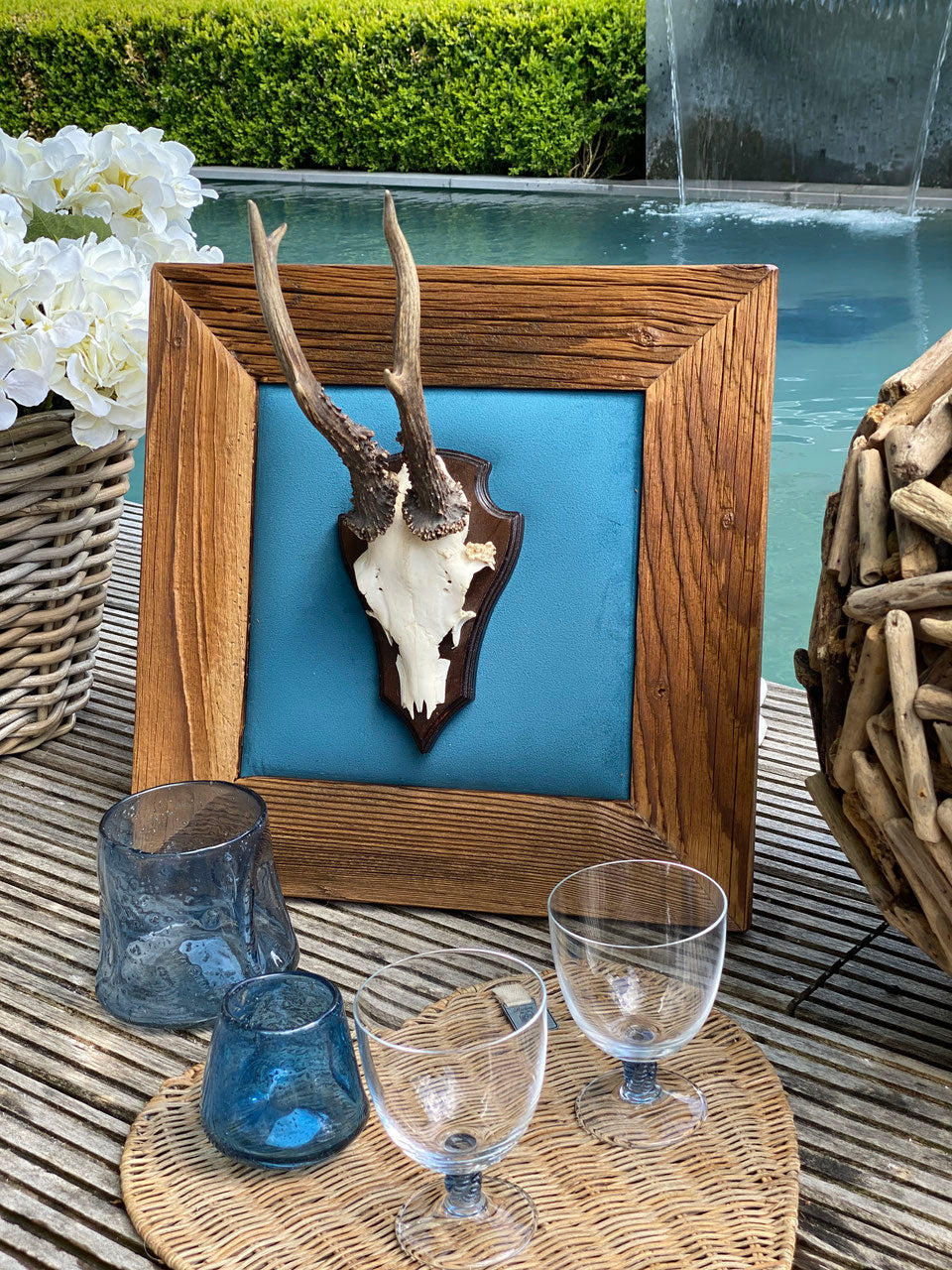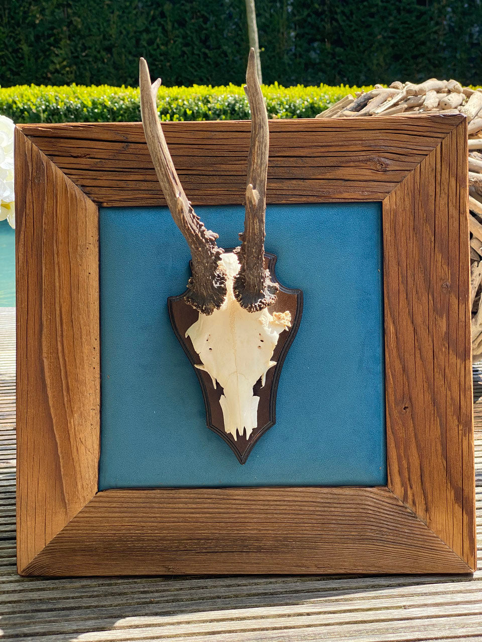 Das Rehgehörn auf Trophäenbrett ist aufgeschraubt.