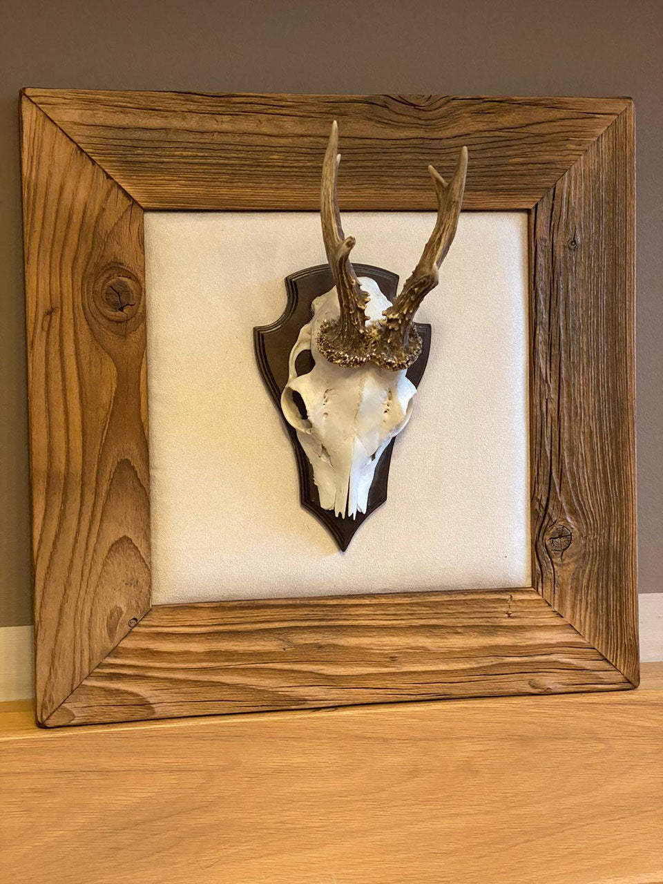 Für Jägerinnen und Jäger ist das Bild auch ohne Gehörn erhältlich – die eigene Trophäe wird an einer Schraube (ist bereits auf dem Polster angebracht) auf dem mit Stoff bezogenem Polster eingehängt.