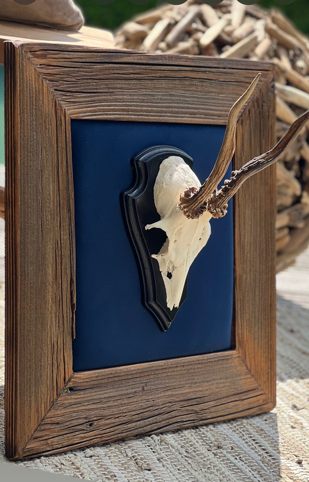 Dieses handgefertigte Bild mit echtem Rehgehörn verbindet alpine Tradition mit modernem Design und schafft so einen einzigartigen Blickfang im Chalet-Stil.