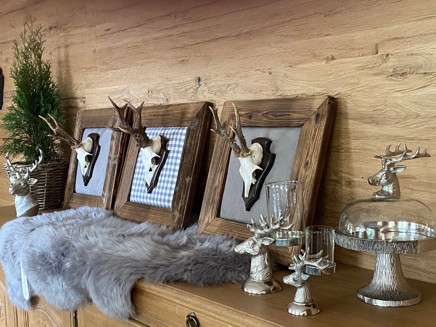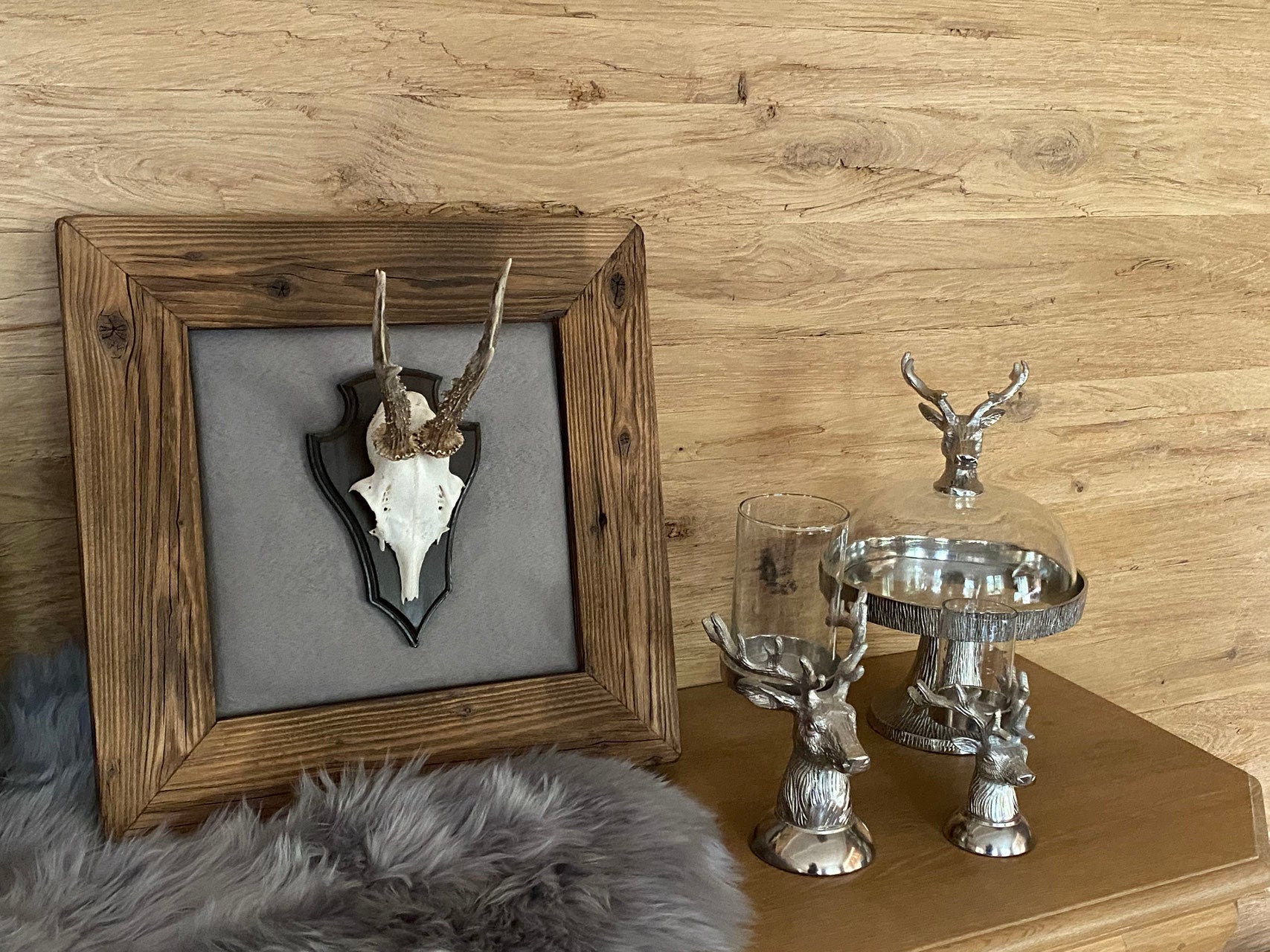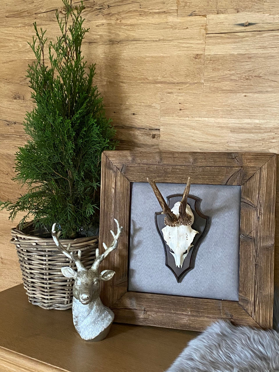 Dieses handgefertigte Bild mit echtem Rehgehörn verbindet alpine Tradition mit modernem Design und schafft so einen einzigartigen Blickfang im Chalet-Stil.