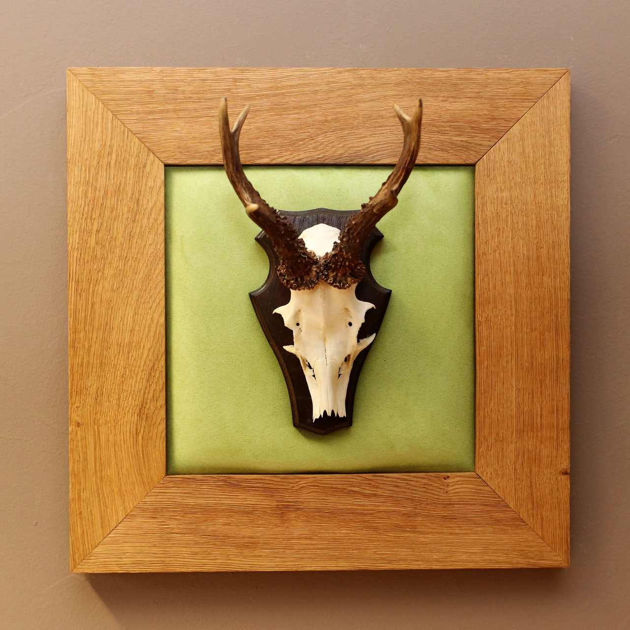Das Rehgehörn auf Trophäenbrett ist aufgeschraubt.