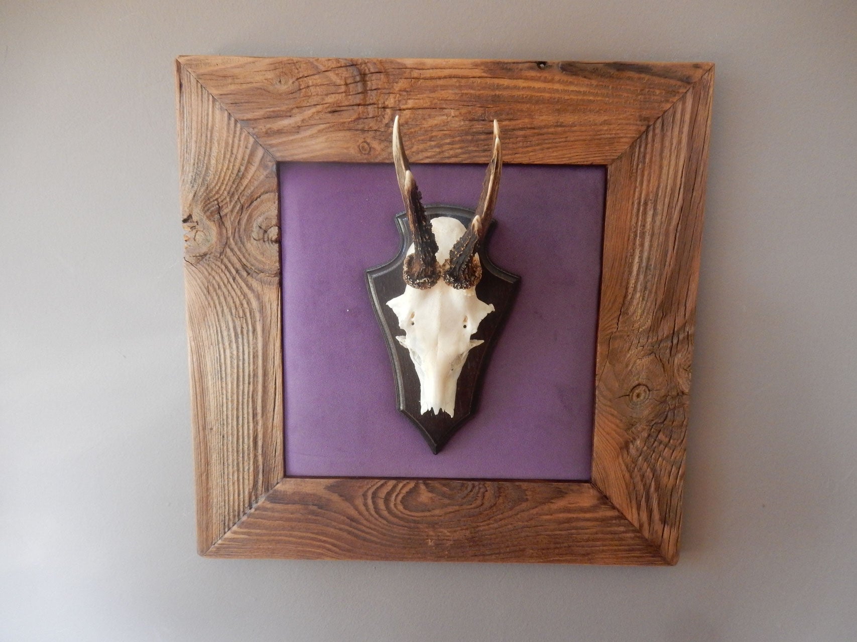Für Jägerinnen und Jäger ist das Bild auch ohne Gehörn erhältlich – die eigene Trophäe wird an einer Schraube (ist bereits auf dem Polster angebracht) auf dem mit Stoff bezogenem Polster eingehängt.