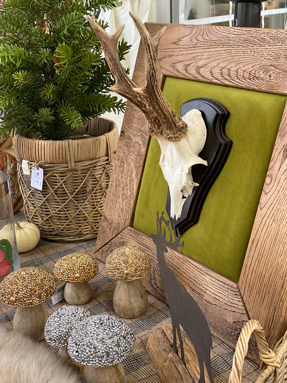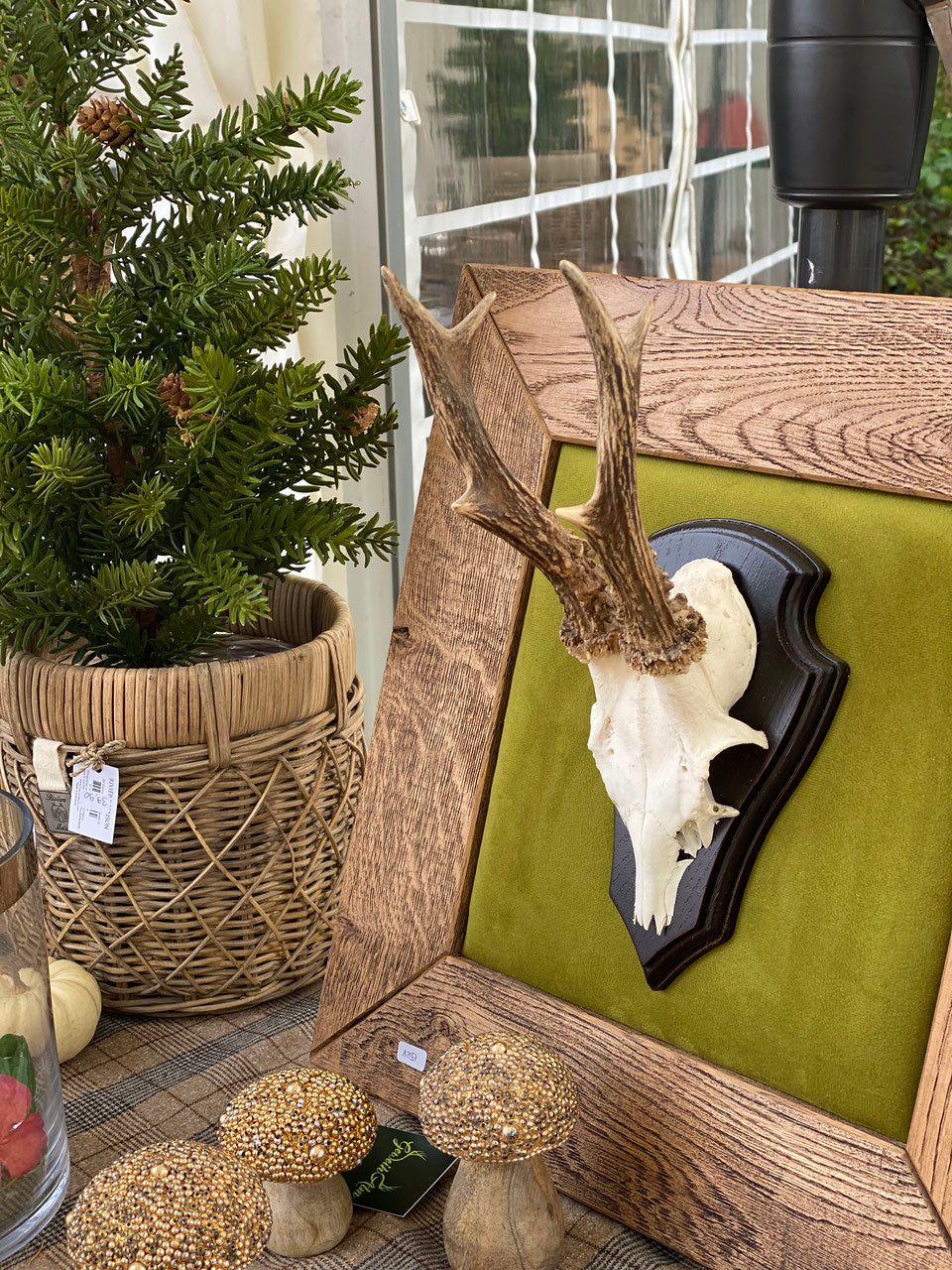 Dieses handgefertigte Bild mit echtem Rehgehörn verbindet alpine Tradition mit modernem Design und schafft so einen einzigartigen Blickfang im Chalet-Stil.