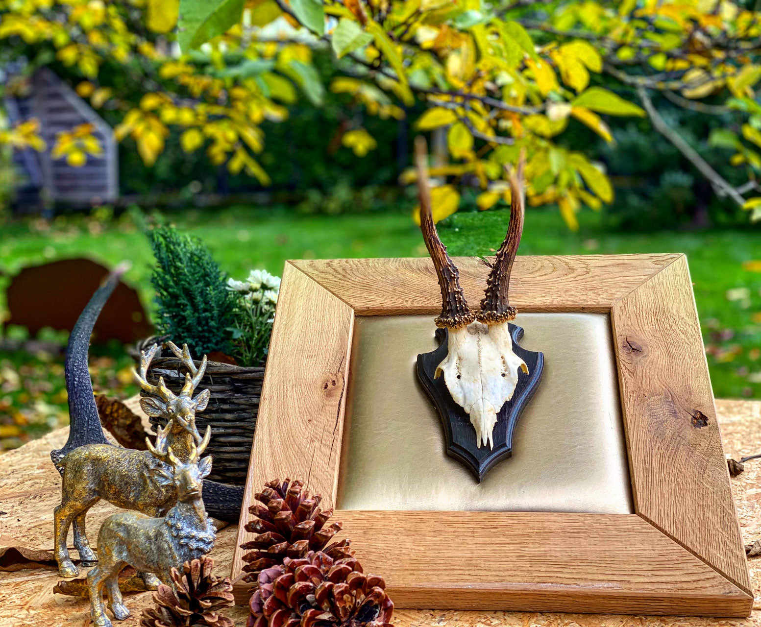 Das Rehgehörn auf Trophäenbrett ist aufgeschraubt.