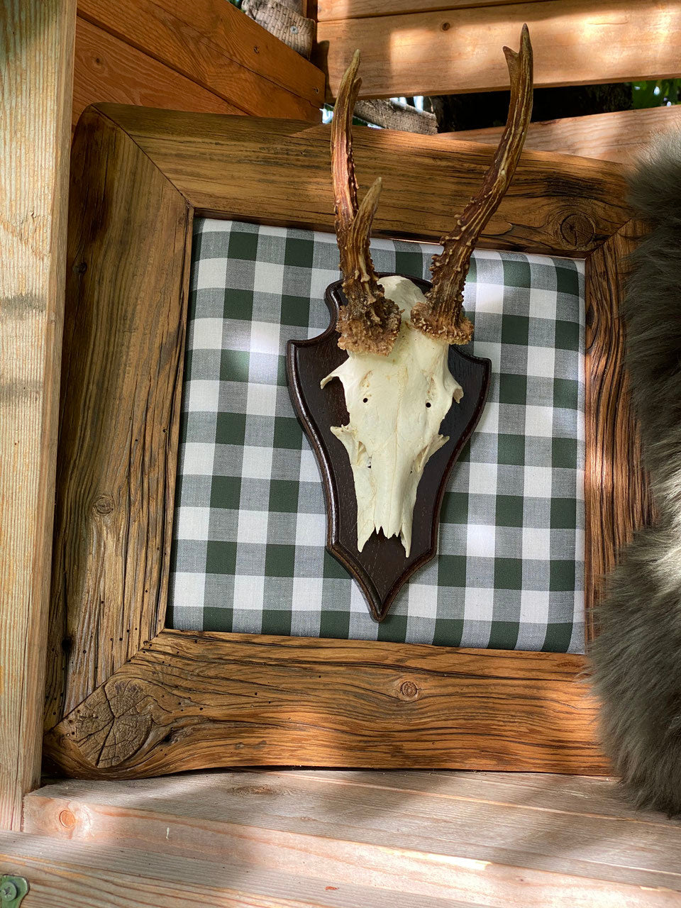 Dieses handgefertigte Bild mit echtem Rehgehörn verbindet alpine Tradition mit modernem Design und schafft so einen einzigartigen Blickfang im Chalet-Stil.