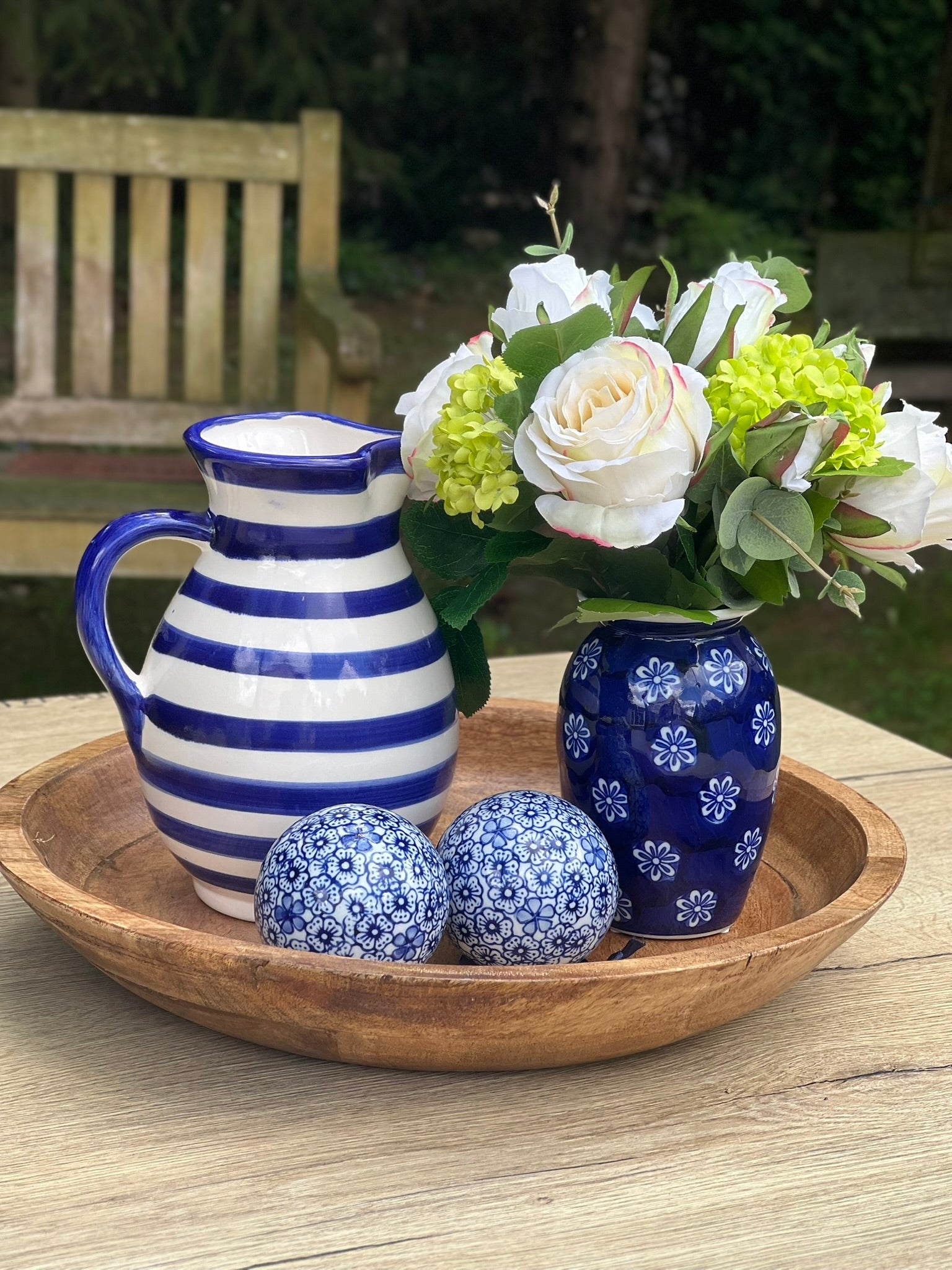 Sie bestehen aus einem handgetöpferten und handbemalten Krug, einer süßen Porzellanvase mit Streublumendesign, sowie 2 Porzellankugeln, ebanfalls mit Blumendesign. Der Blumenstrauß aud Kunstblumen wurde liebevoll von uns gebunden. Alle Teile sind perfekt aufeinander abgestimmt und können auf einer massiven Holzschale arrangiert, werden um einen harmonischen Look zu kreieren.
