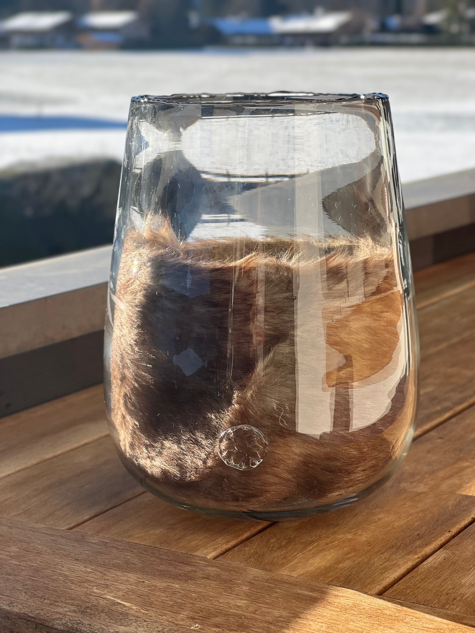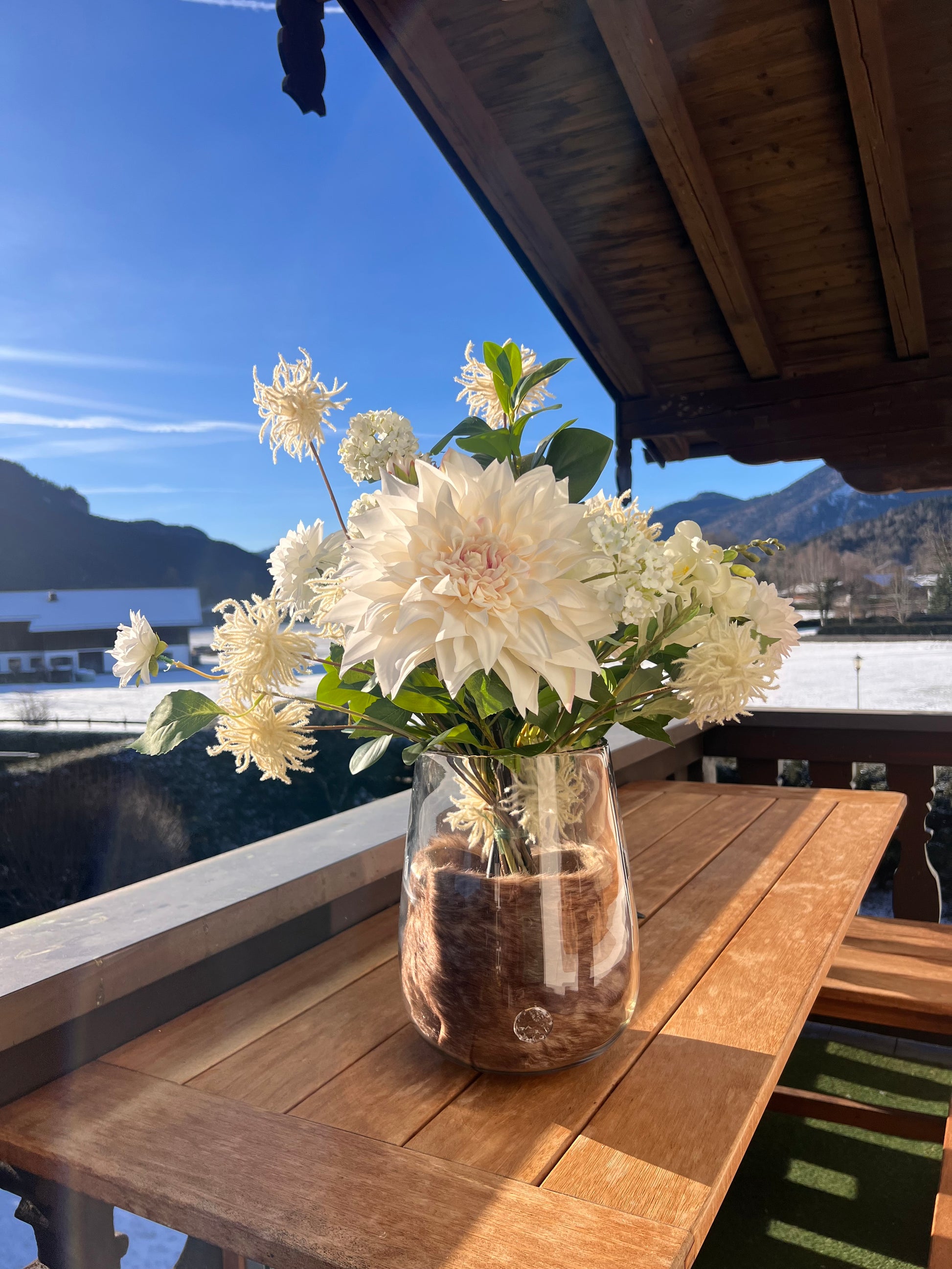 Die weißen und cremefarbenen Blumen werden durch bezaubernde beige Blüten ergänzt, die wie Schneeflocken aussehen. Genieße die hochwertige und luxuriöse Atmosphäre, die dieser Strauß ausstrahlt. Wähle zwischen dem Strauß allein oder zusammen mit einer eleganten Vase, die mit passendem Kunstfell im alpinen Winterlook ausgelegt (herausnehmbar ) ist.