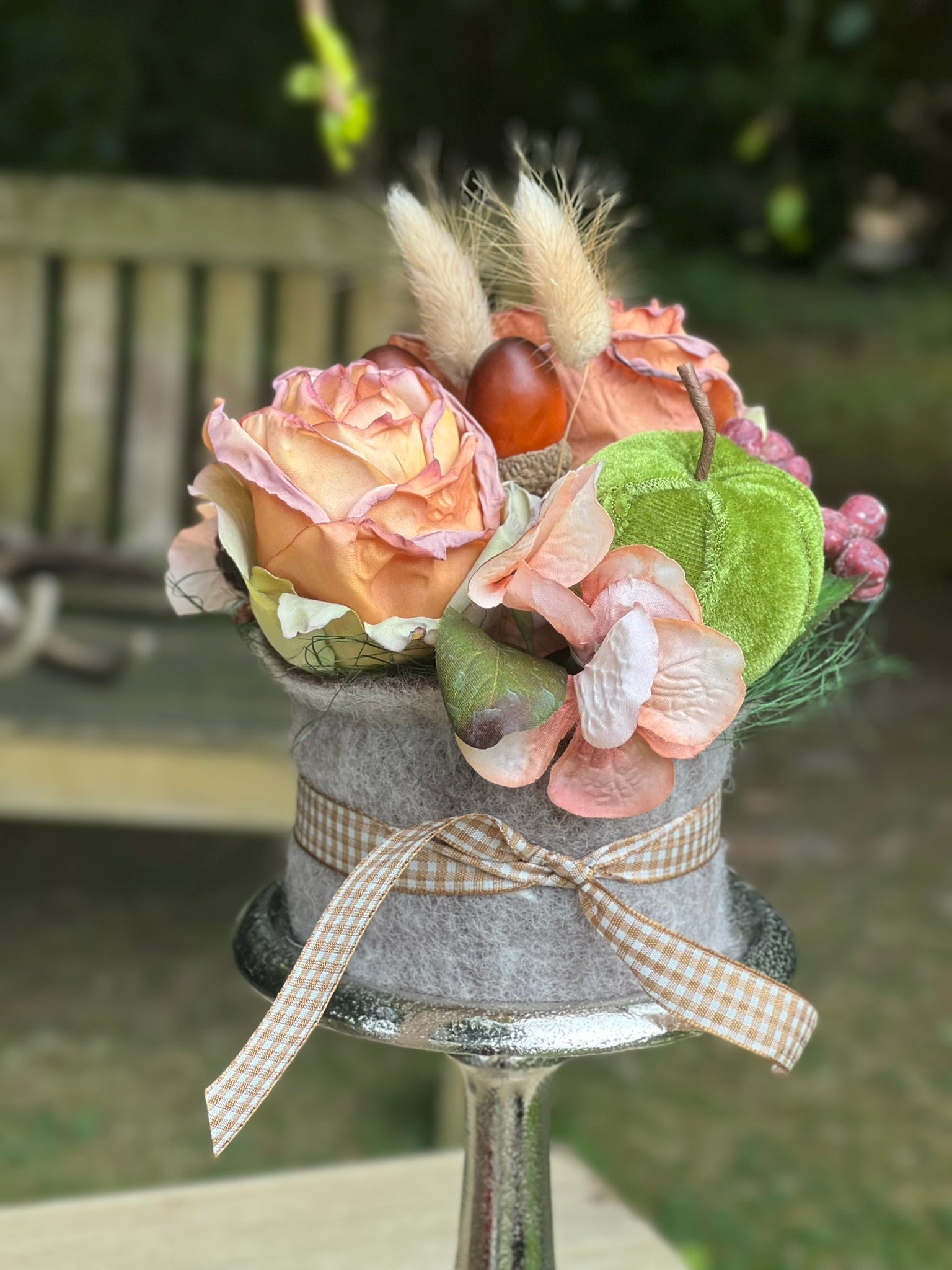 Das Blumentörtchen Herbstzauber ist eine perfekte Ergänzung für Ihre herbstliche Dekoration. Die Kunstblumen sind sehr hochwertig sehen täuschend echt aus, mit Rosen, die wie eingetrocknet wirken, und Beeren, Samtapfelm und Blüten, die einen natürlichen und authentischen Look verleihen. Diese kunstvoll gestalteten Blumentörtchen sind ideal für diejenigen, die die Schönheit von Blumen ohne die Sorge um ihre Pflege genießen möchten.
