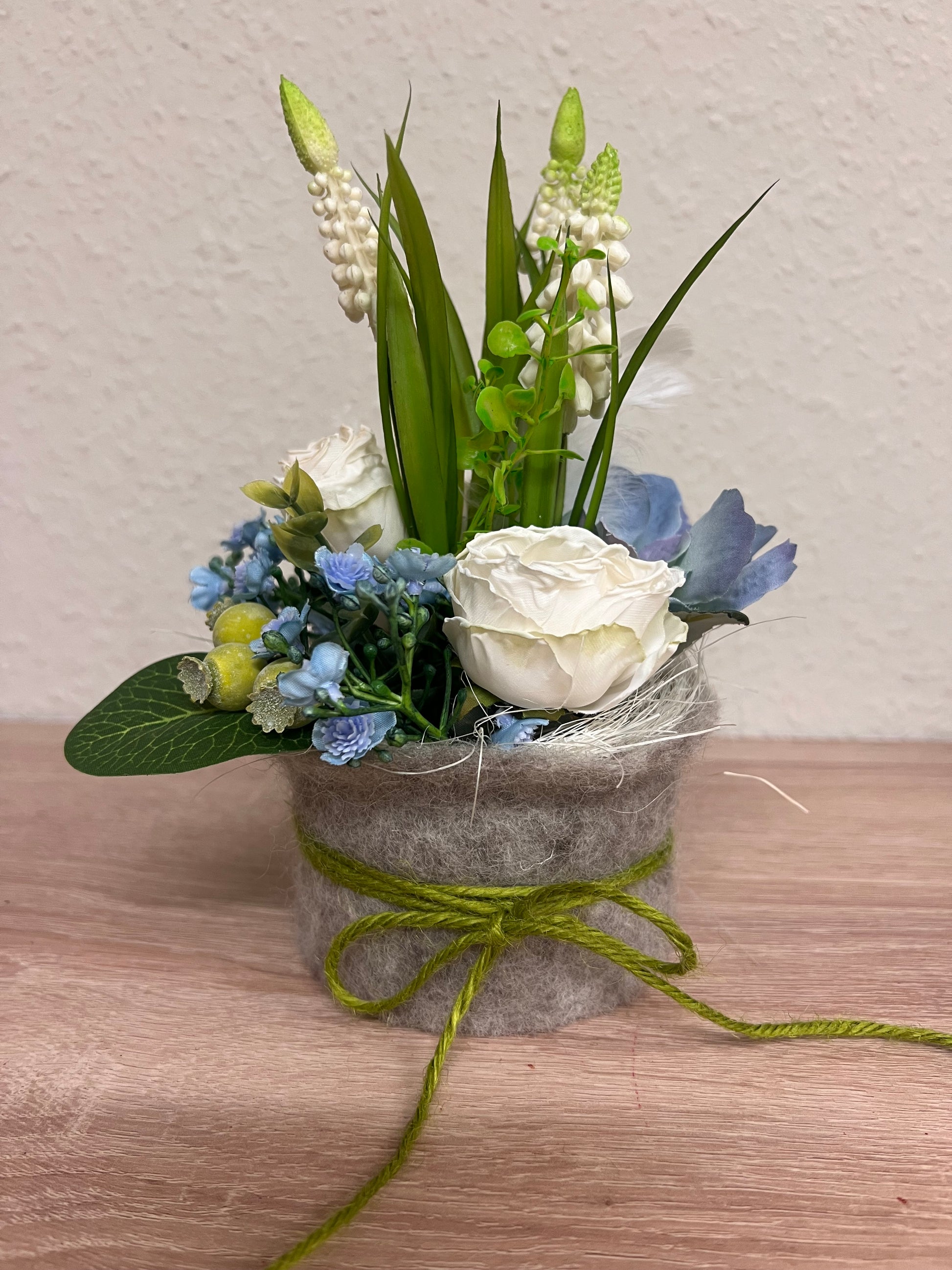 Wie ein frischer Morgen in den Bergen. Weiße Blüten, zarte Blautöne und sattes Grün vereinen sich zu einem harmonischen Frühlingsarrangement im weichen Filztopf. Umrahmt von Moos, Blattwerk und feinen Naturfasern entsteht ein Stück alpine Natürlichkeit für dein Zuhause.
