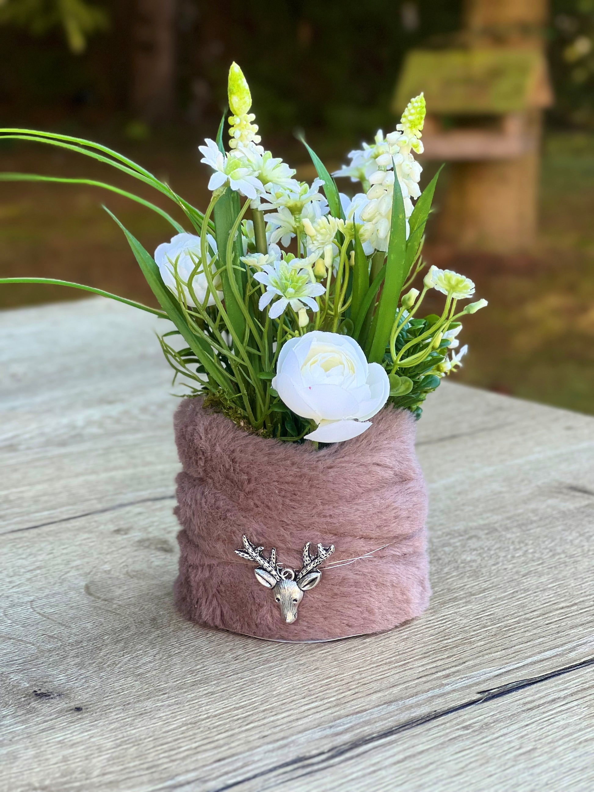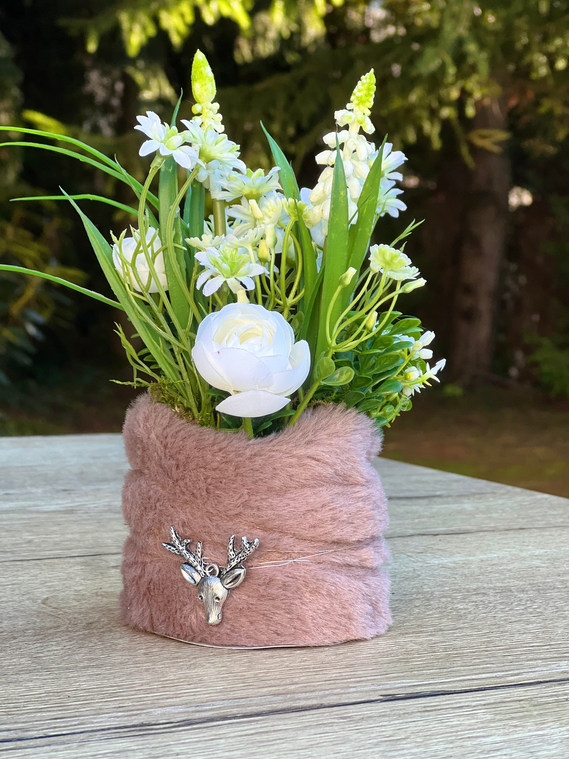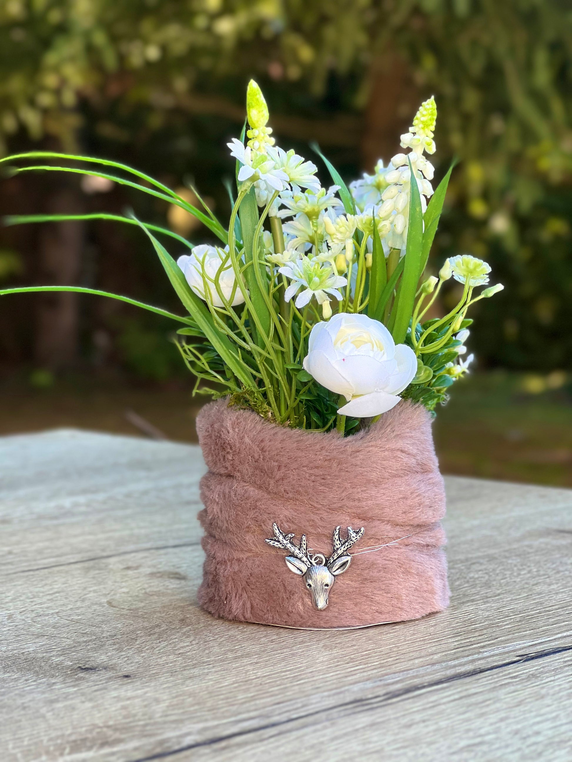 Das charmante Blumentörtchen im Fellkleid mit Hirschmedallion, besteht aus Traubenhyazinthen und grünen Zweigen und wird zum echten, alpinen Hingucker!