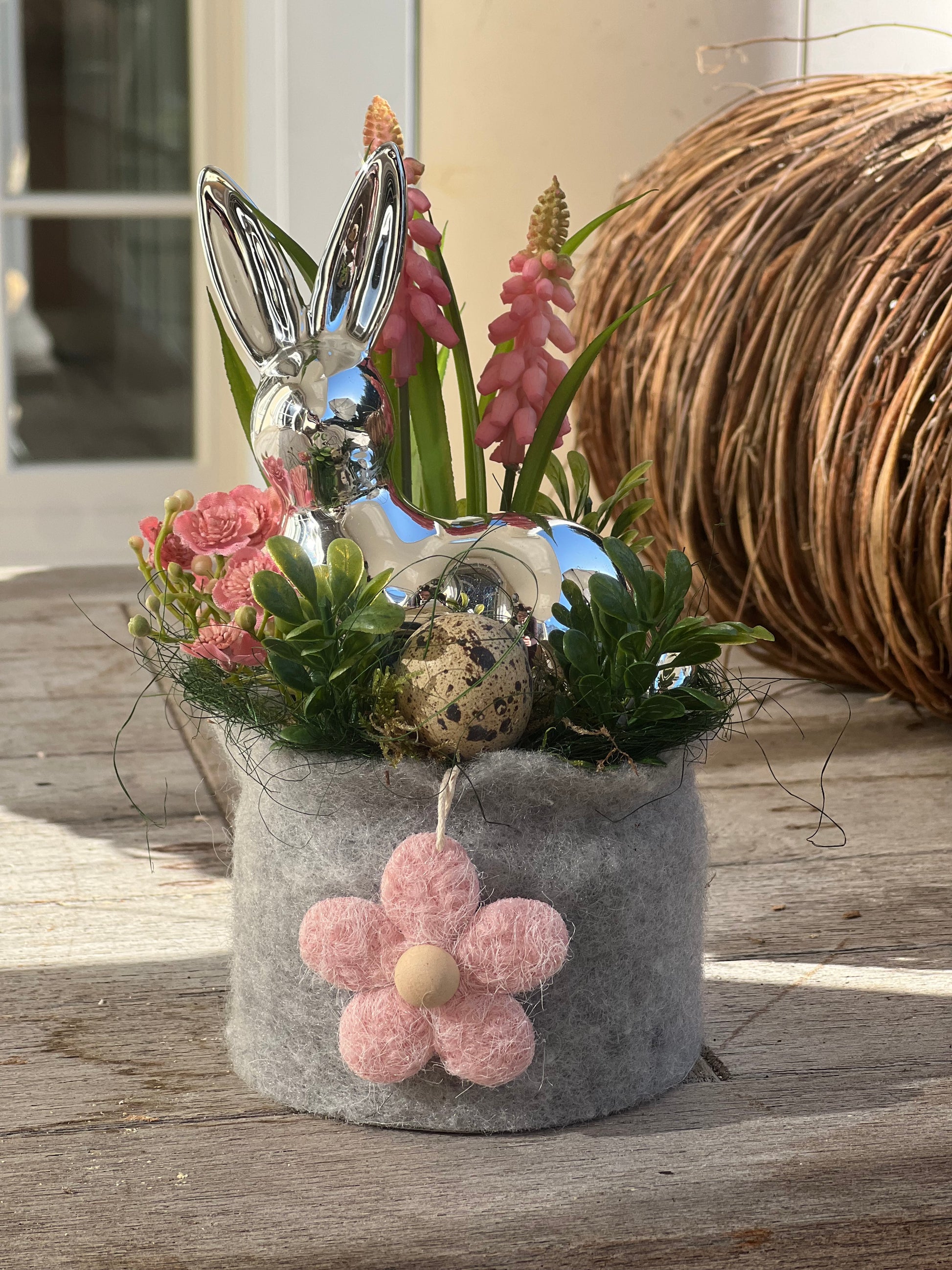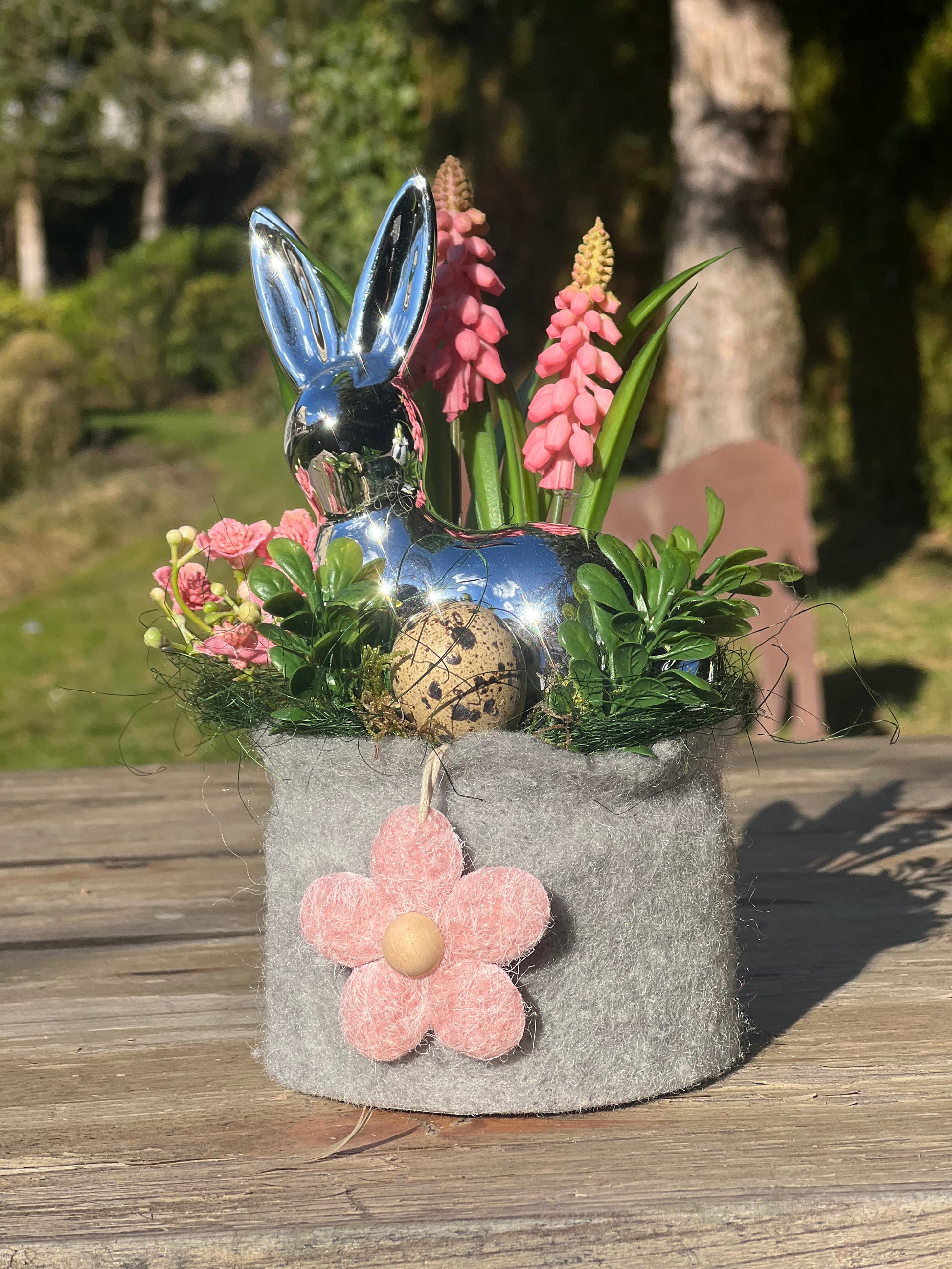 Der glänzende Silberhase sitzt eingebettet in frischem Grün, zarten rosafarbenen Blüten und einem hübschen Wachtelei – wie in einem kleinen Frühlingsnest. Der weiche Filzsockel in sanftem Grau erinnert an ein Törtchen und wird von einer liebevollen roséfarbenen Filzblume geschmückt.
