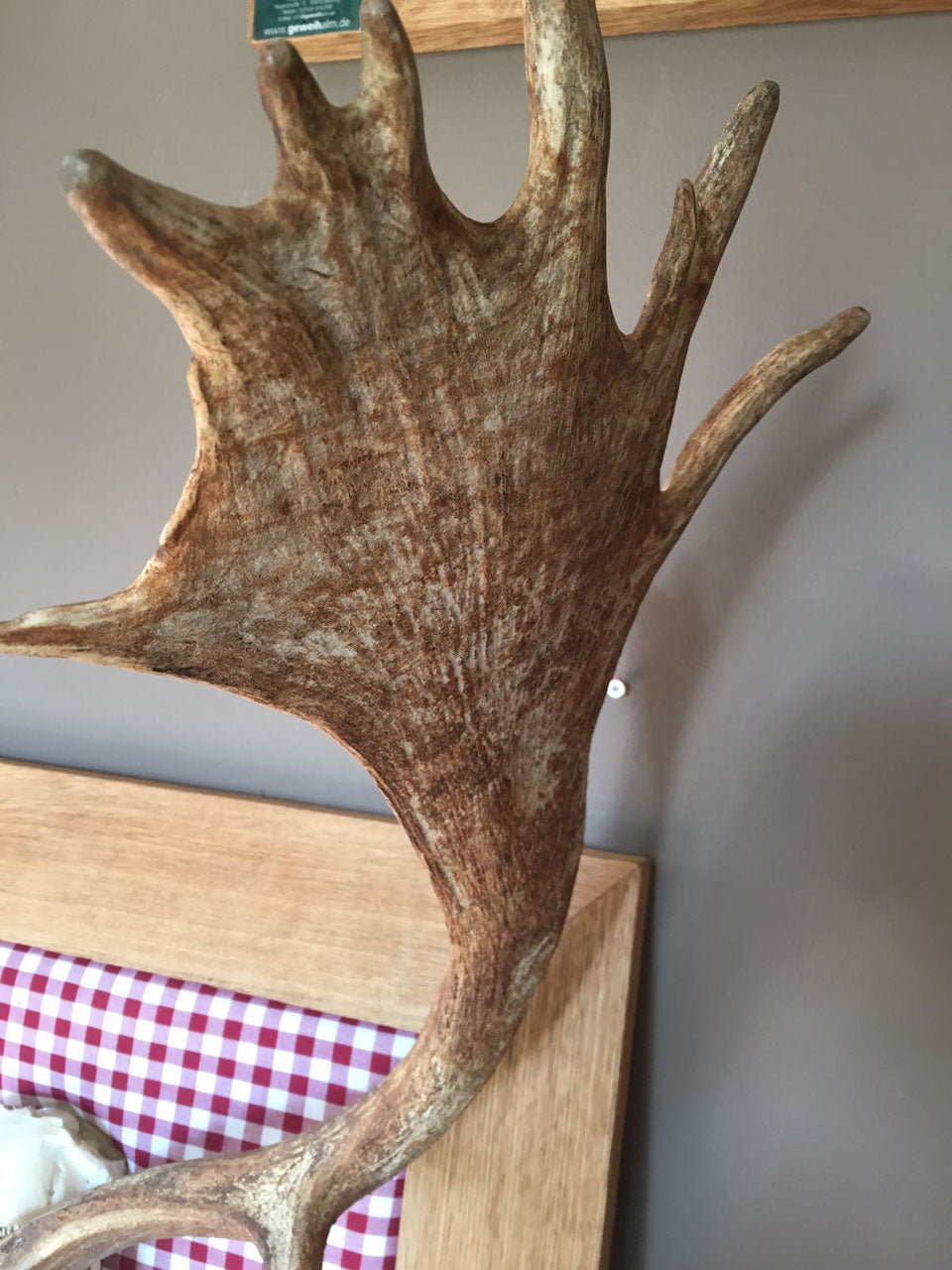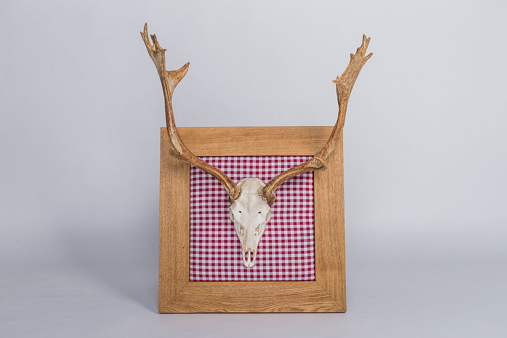 Das Bild besteht aus einer gepolsterten und mit Karostoff bezogenen Trägerplatte. Der umlaufende Rahmen ist aus massiver, gebürsteter und geölter Eiche und 10 cm breit.