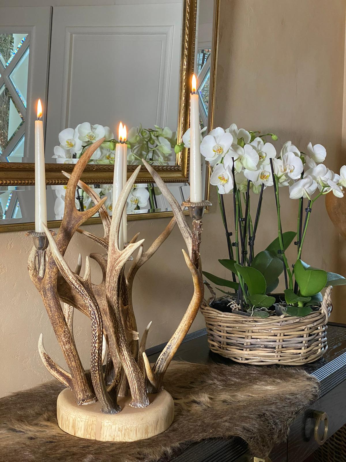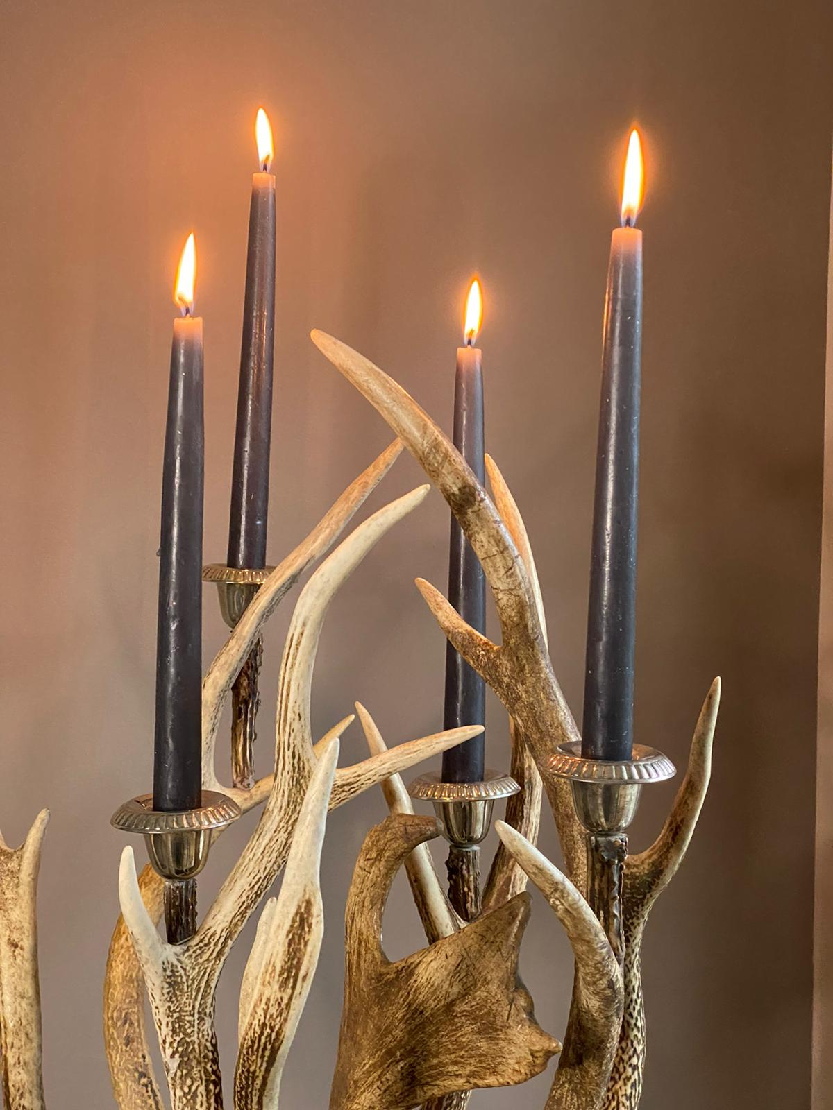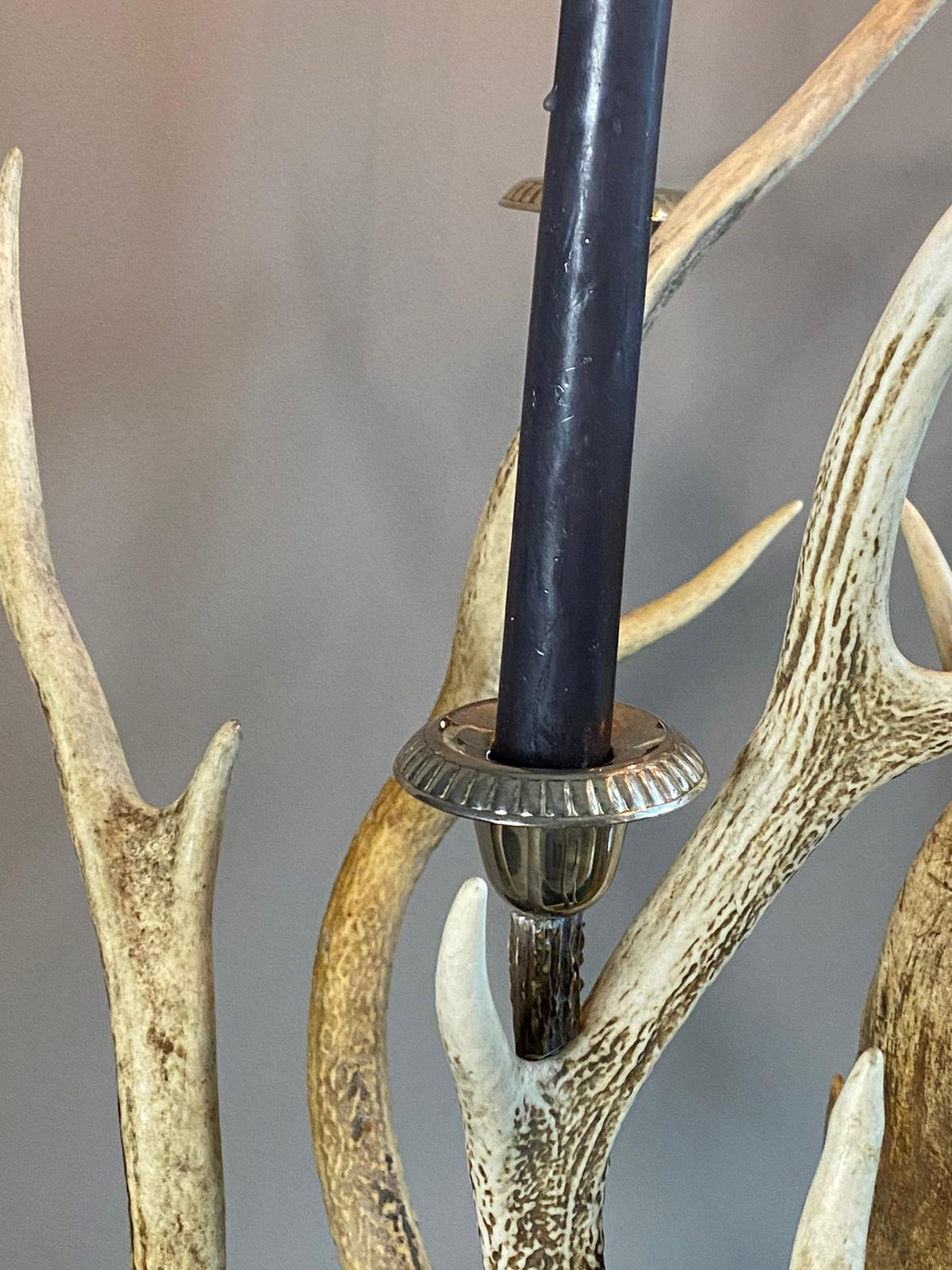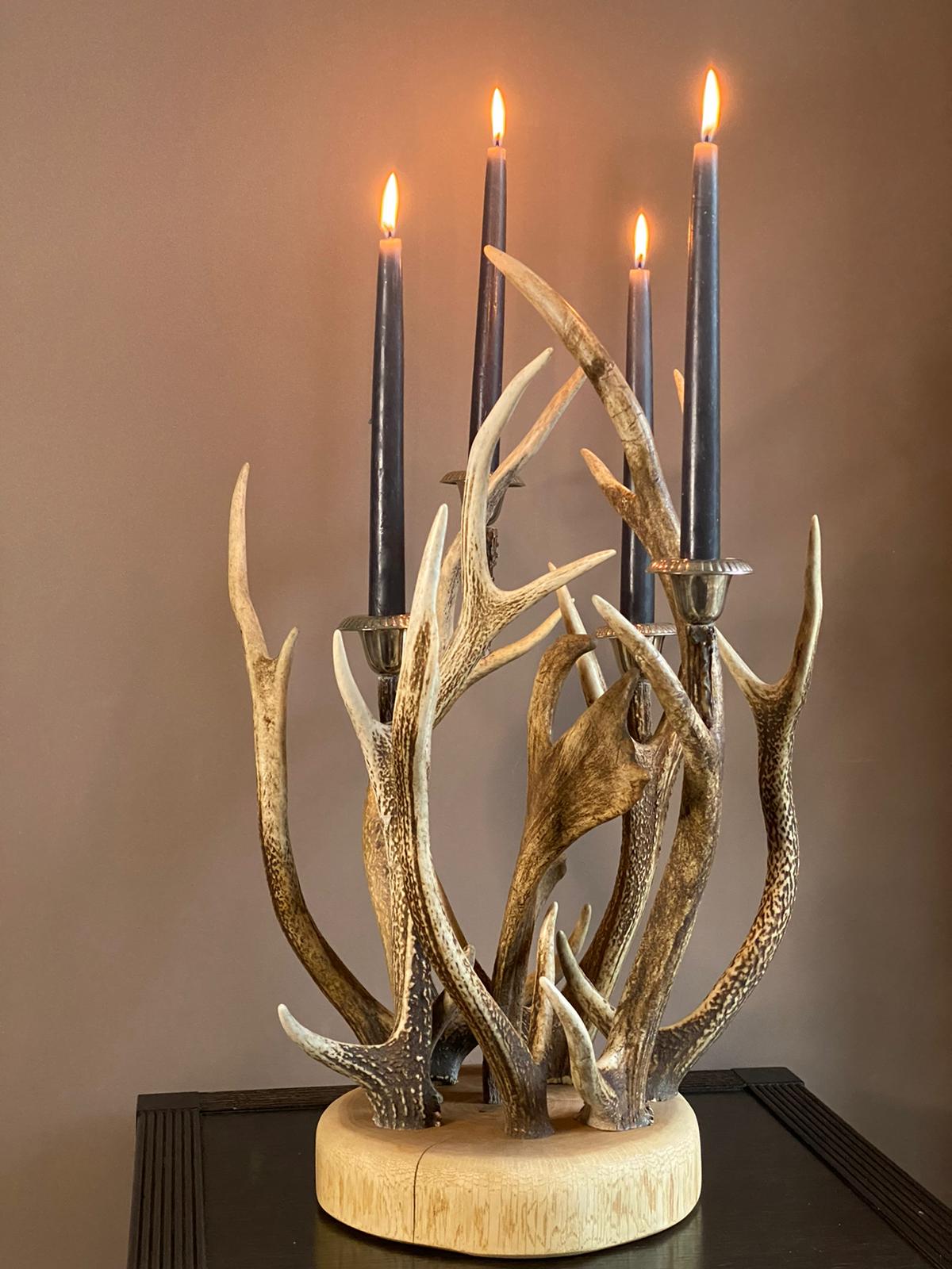 Eindrucksvoller Kerzenhalter aus mehreren Geweihstangen. Mit vier Kerzen und Holzplatte als Ständer.