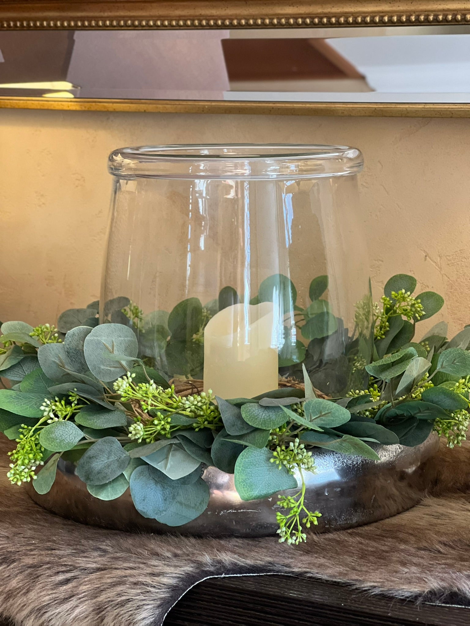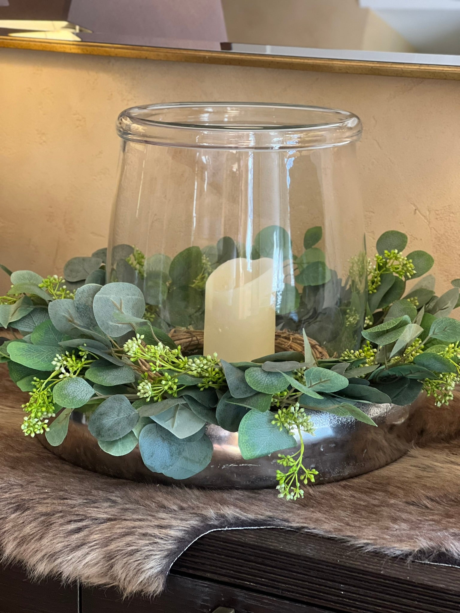 Elegante, massive Dekoschale aus Aluminium kombiniert mit einem unglaublich echt aussehenden Kranz aus Eukalyptuszweigen. Das natürlich wirkende Grün und die wunderschöne Meallschale bilden zusammen eine zeitlose Dekoration, die durch ein Windlicht ergänzt werden kann.