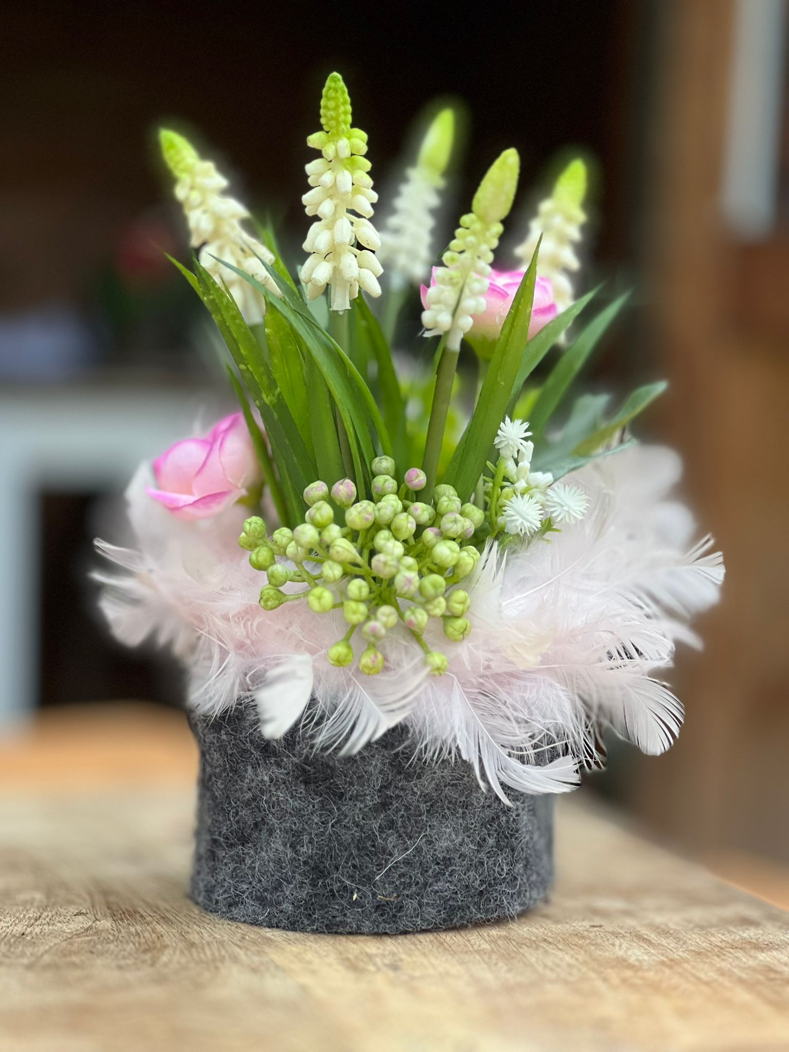 Die Filzmanschette und Schleife verleihen dem „Törtchen“ einen wunderbaren, alpinen Touch und der kleine Federkranz rundet das ganze perfekt ab.