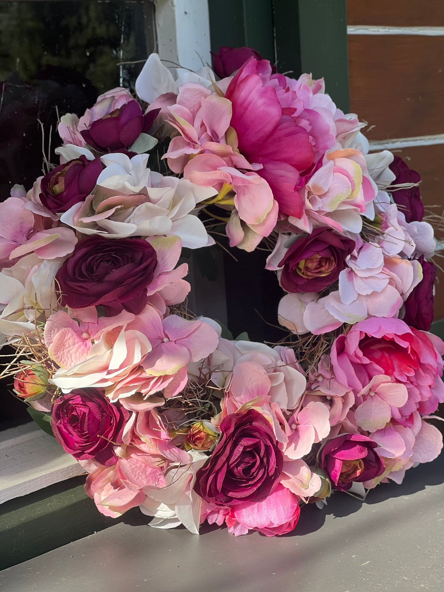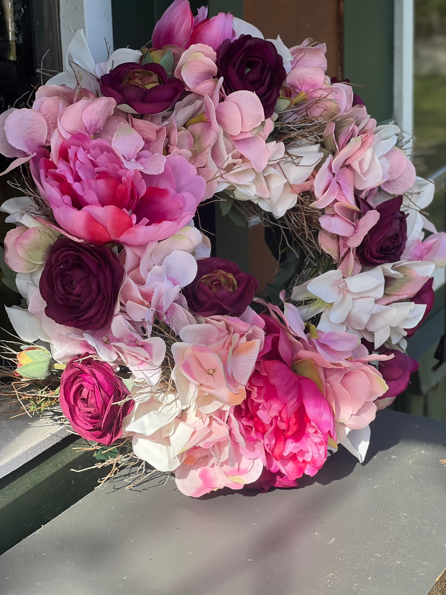 Die liebevoll arrangierten Blüten ( Hortensien, Pfingstrosen und Ranunkeln ergänzt durch Euphorbienzweige) bringen eine warme, natürliche Dekoration an deine Tür oder auf deinen Esstisch. Ein stilvoller Blickfang für die bevorstehende Frühlingszeit.