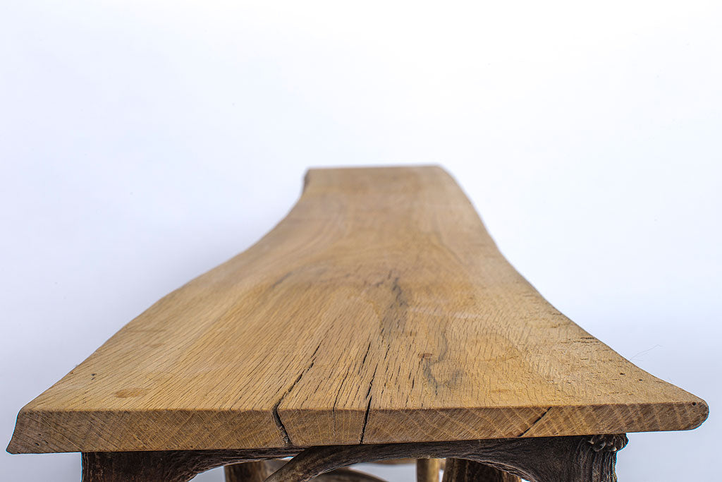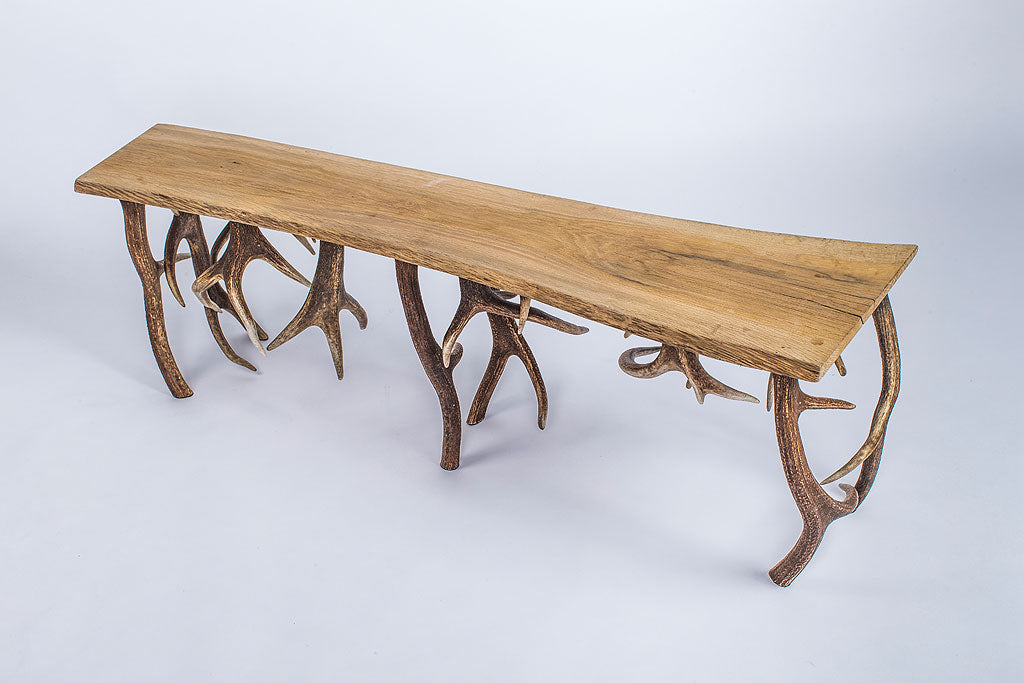 Die Geweihbank wird aus massivem Eichenholz und Geweihen in Handarbeit gefertigt. Sie ist zu