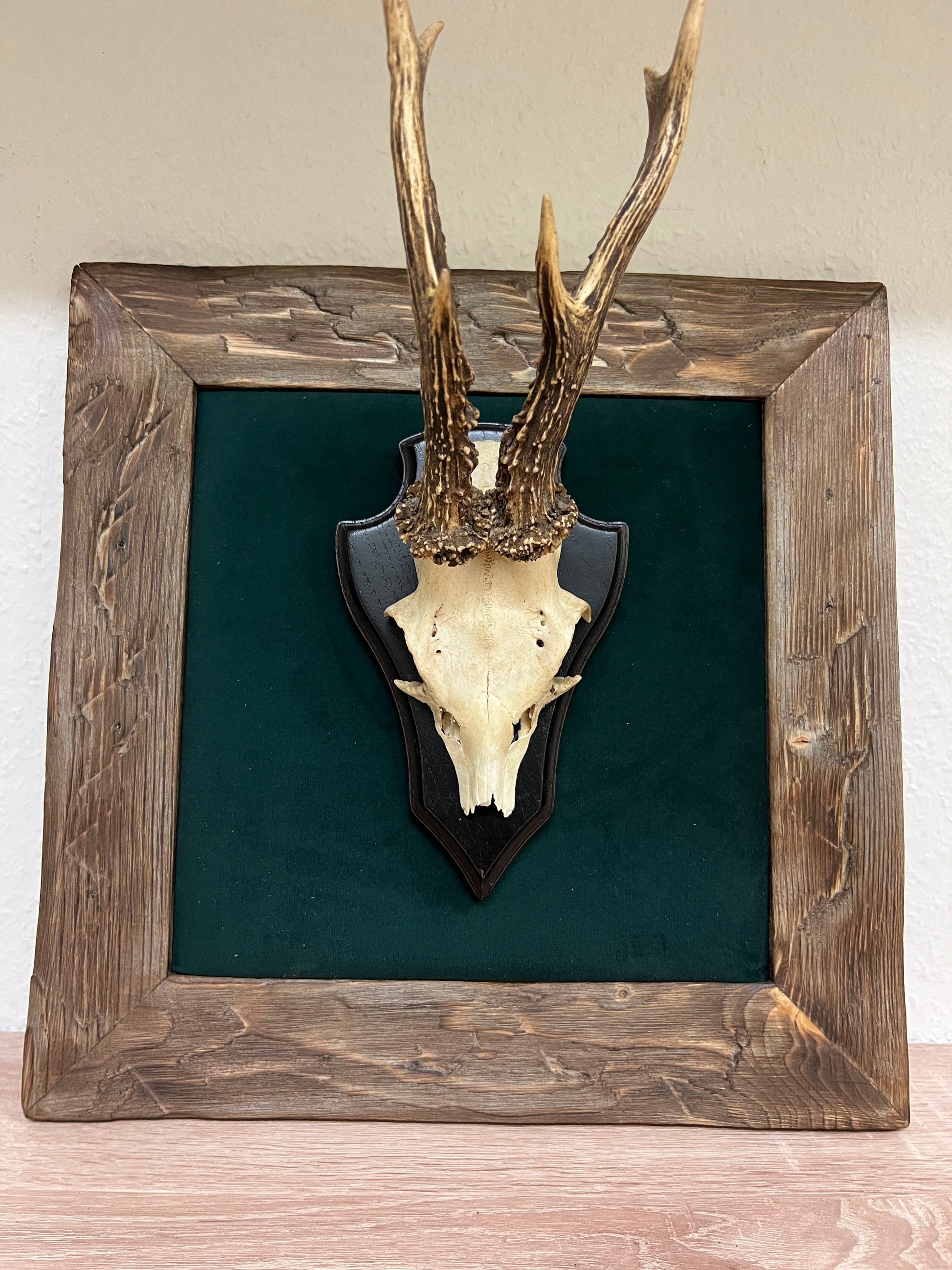 Dieses handgefertigte Bild mit echtem Rehgehörn verbindet alpine Tradition mit modernem Design und schafft so einen einzigartigen Blickfang im Chalet-Stil.