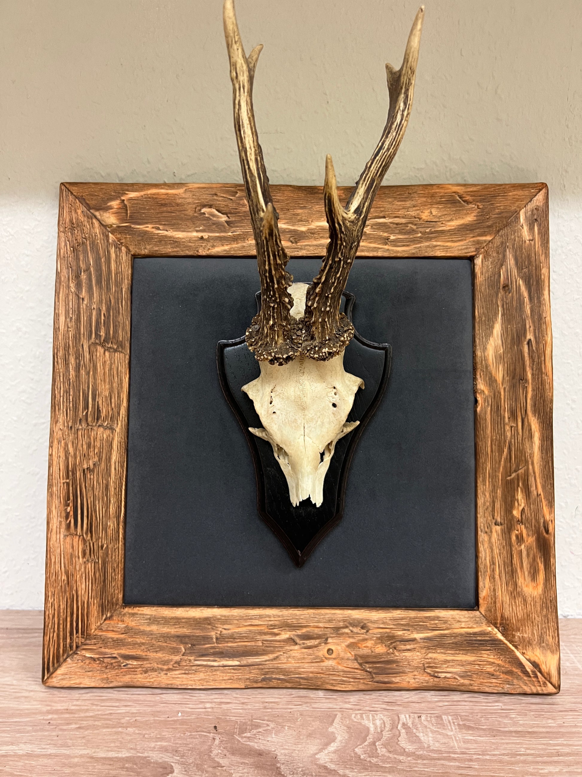 Dieses handgefertigte Bild mit echtem Rehgehörn verbindet alpine Tradition mit modernem Design und schafft so einen einzigartigen Blickfang im Chalet-Stil.