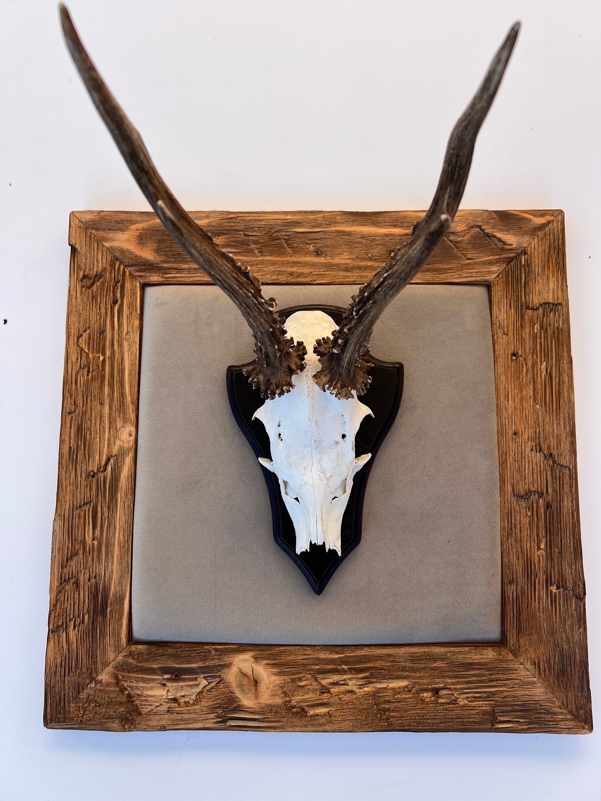 Dieses handgefertigte Bild mit echtem Rehgehörn verbindet alpine Tradition mit modernem Design und schafft so einen einzigartigen Blickfang im Chalet-Stil.