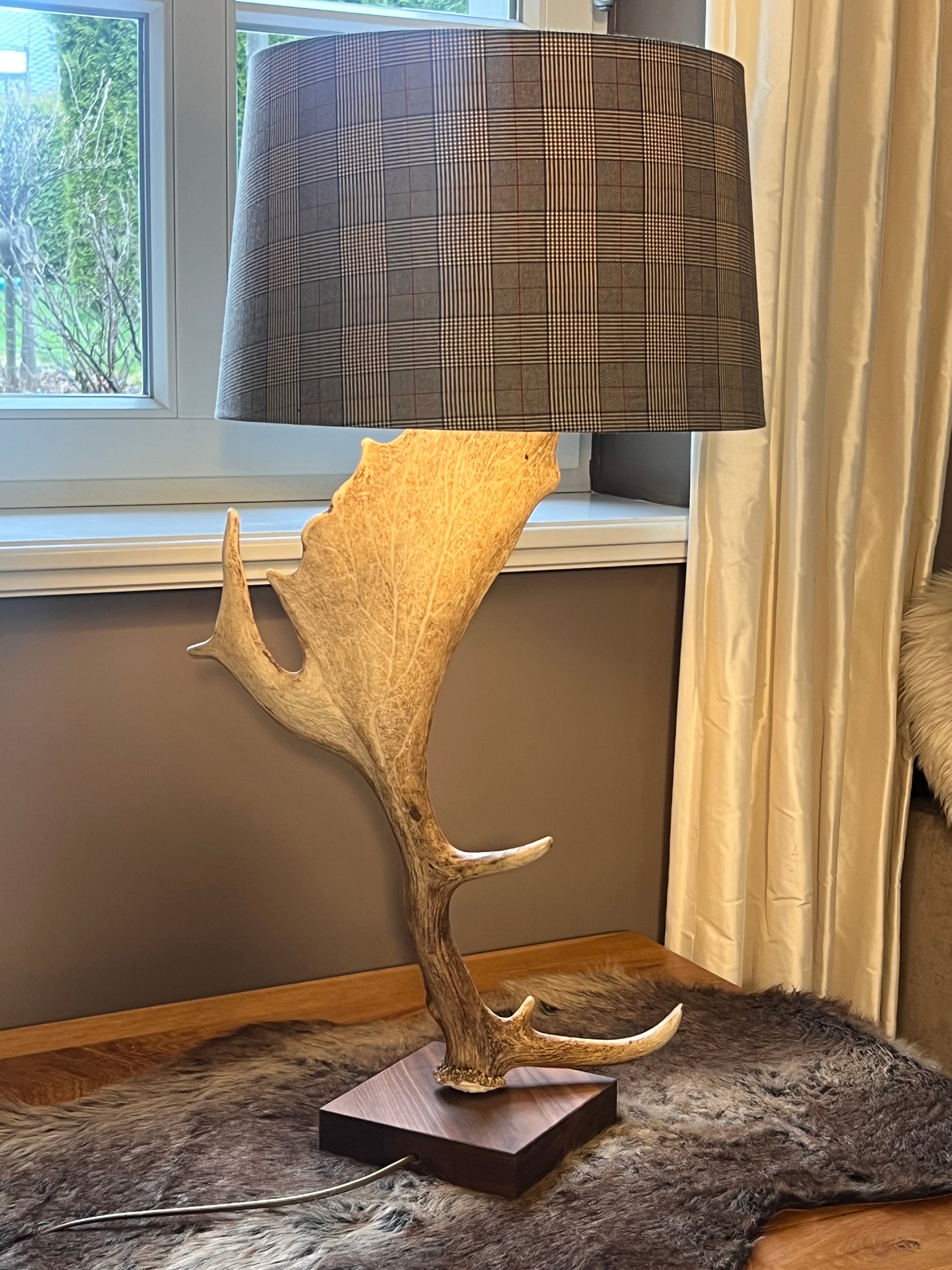 Unsere Geweihlampe mit Karoschirm ist ein echtes Unikat für dein Zuhause. Das natürliche Damhirschgeweih verbindet alpine Tradition mit modernem Design – ein Statement-Piece, das auf jedem Sideboard oder Bestelltisch sofort ins Auge fällt. Die Kombination aus rustikalem Material und elegantem Karostoff schafft eine wunderbar gemütliche Atmosphäre. Handgefertigt und zeitlos schön.
