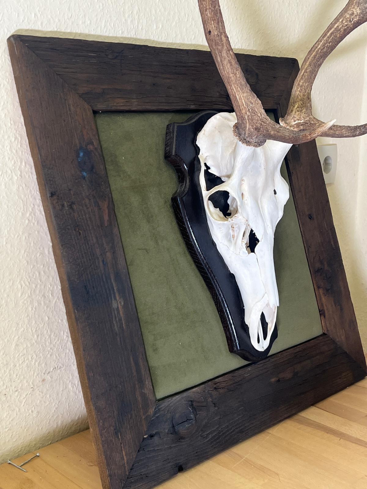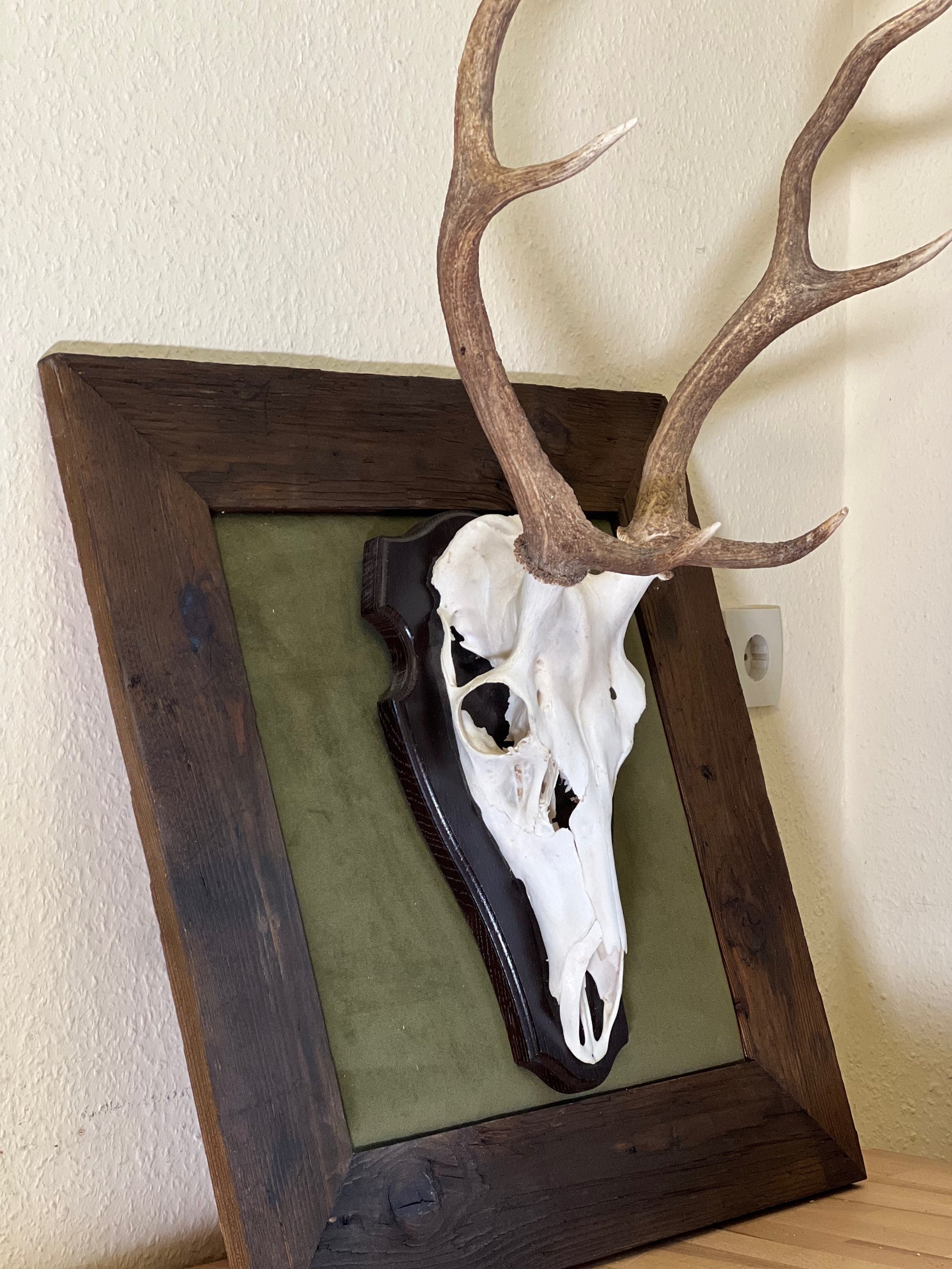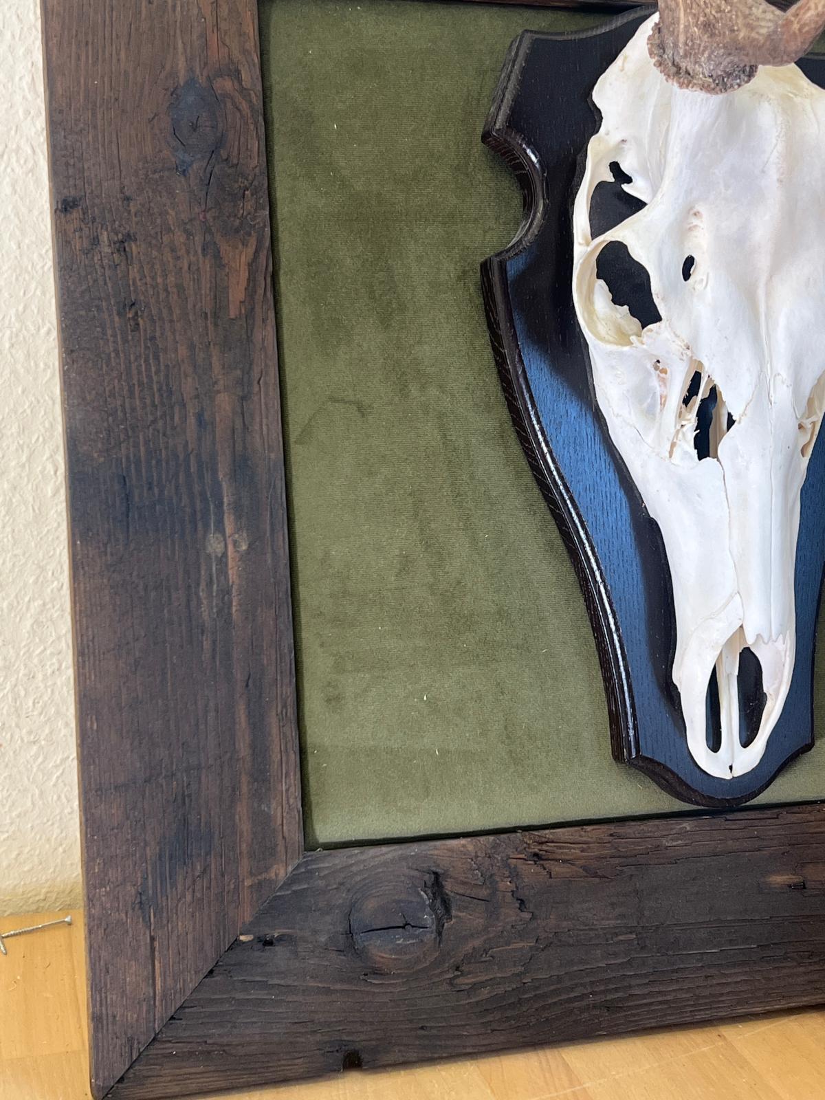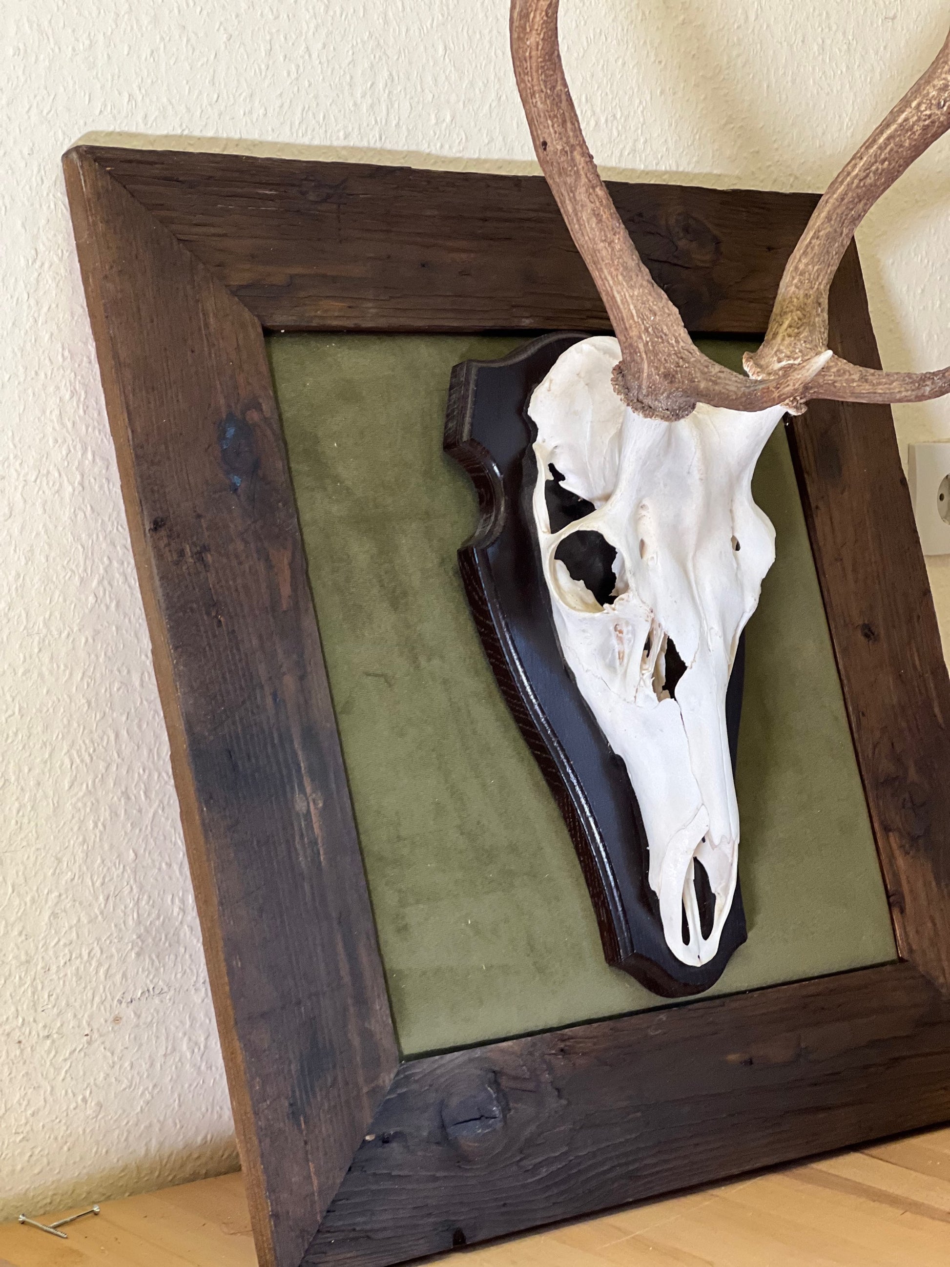 Die Gehörne werden aufgeschraubt. Das Bild kann aber auch ohne Trophäen bestellt werden. Die Auswahl an Stoffen und Farben für die Trägerplatte ist vielfältig. Solltest du dir bei deiner Wahl nicht so sicher sein, schreib uns einfach an.