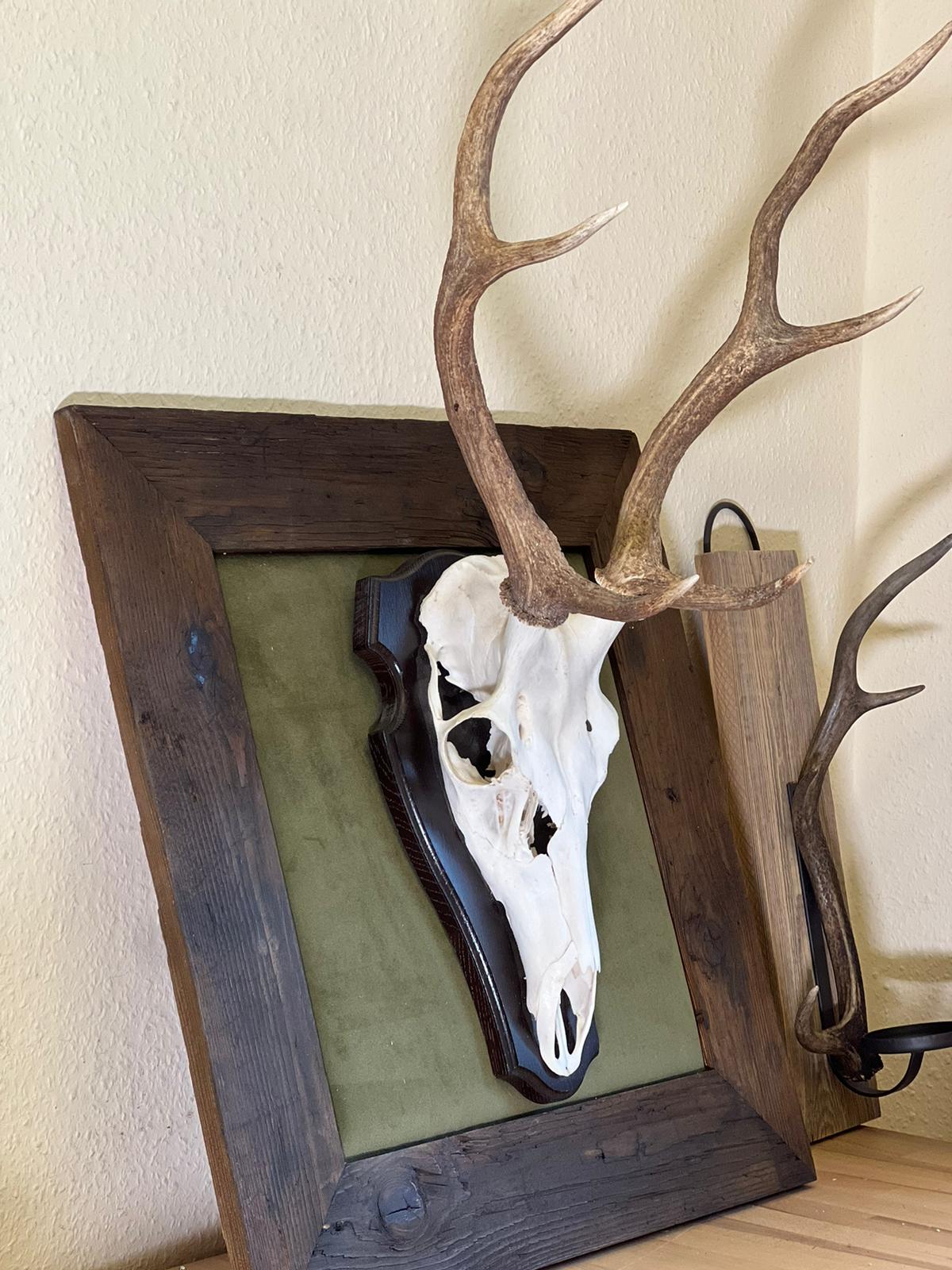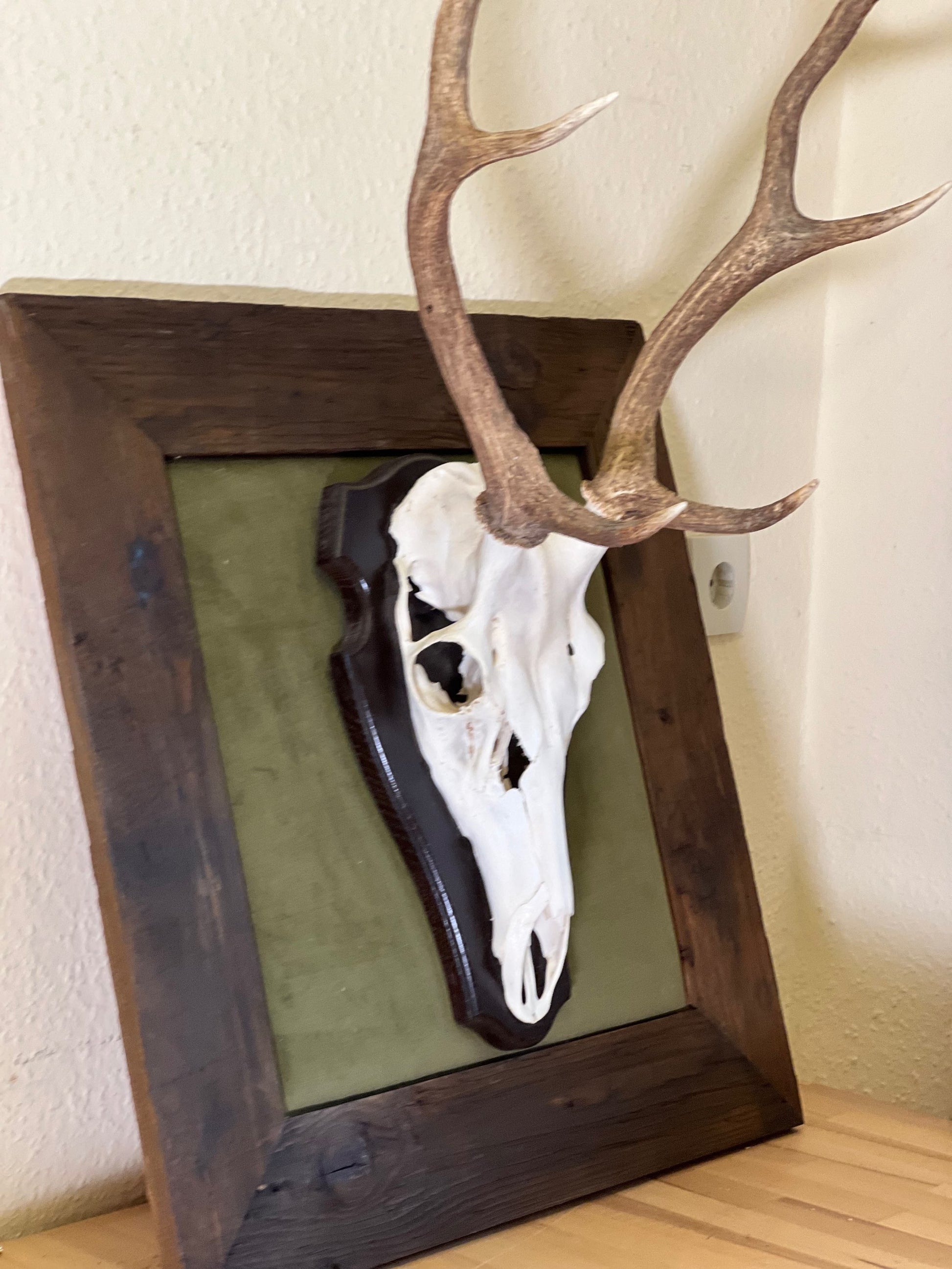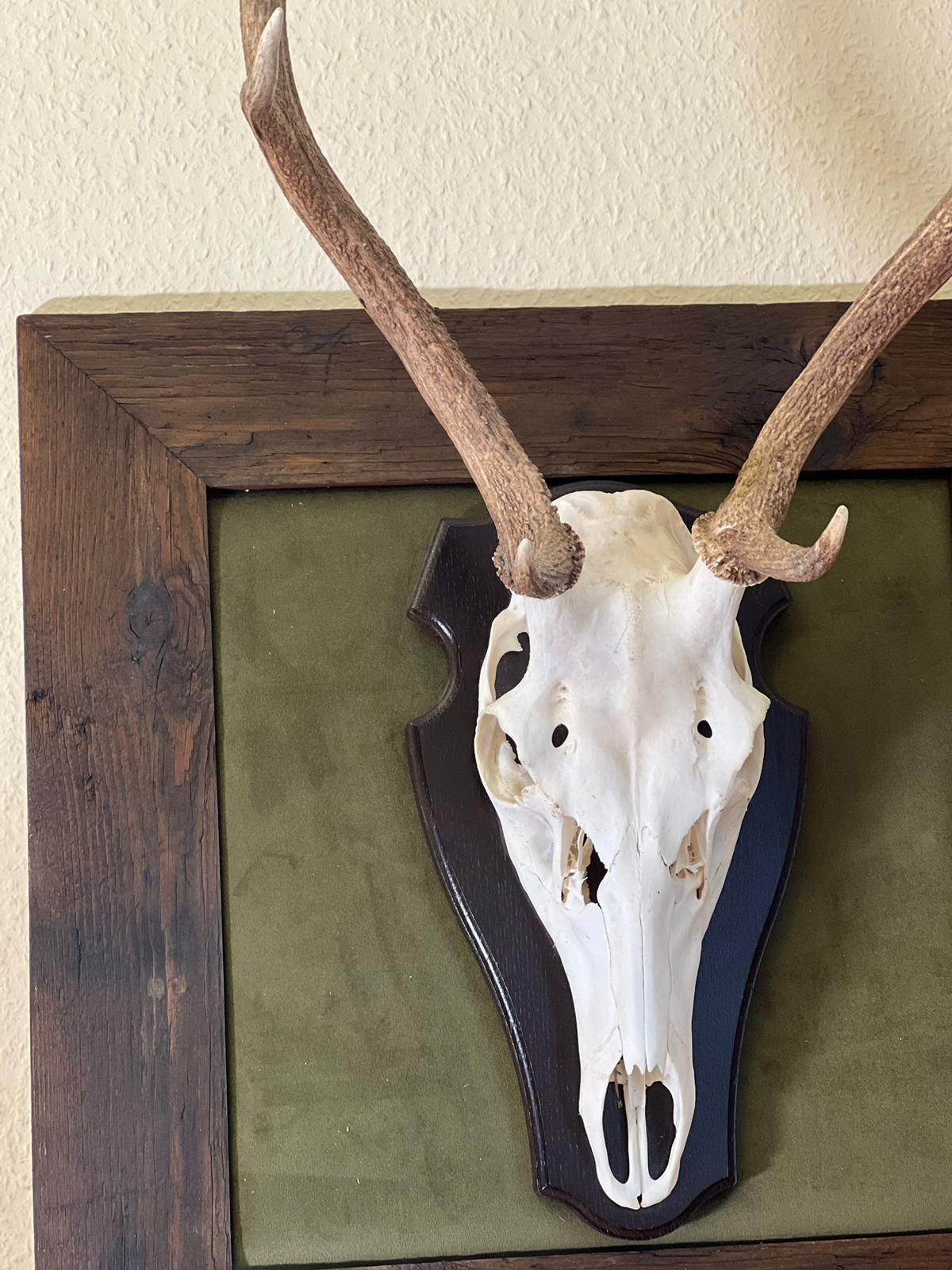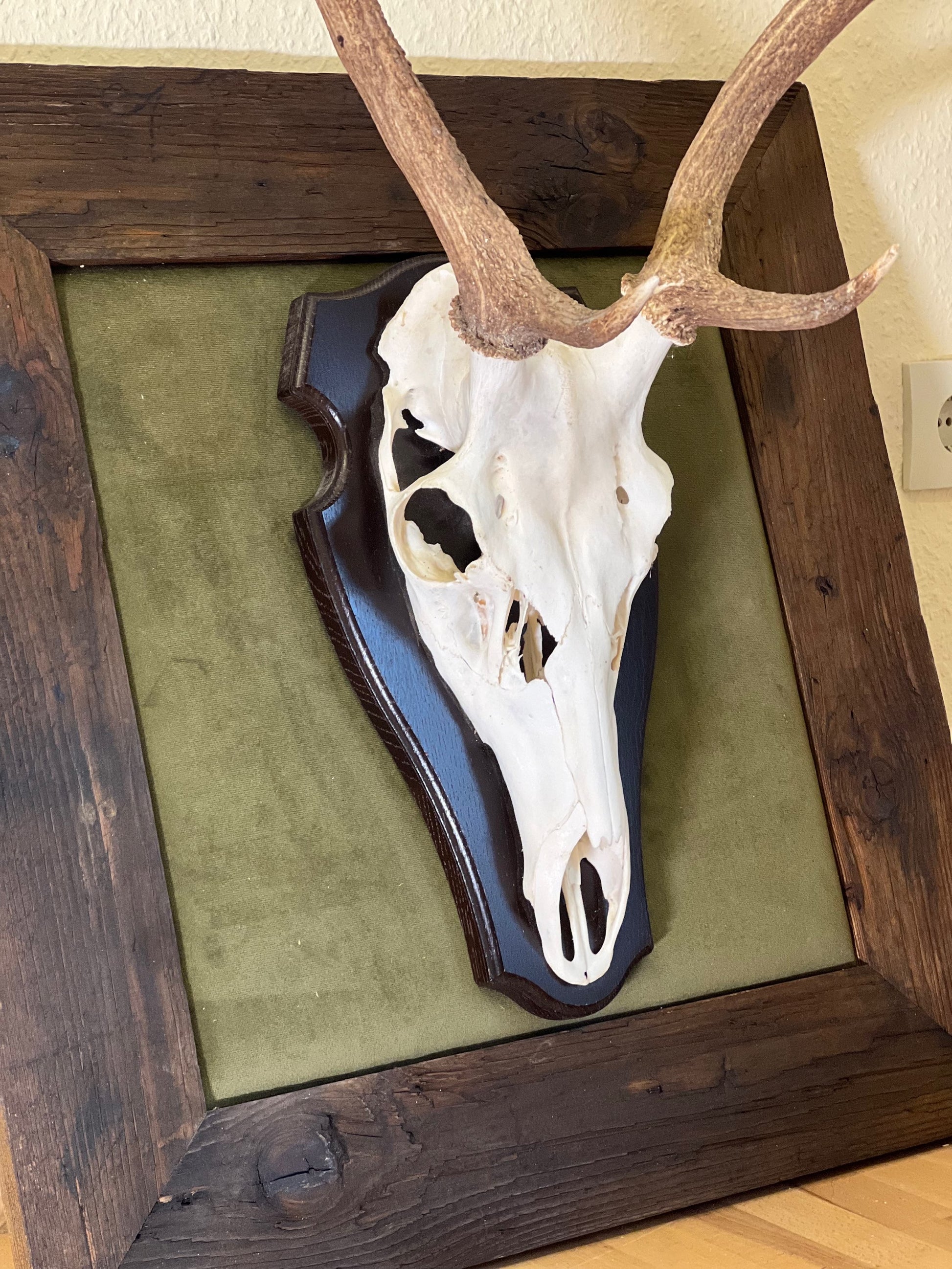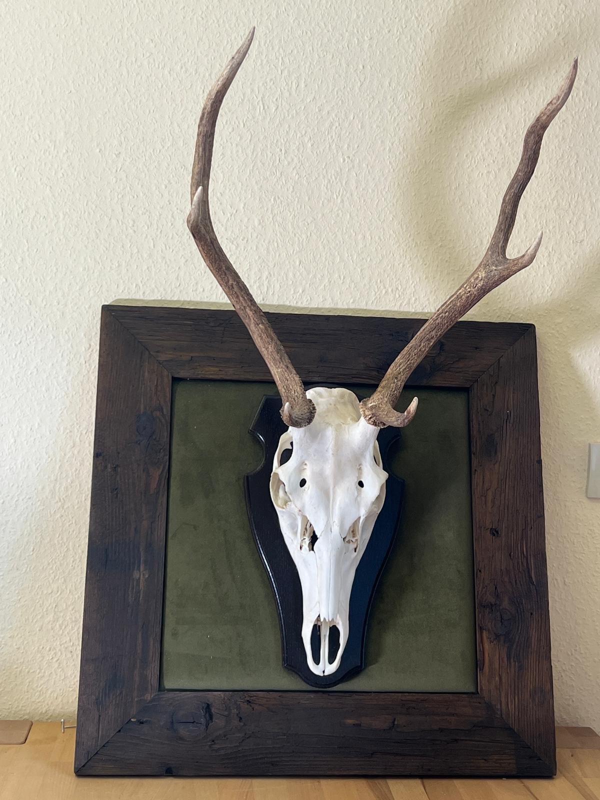 Die Gehörne werden aufgeschraubt. Das Bild kann aber auch ohne Trophäen bestellt werden. Die Auswahl an Stoffen und Farben für die Trägerplatte ist vielfältig. Solltest du dir bei deiner Wahl nicht so sicher sein, schreib uns einfach an.