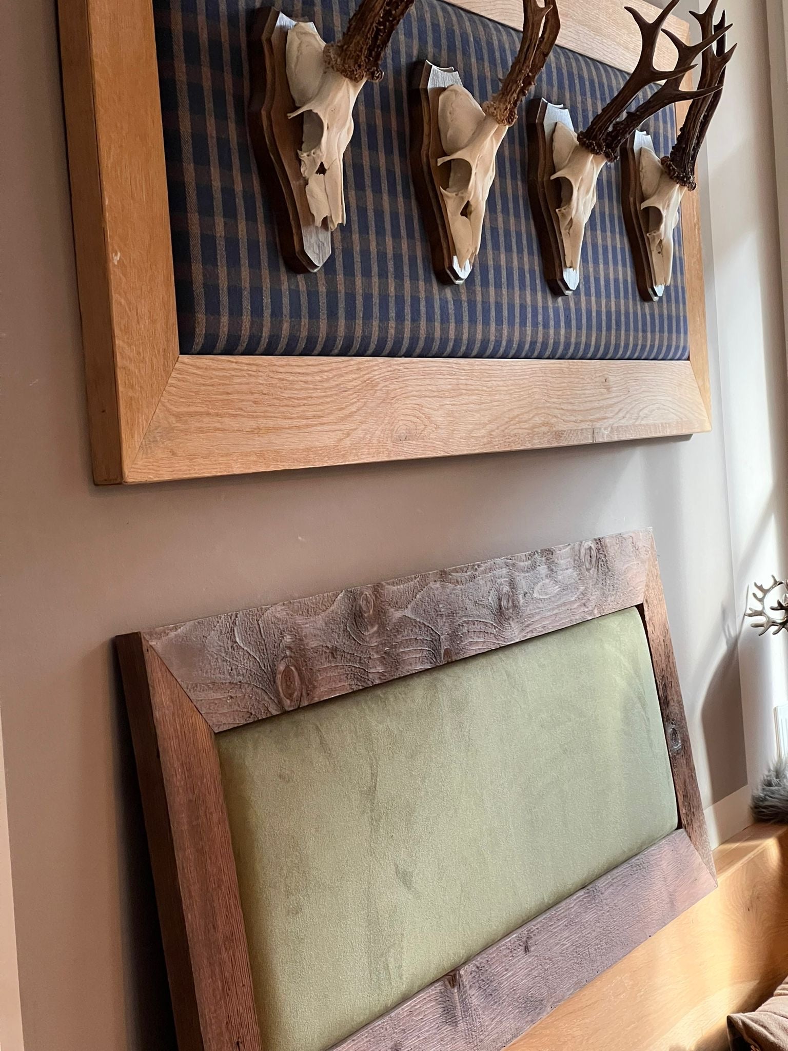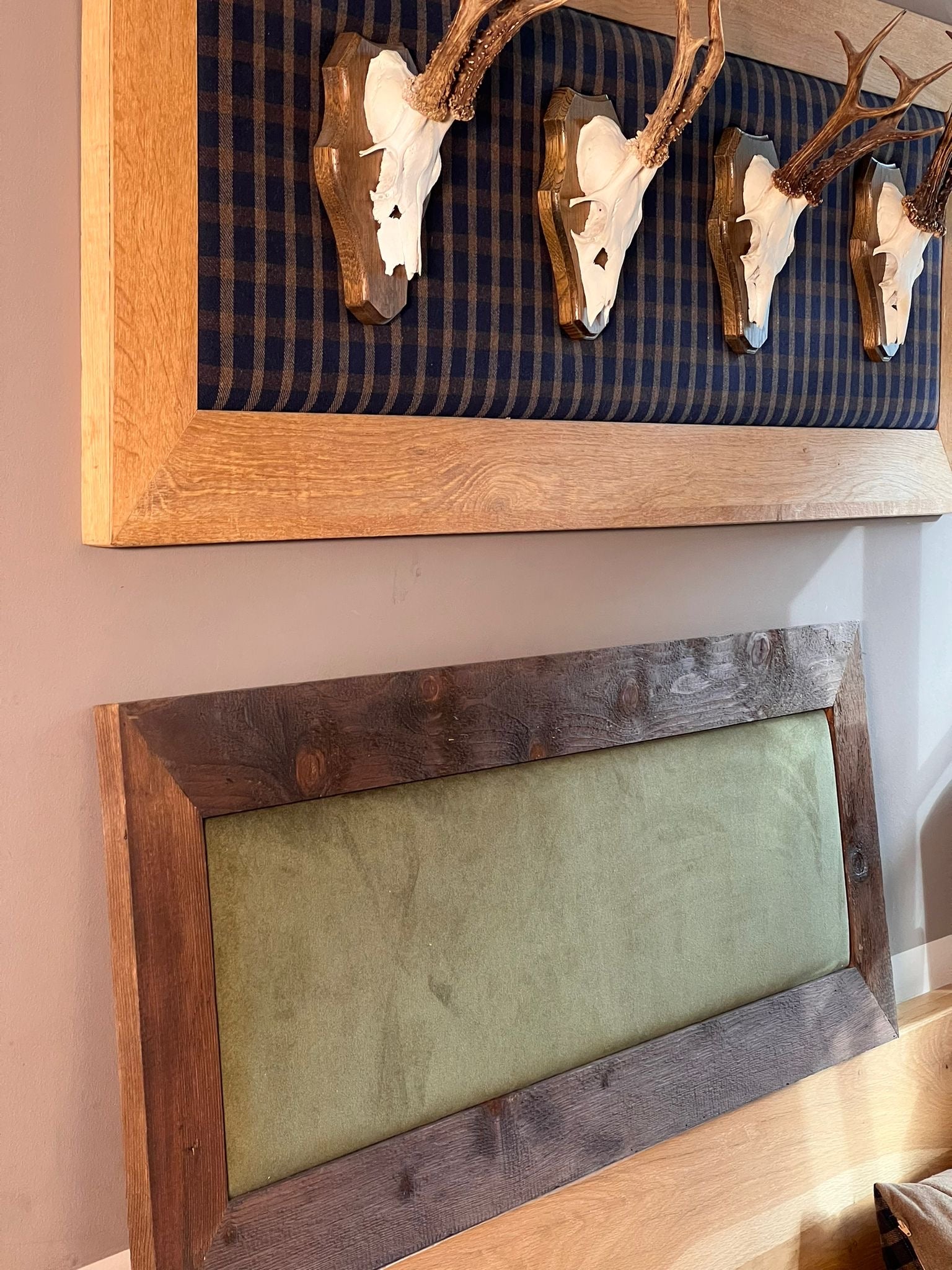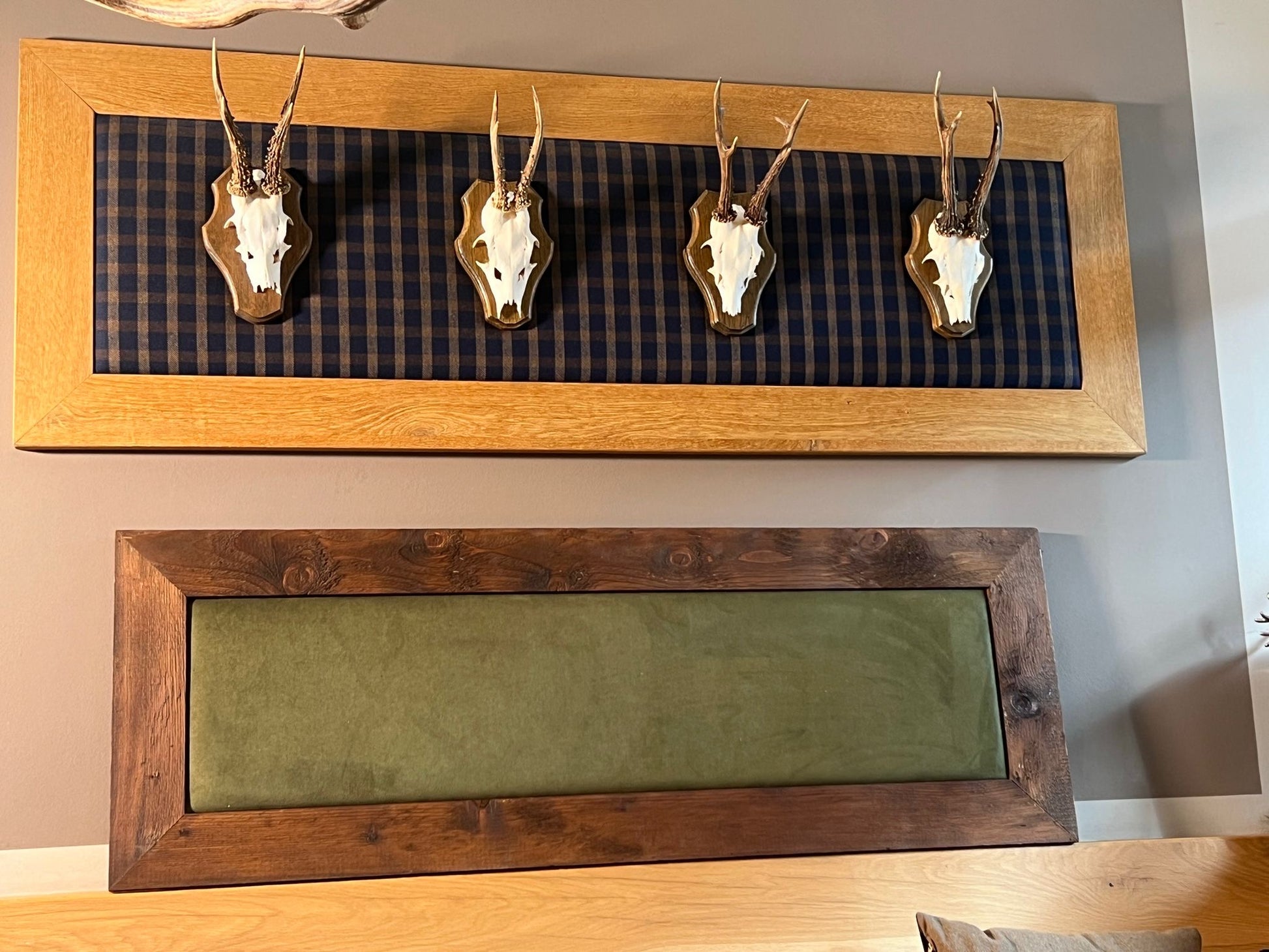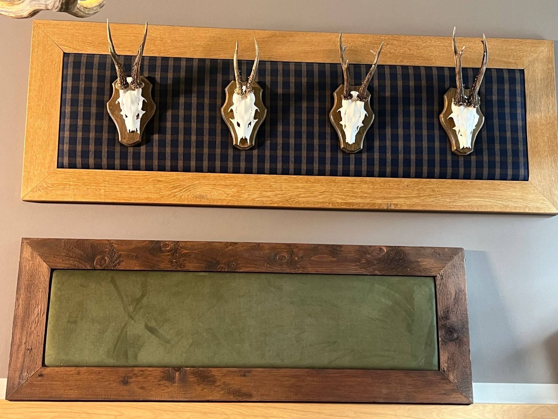Die Gehörne werden aufgeschraubt. Das Bild kann aber auch ohne Trophäen bestellt werden. Die Auswahl an Stoffen und Farben für die Trägerplatte ist vielfältig. Solltest du dir bei deiner Wahl nicht so sicher sein, schreib uns einfach an.