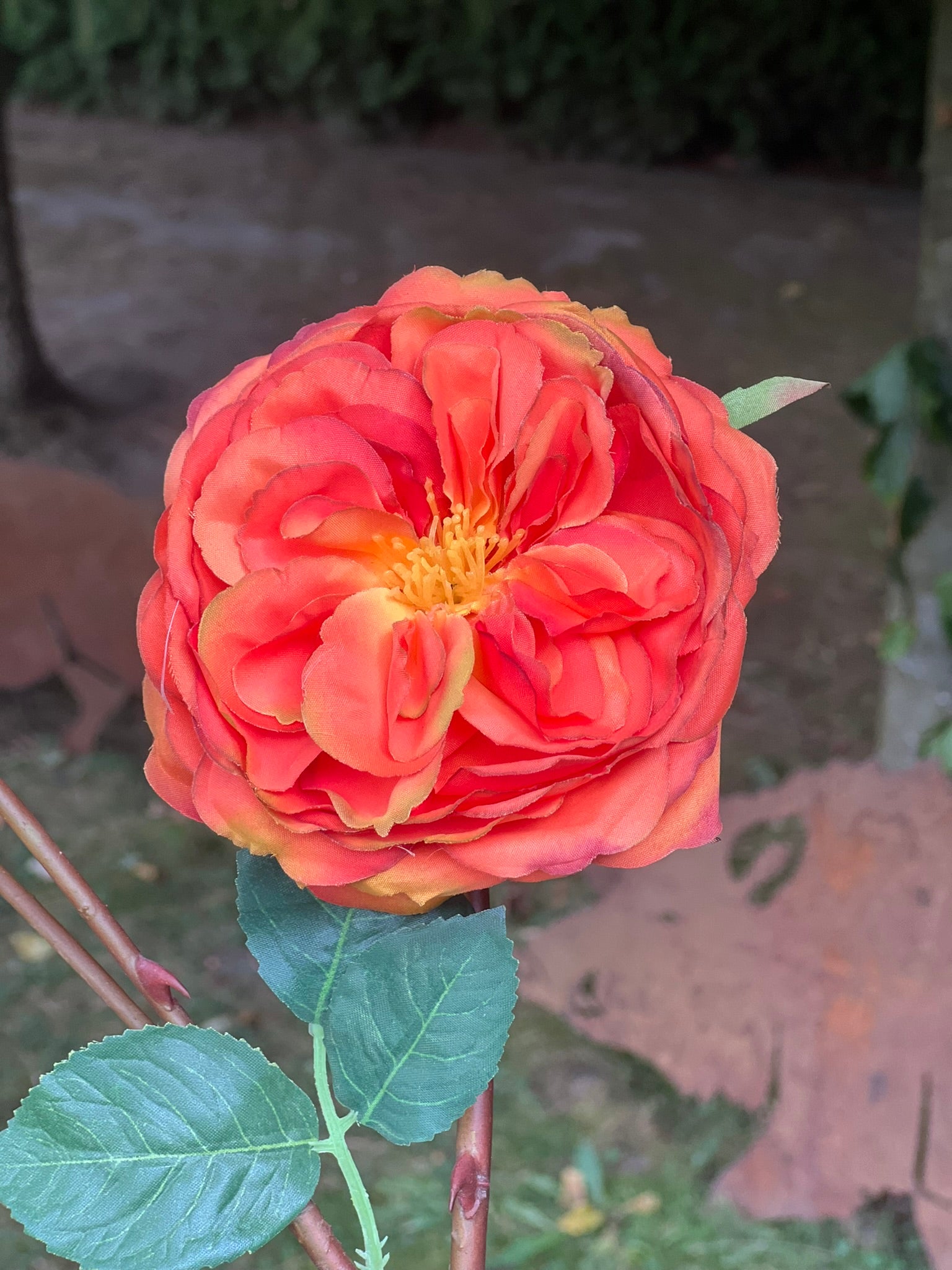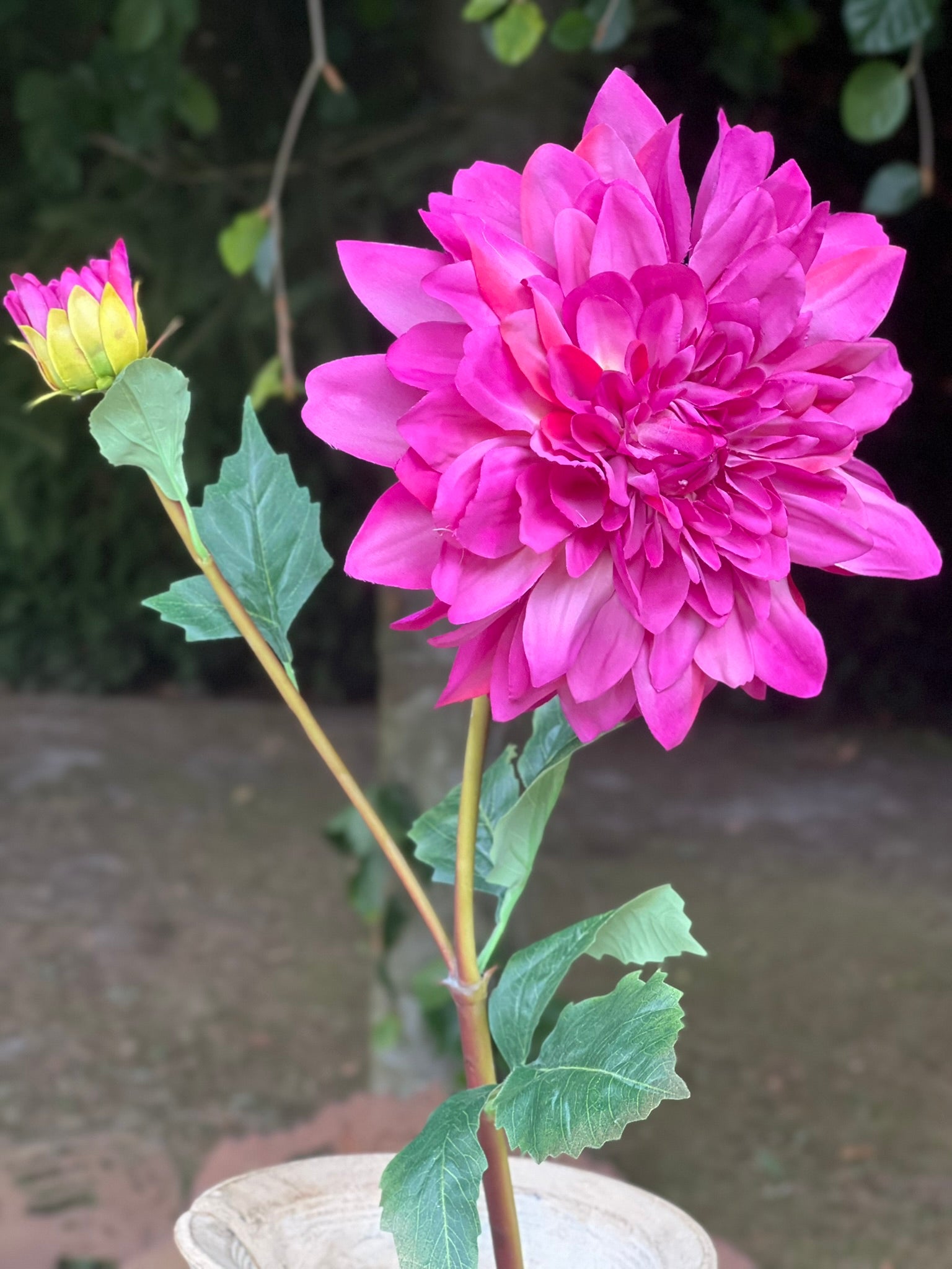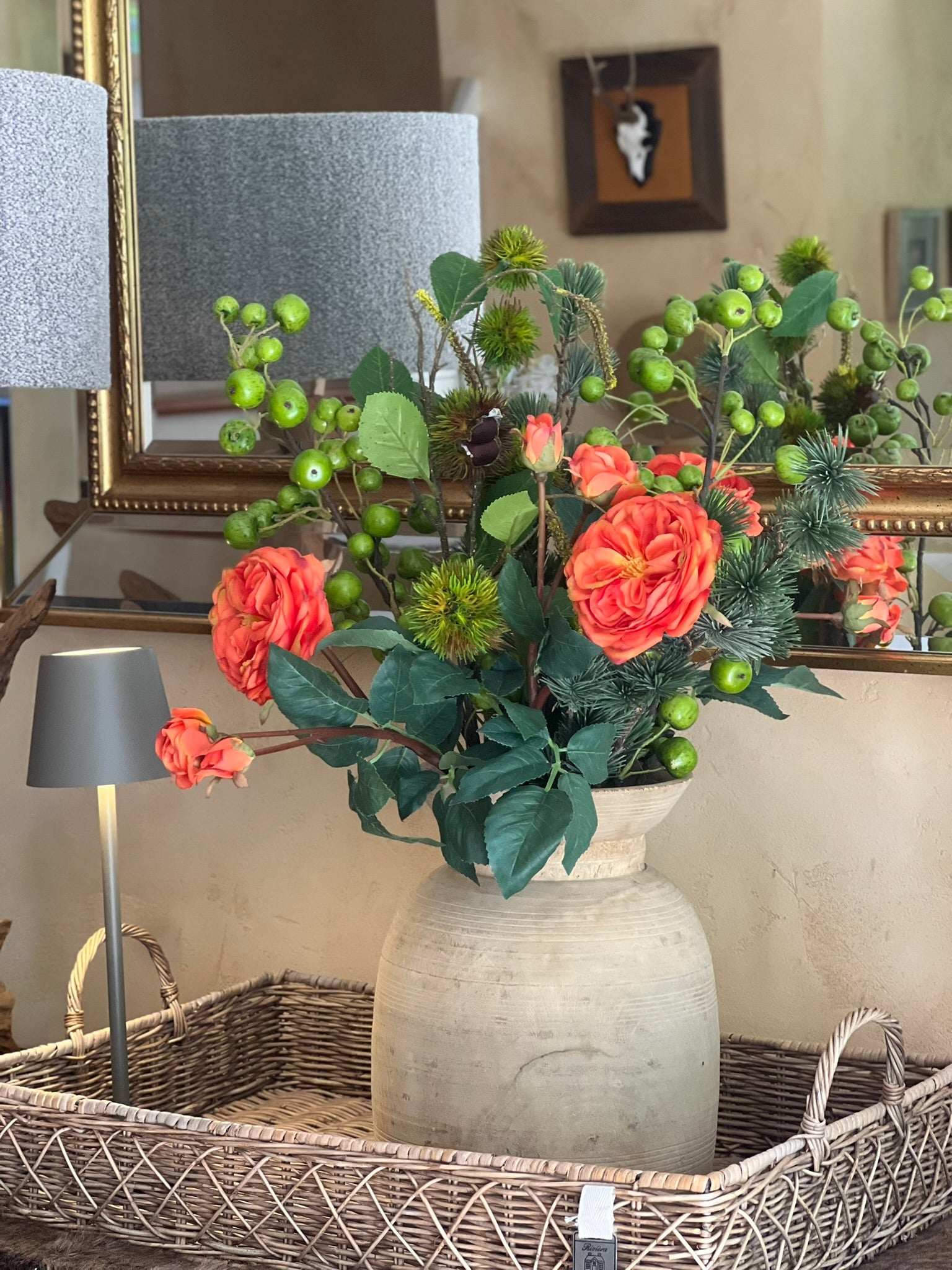 Diese Kunstblumen bestehen aus detailgetreu nachgebildeten Dahlien in dunkelpink, orangefarbenen Rosen, grünen und roten Zieräpfeln, Kastanien und Zedernzweigen. Sie sind so naturgetreu gestaltet, dass sie auf den ersten Blick kaum von echten Blumen und Zweigen zu unterscheiden sind.