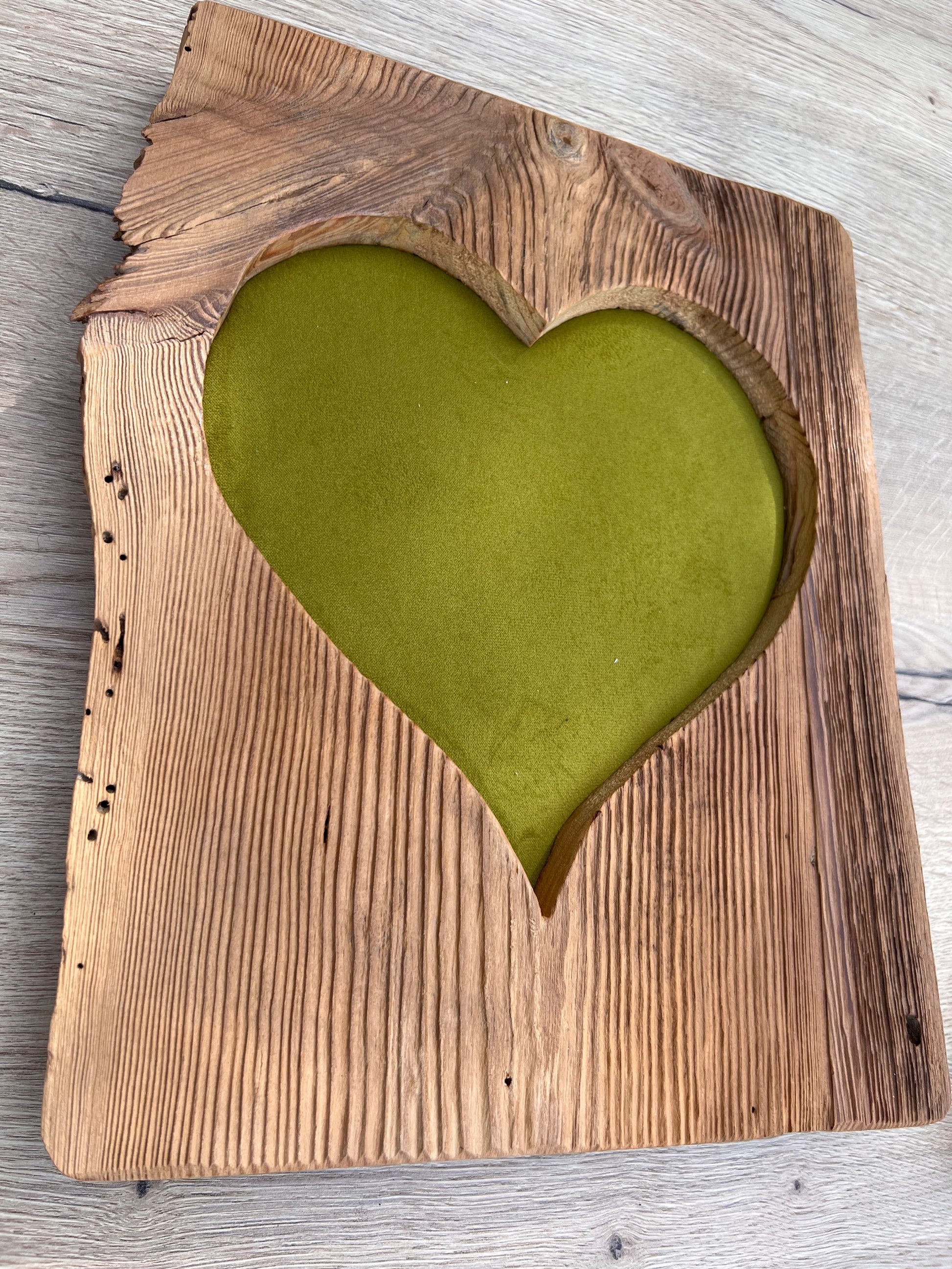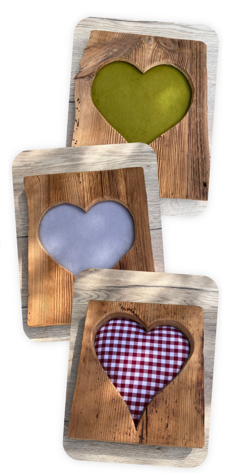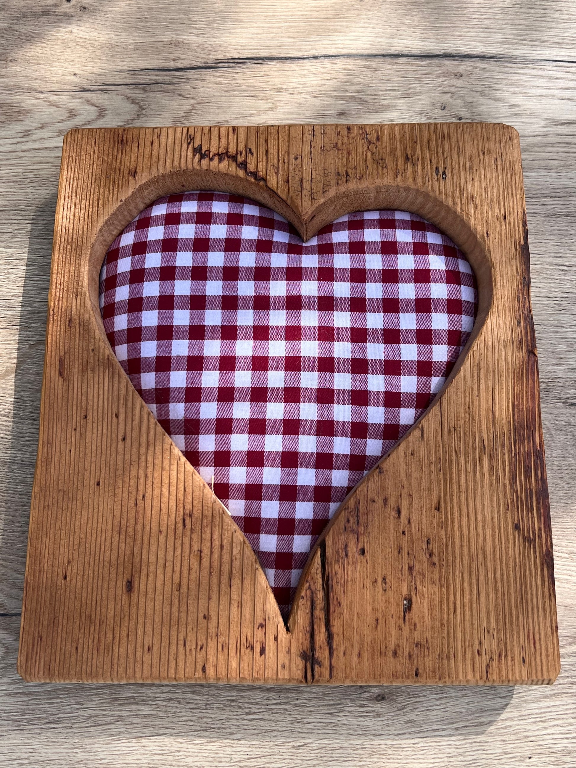 Das Bild mit einem Herzausschnitt besteht aus massiven Altholz und einem hochwertigen Stoffhintergrund.
