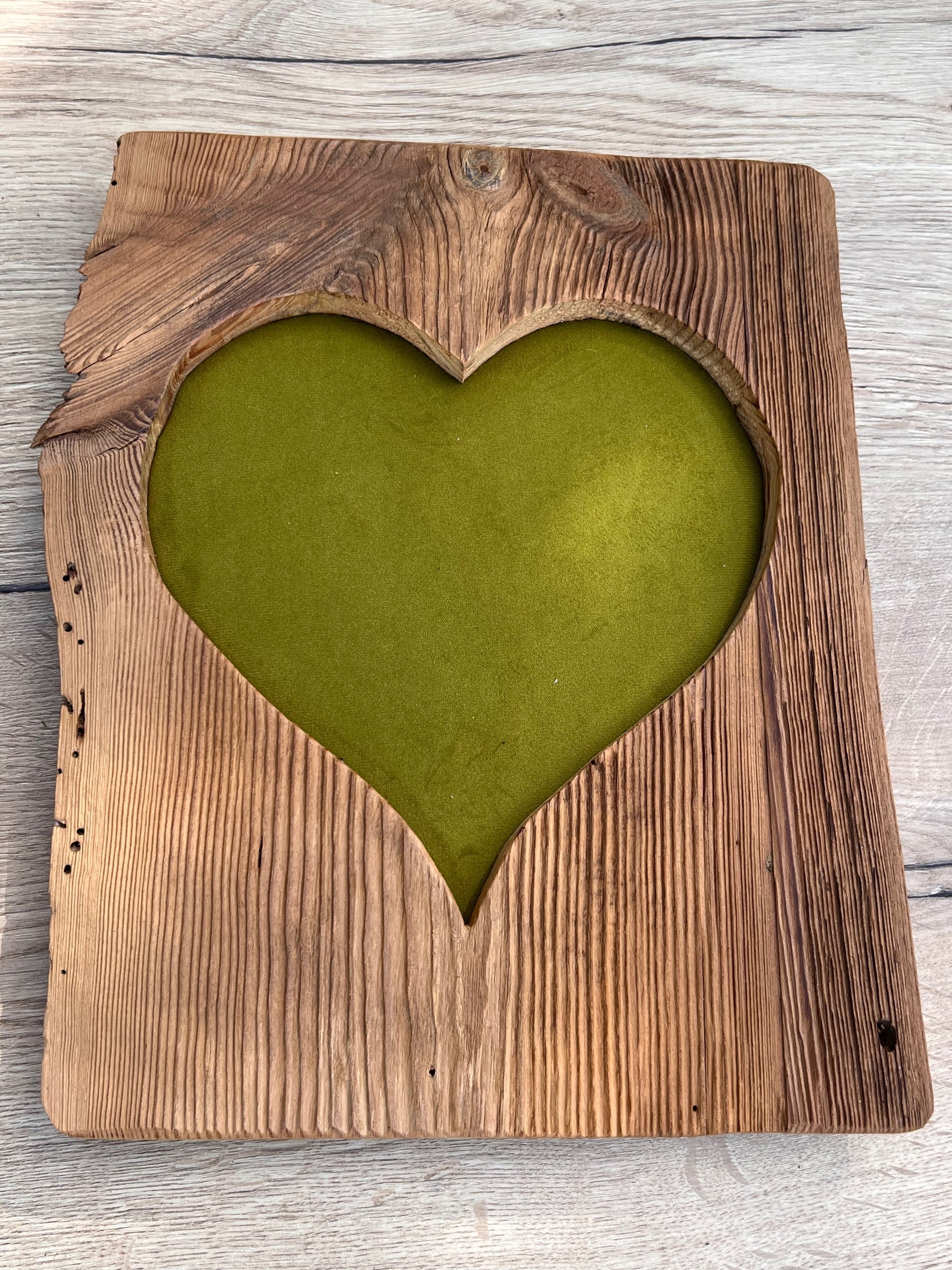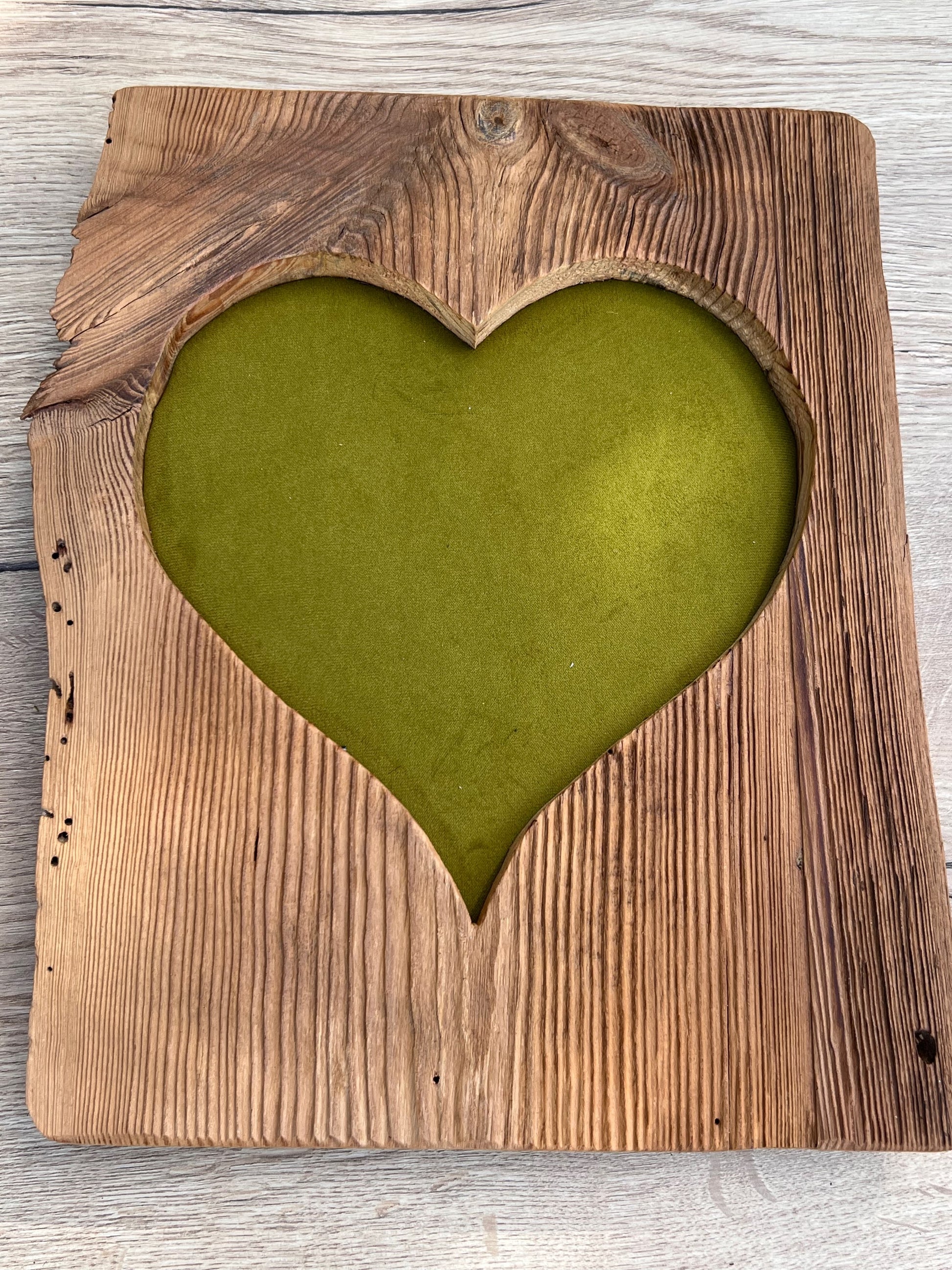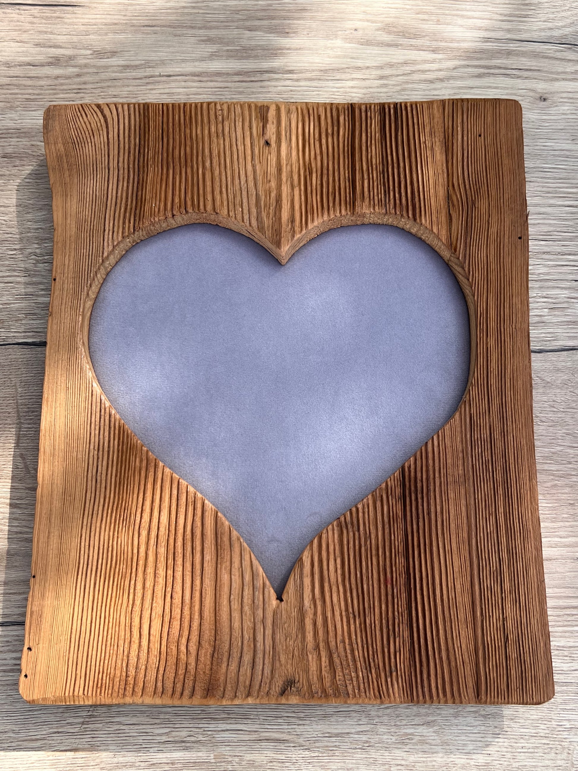 Das Bild mit einem Herzausschnitt besteht aus massiven Altholz und einem hochwertigen Stoffhintergrund.