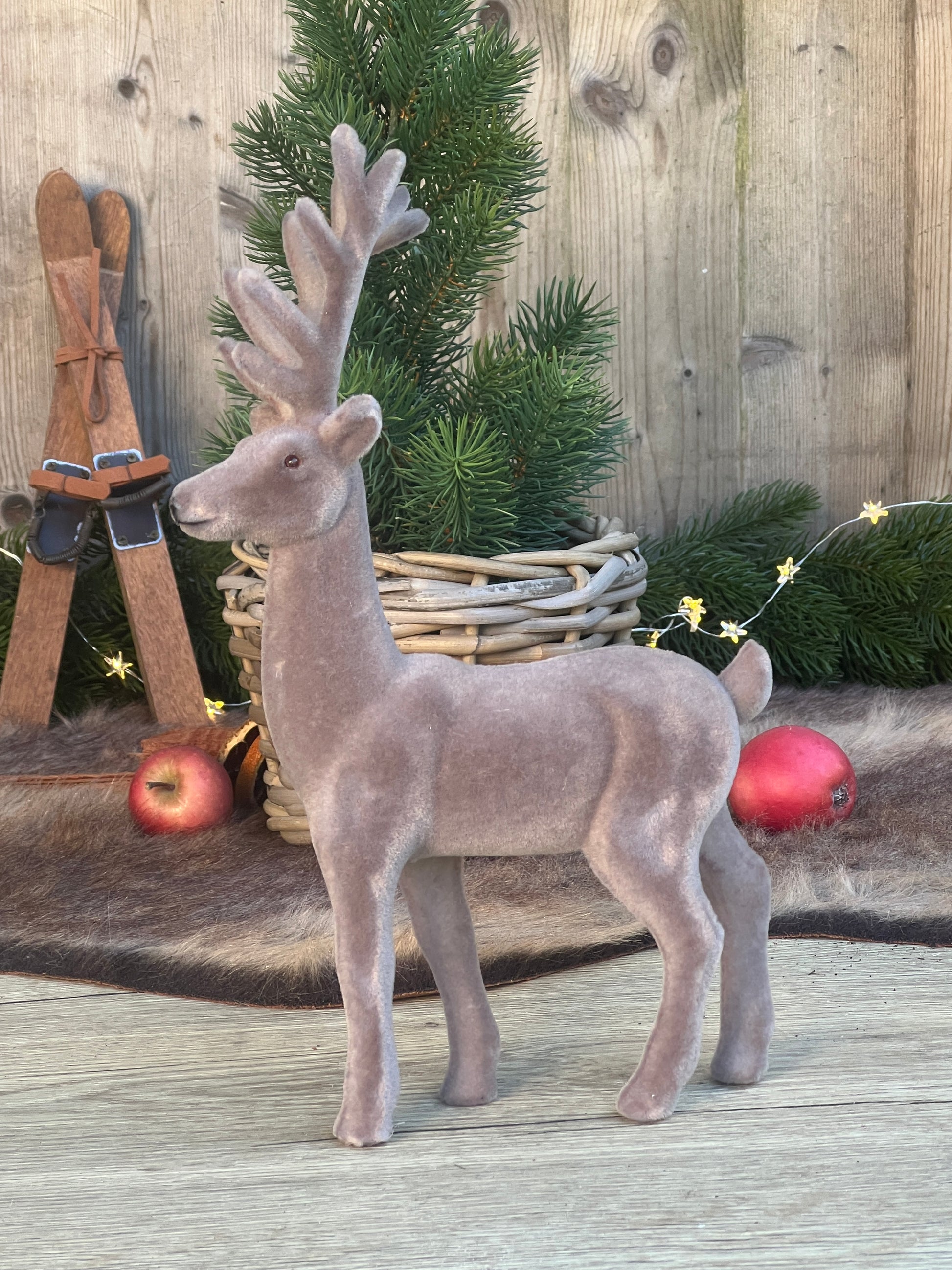 Dieser stilvolle Hirsch in samtiger Optik verleiht deiner Weihnachtsdekoration eine elegante und zugleich alpine Note. In dezenter Taupe-Nuance fügt er sich harmonisch in jeden Einrichtungsstil ein und verbreitet mit seiner stolzen Haltung winterlichen Charme.