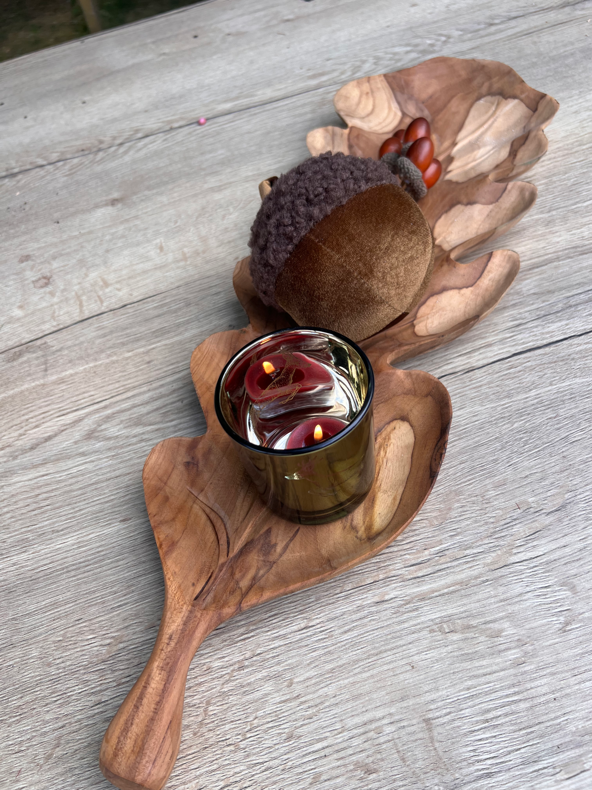 Die Holzschale Eichenblatt ist ein naturgetreu handgearbeitetes Deko-Accessoire in Form eines Eichenblattes. Die detailgetreue Nachbildung der Blattstruktur verleiht der Schale eine authentische Optik. Mit einer Länge von 60 cm macht sie sich wunderschön als dekoratives Element auf jedem Tisch. Die Holzschale bringt die Schönheit der Natur in Ihr Zuhause und ist perfekt für die Präsentation von Obst, Nüssen oder anderen kleinen Snacks geeignet. Ein wunderschönes Stück, um Ihrem Interieur eine natürliche und elegante Note zu verleihen.