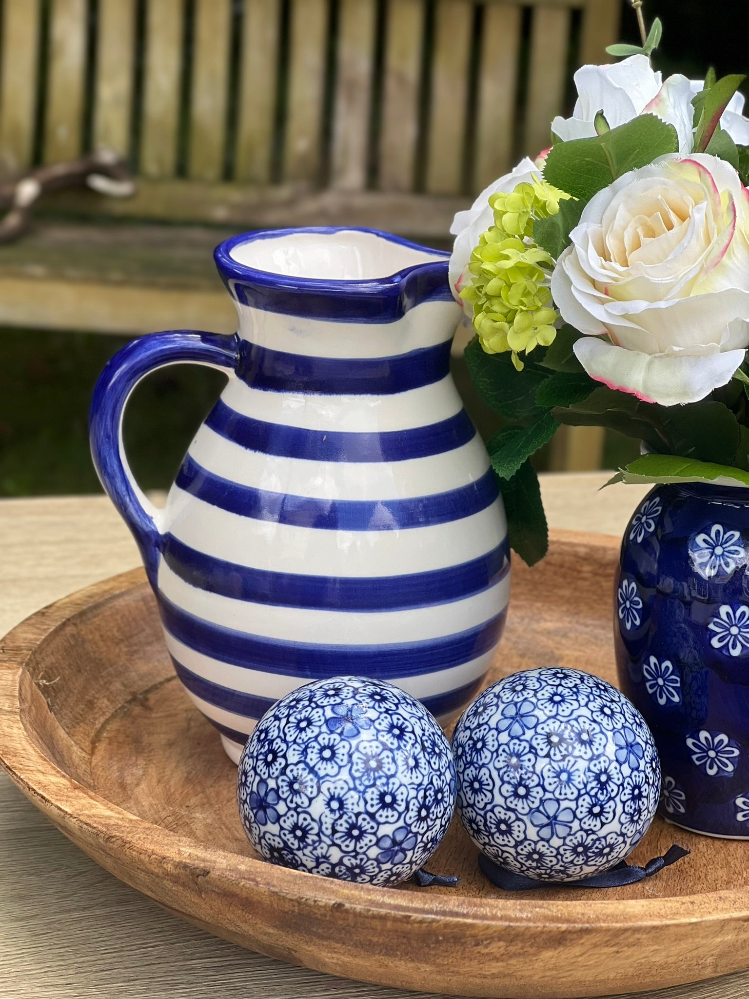 Unser handbemalter Krug ist ein wunderschönes und einzigartiges Küchenaccessoire, das nicht nur praktisch, sondern auch dekorativ ist. Jeder Krug ist von Hand bemalt und getöpfert, wodurch jedes Stück ein Unikat ist. Die Krüge sind spülmaschinenfest und können auch als Vase verwendet werden, um Ihren Wohnraum mit einem Hauch von Eleganz zu verschönern. Mit seinem gestreiften Design verleiht der handbemalte Krug jedem Raum eine charmante und traditionelle Atmosphäre. Dieser Krug ist ein Must-Have für alle, die handgefertigte, einzigartige Kunstwerke schätzen.