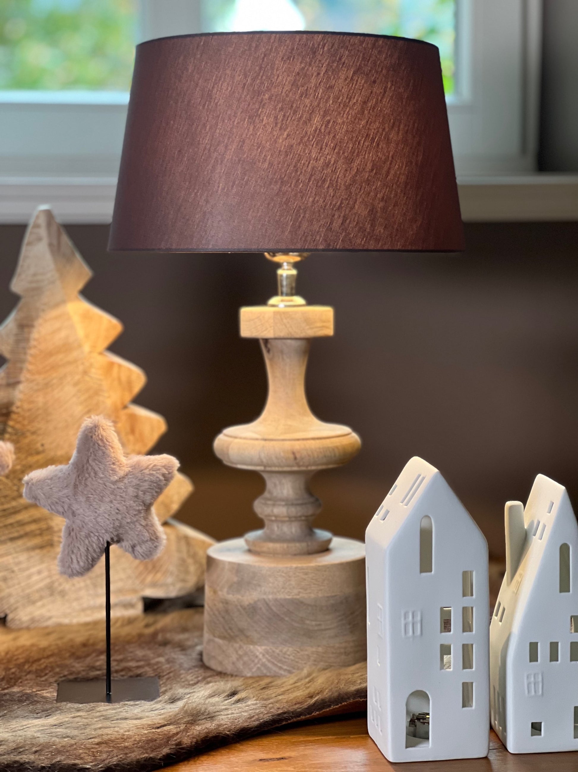 Vom Holzfuss bis zum Lampenschirm in Dunkelbraun handelt es sich um liebevolle Handarbeit.