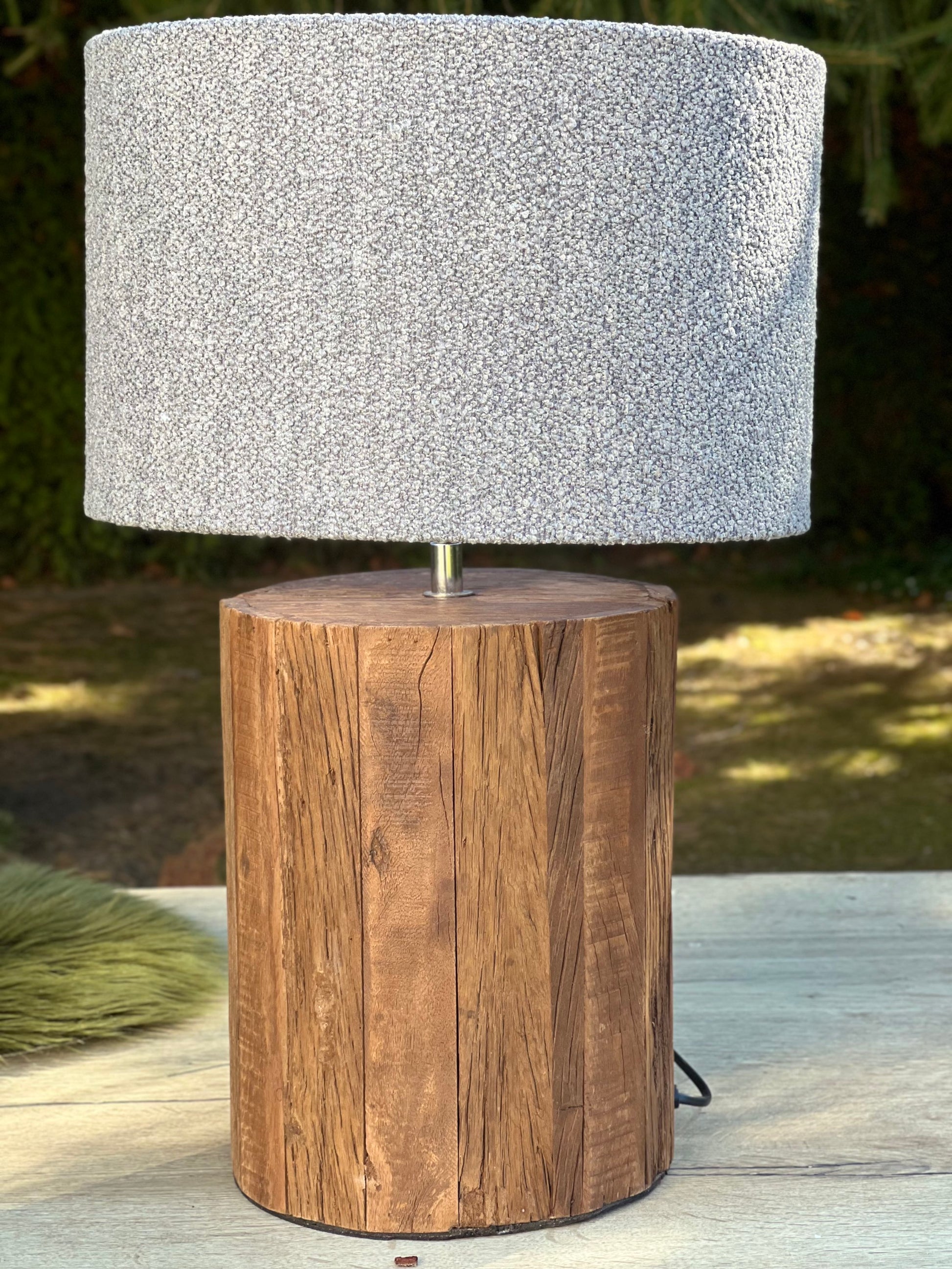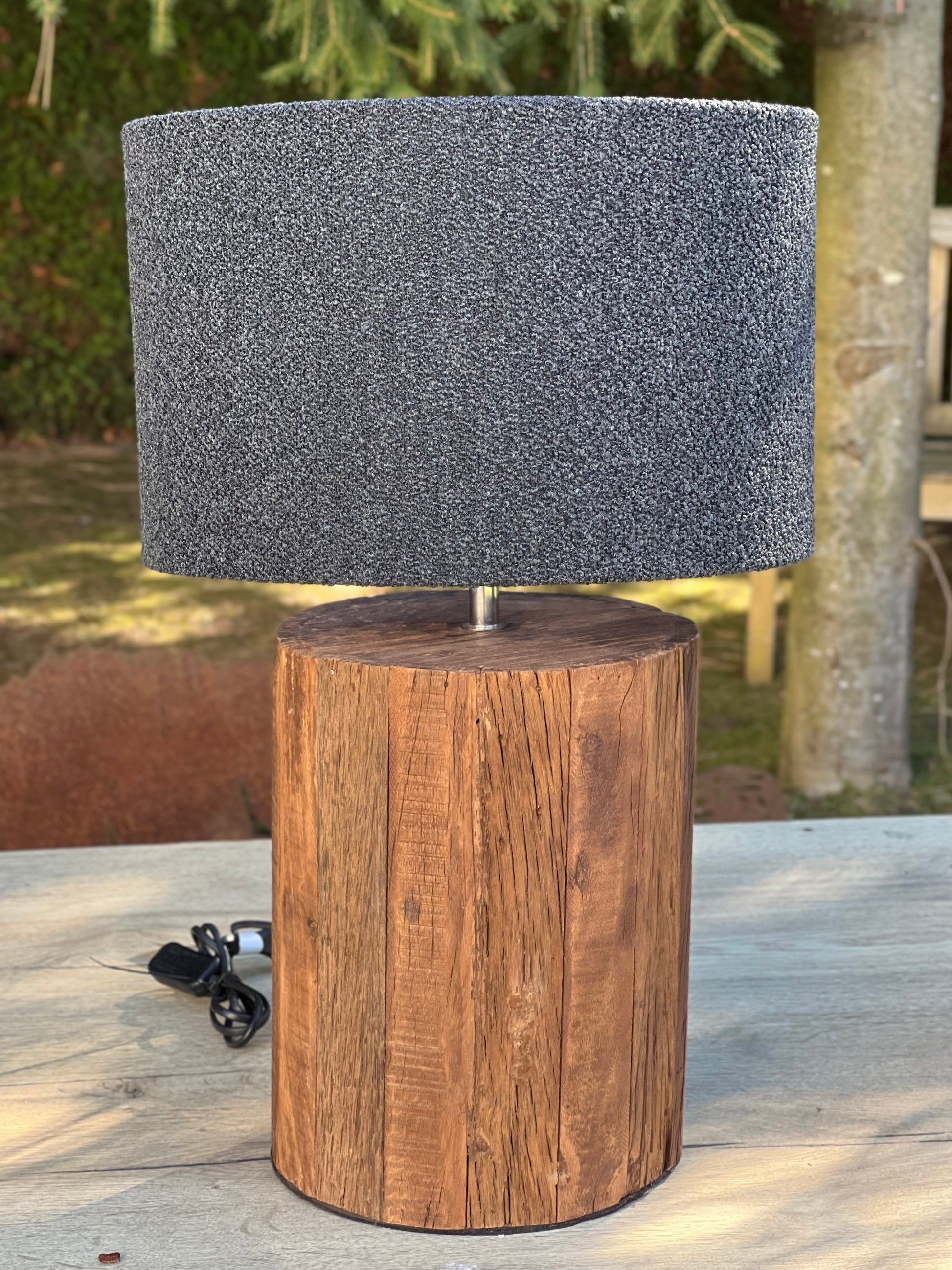 Der Fuß der Tischlampe besteht aus handbearbeitetem Altholz – so ist garantiert: Jede Lampe ist ein echtes Unikat.