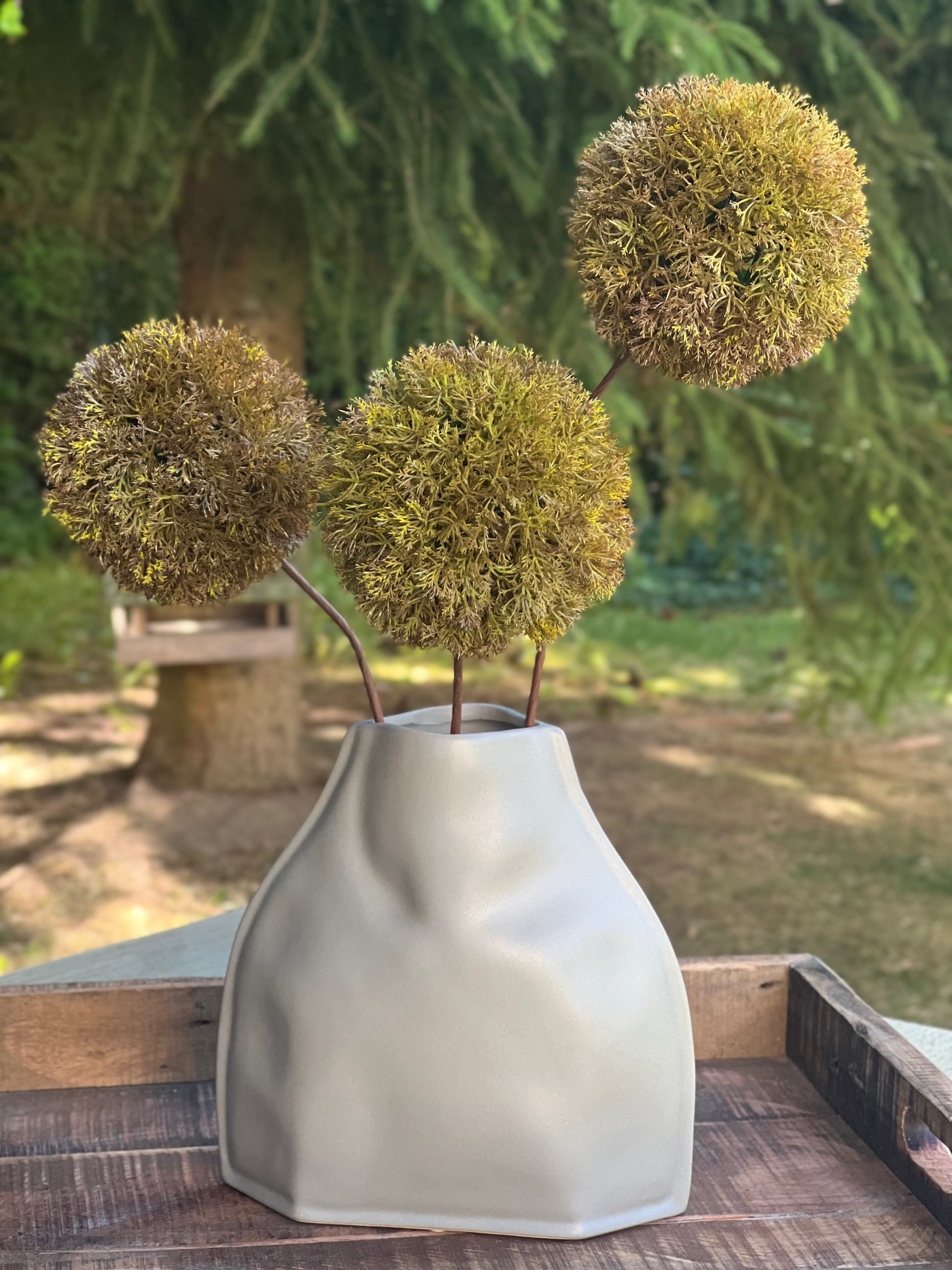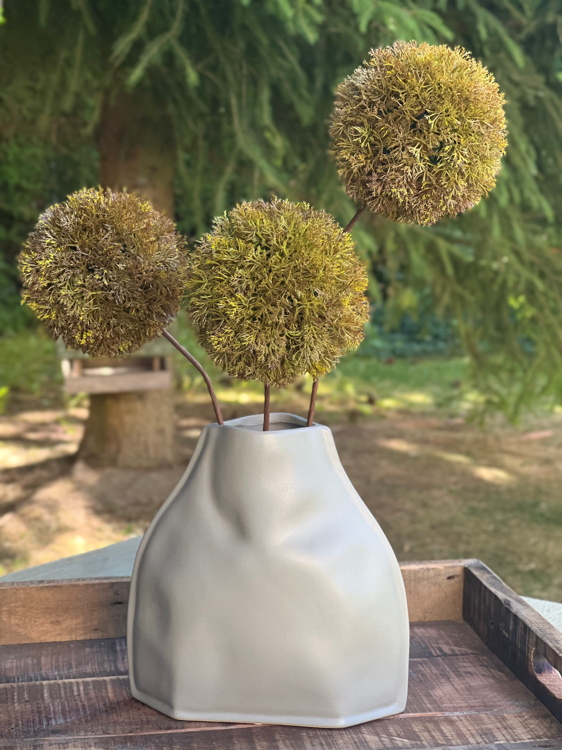 Diese stilvollen Mooskugeln am Stiel bringen natürliche Eleganz in Ihr Zuhause – ganz ohne Pflegeaufwand. Das Set besteht aus drei kunstvoll gearbeiteten Kugeln , die durch ihre detailreiche Struktur und täuschend echte Optik wie frisch aus der Natur wirken.