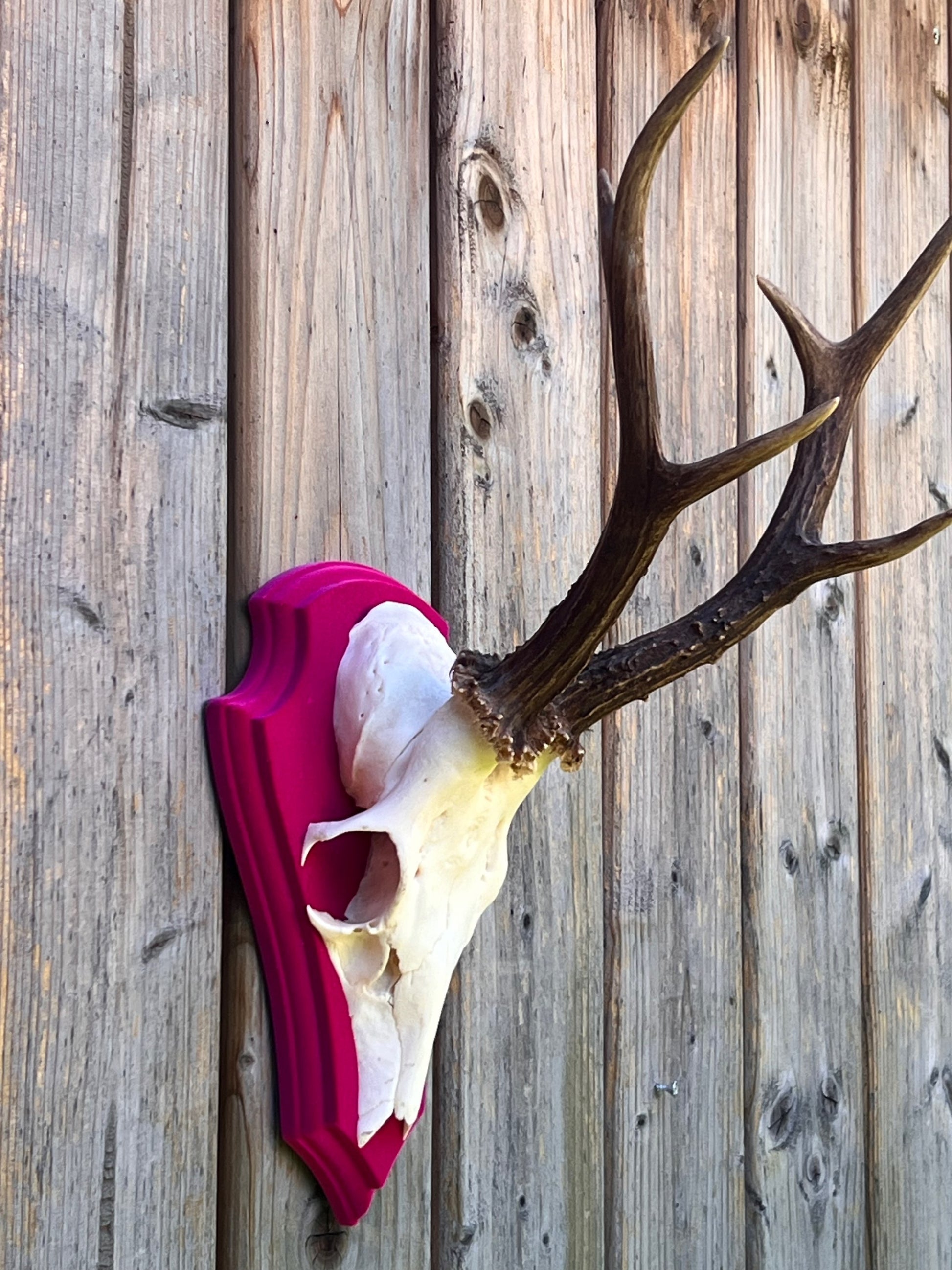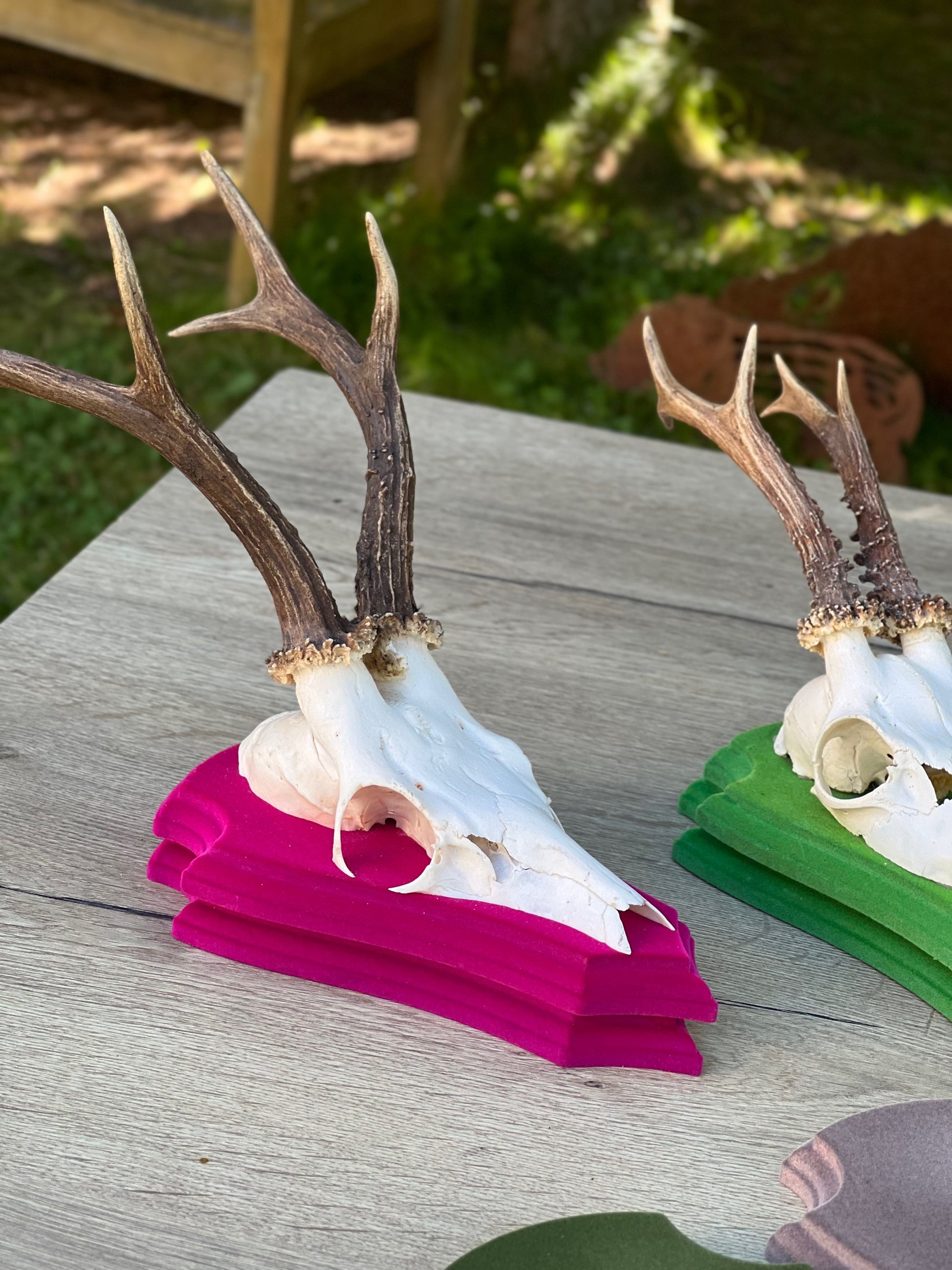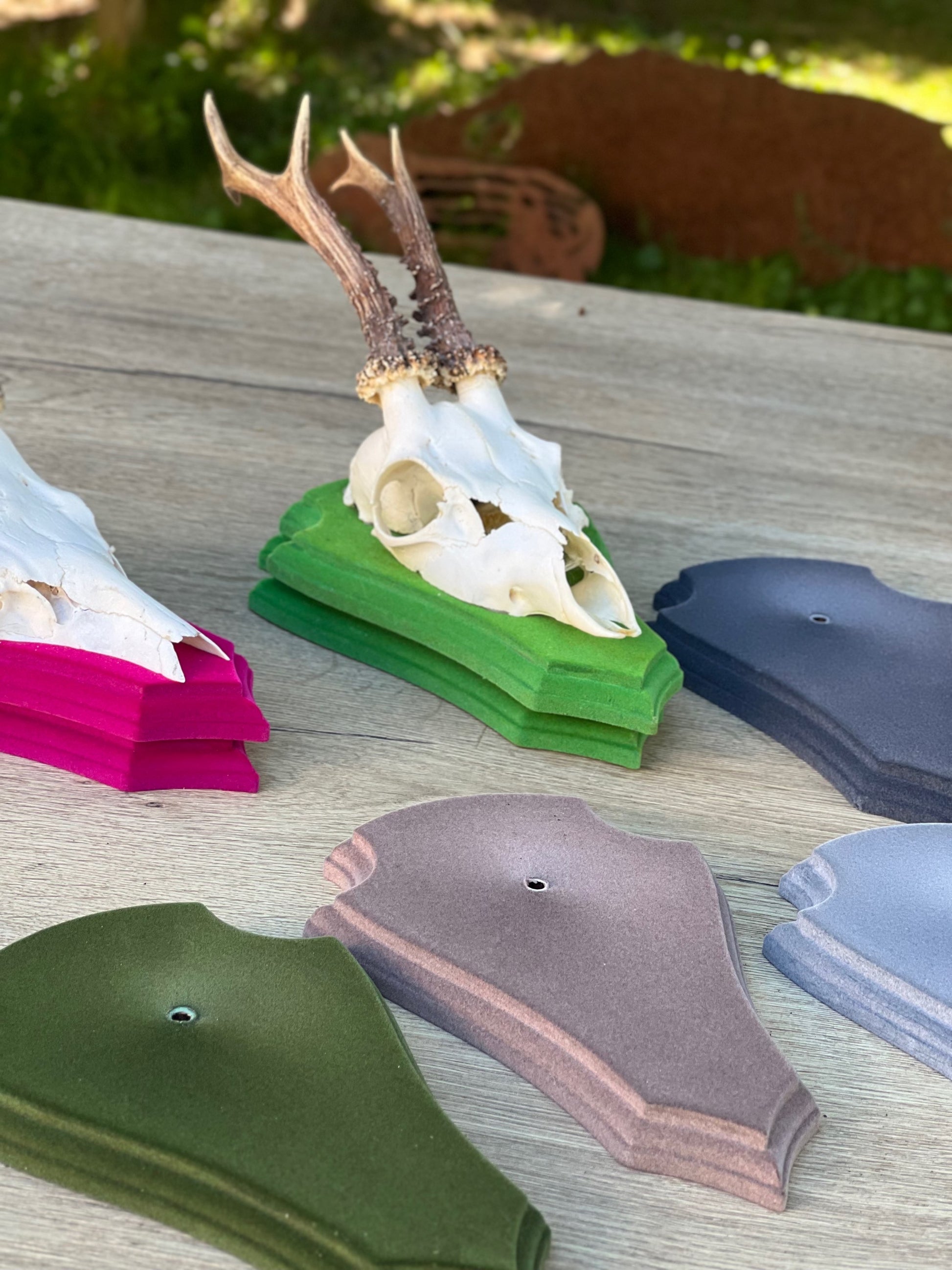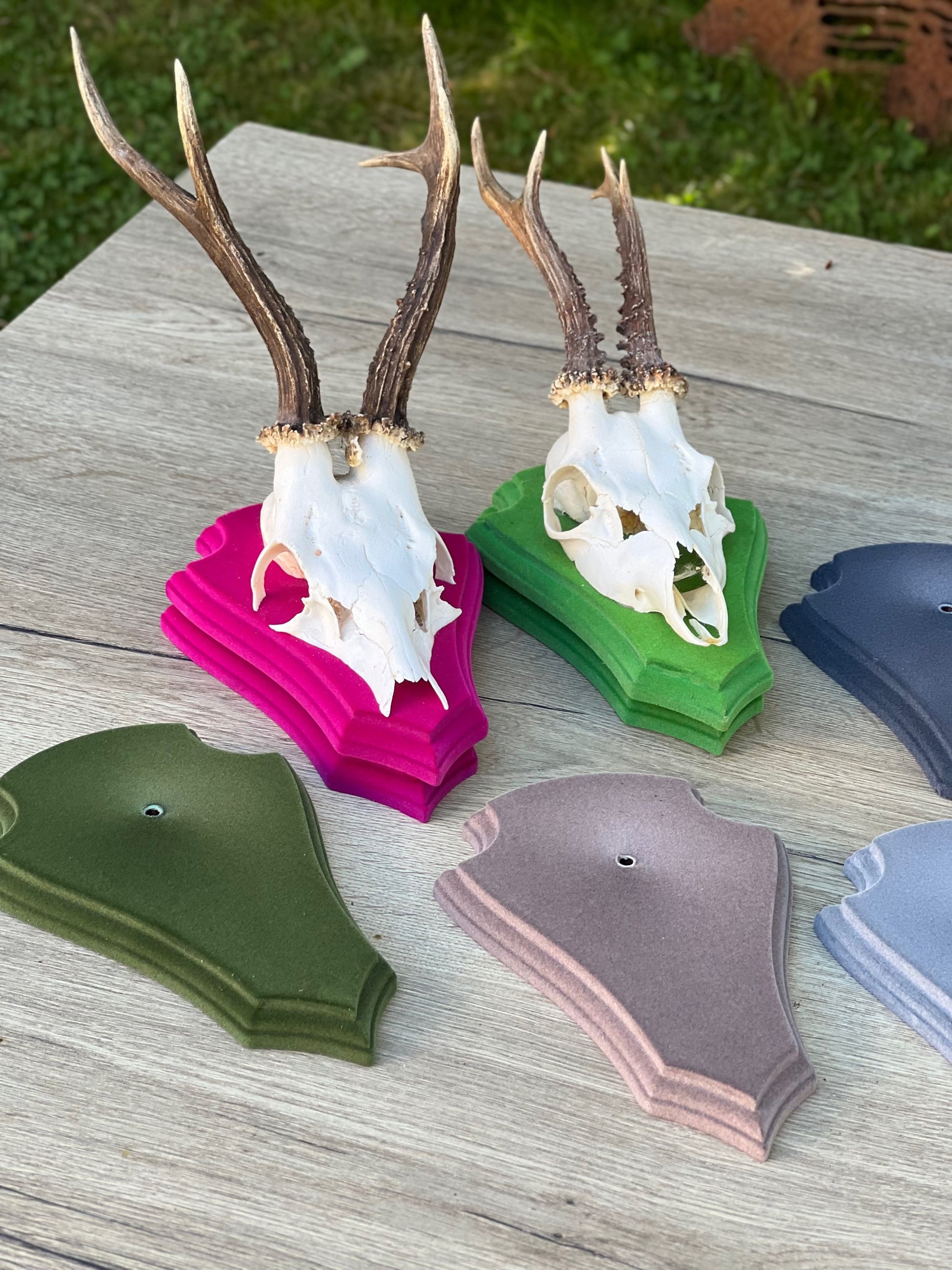 Rehbocktrophäe Holzbrett mit Beflockung in verschiedenen Farben