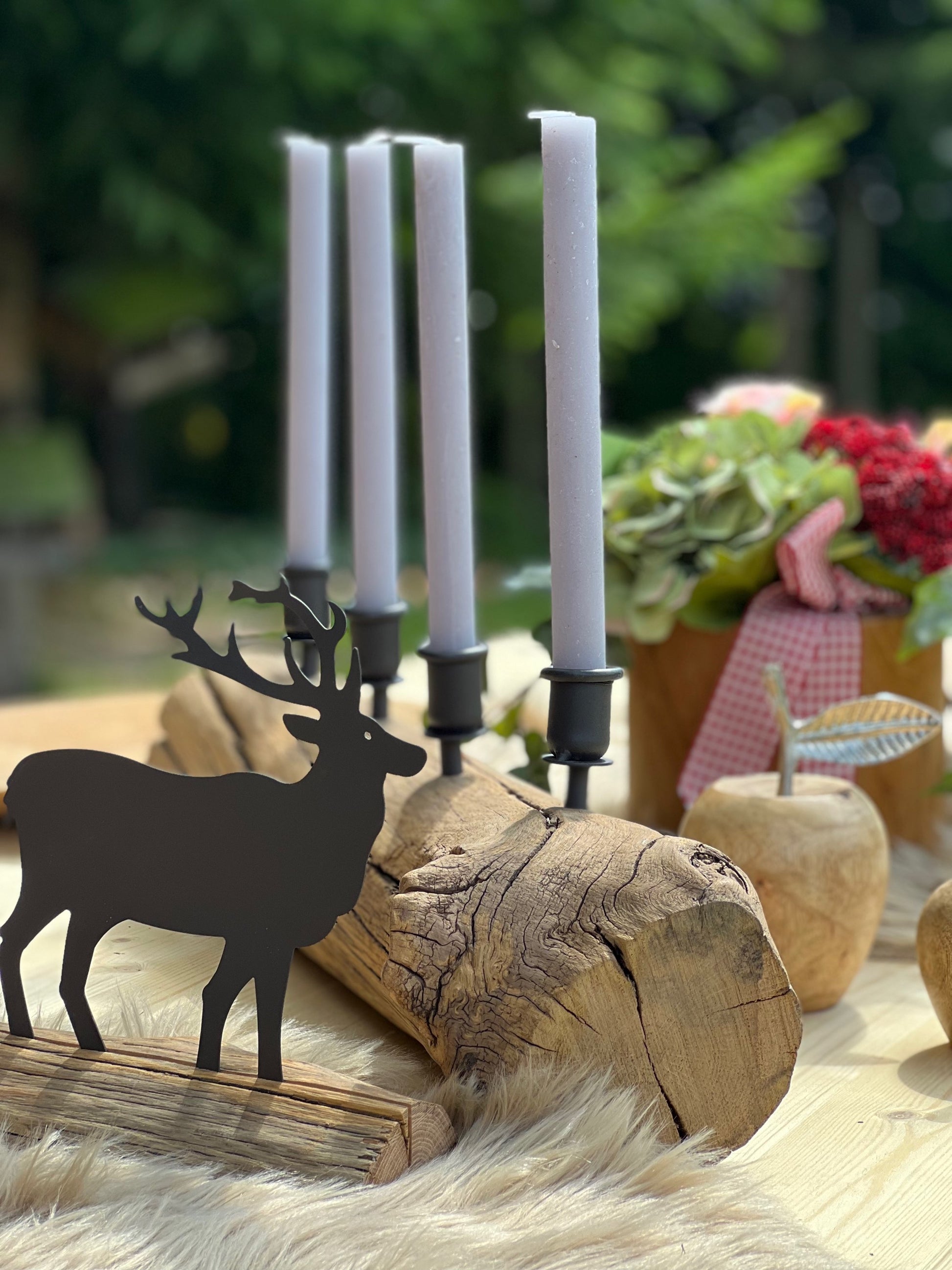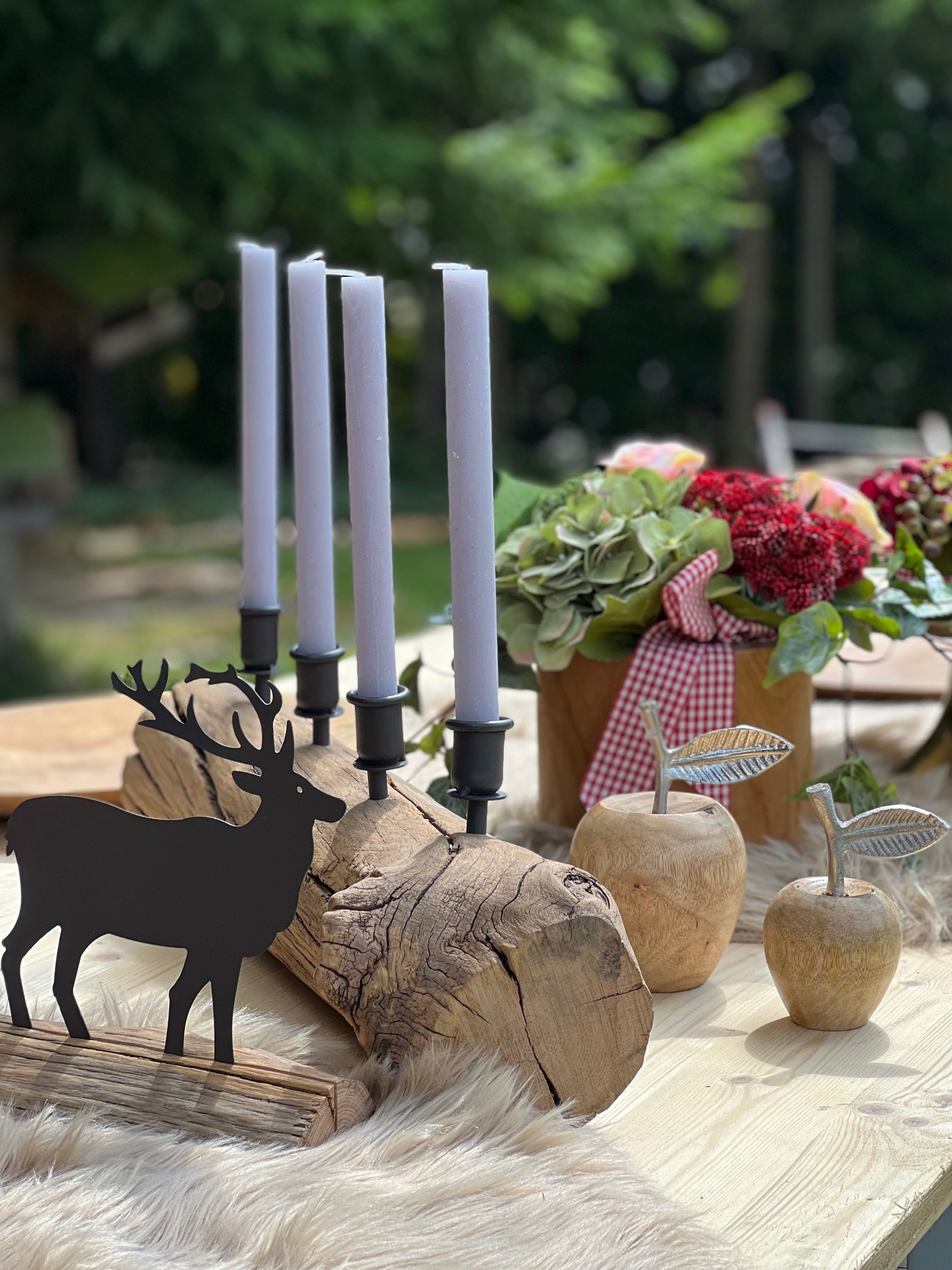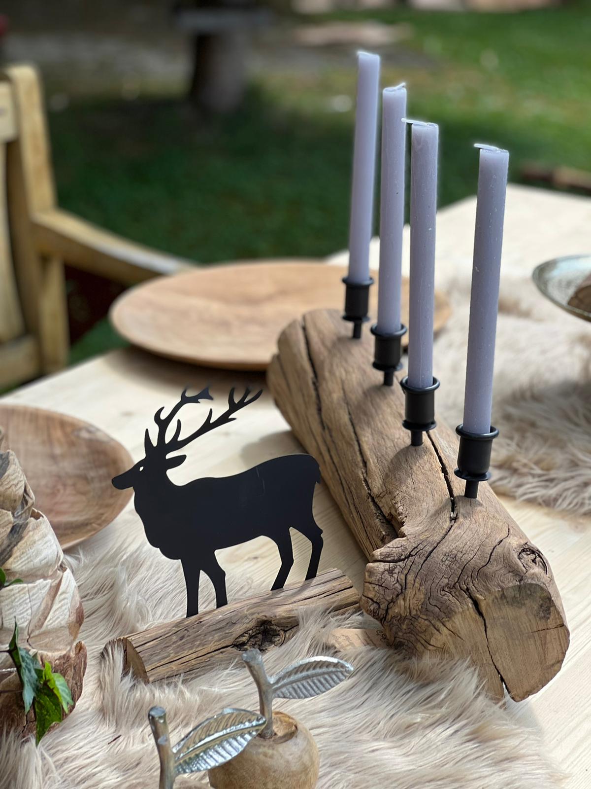 Rustikaler Baumstamm (gebogen oder gerade) mit vier Kerzenhaltern für Spitzkerzen.