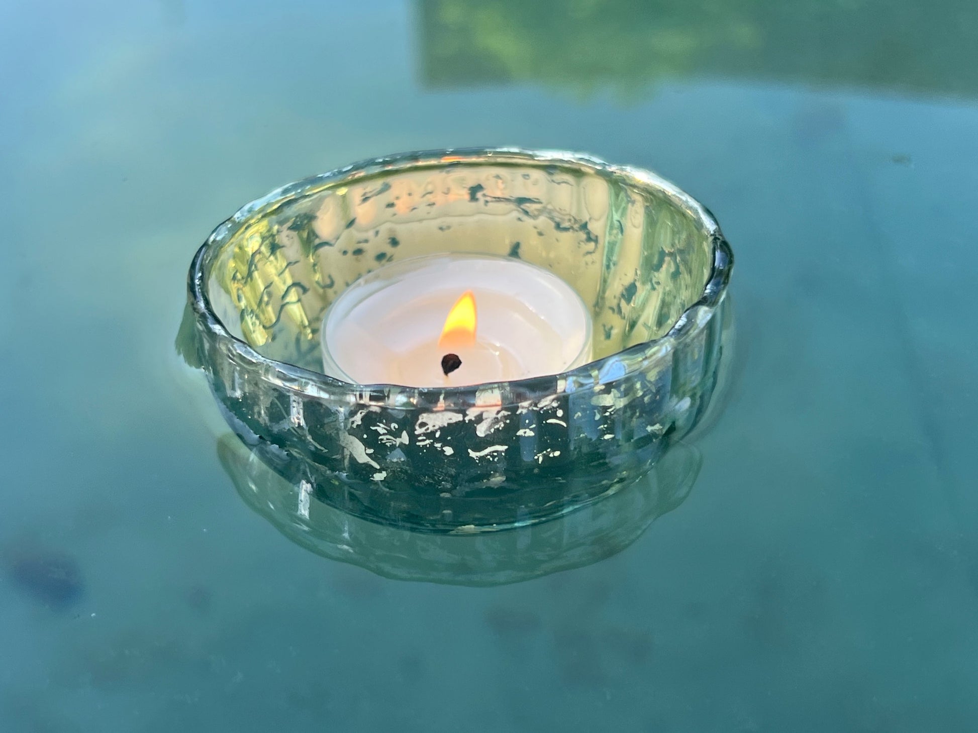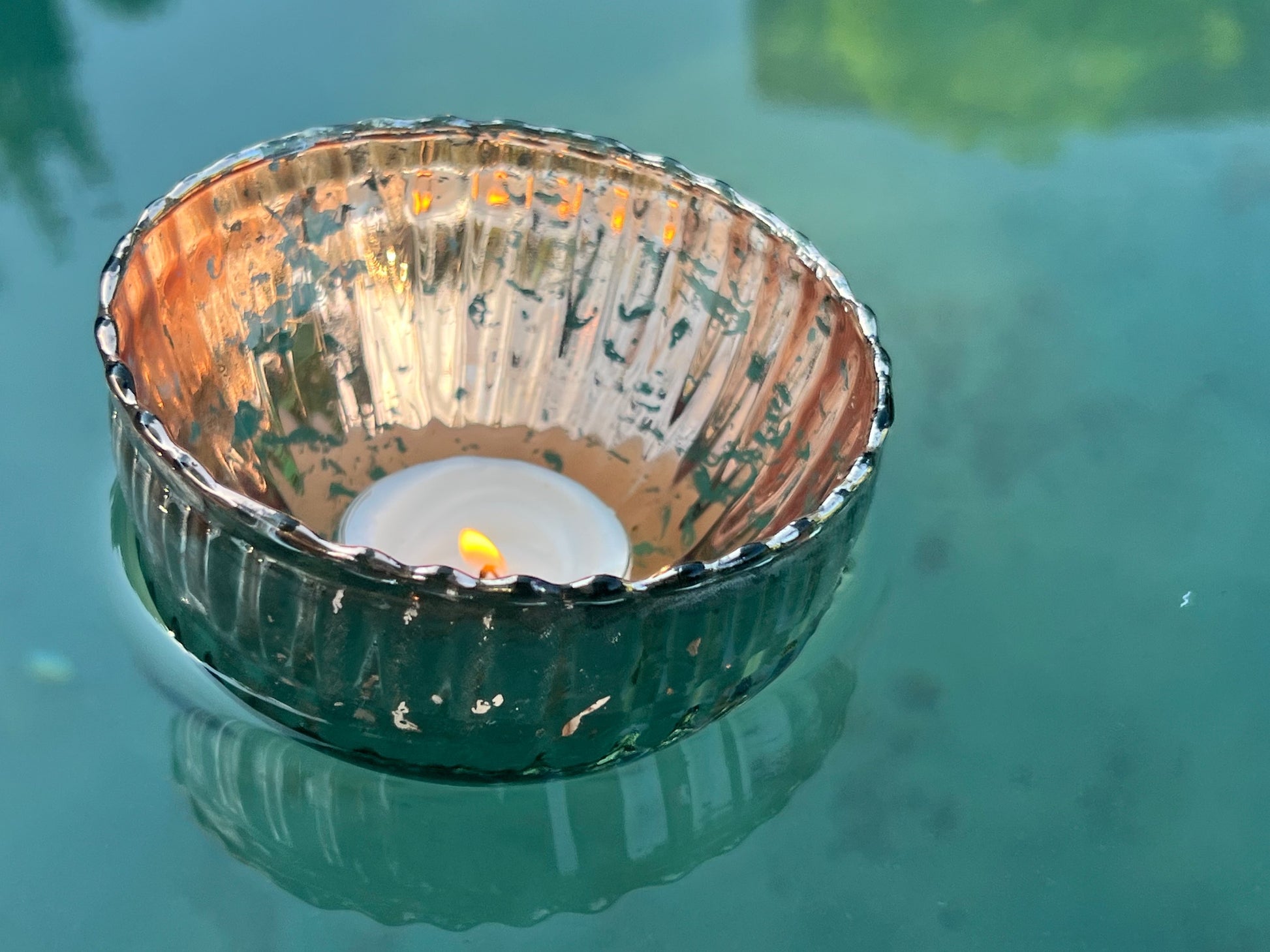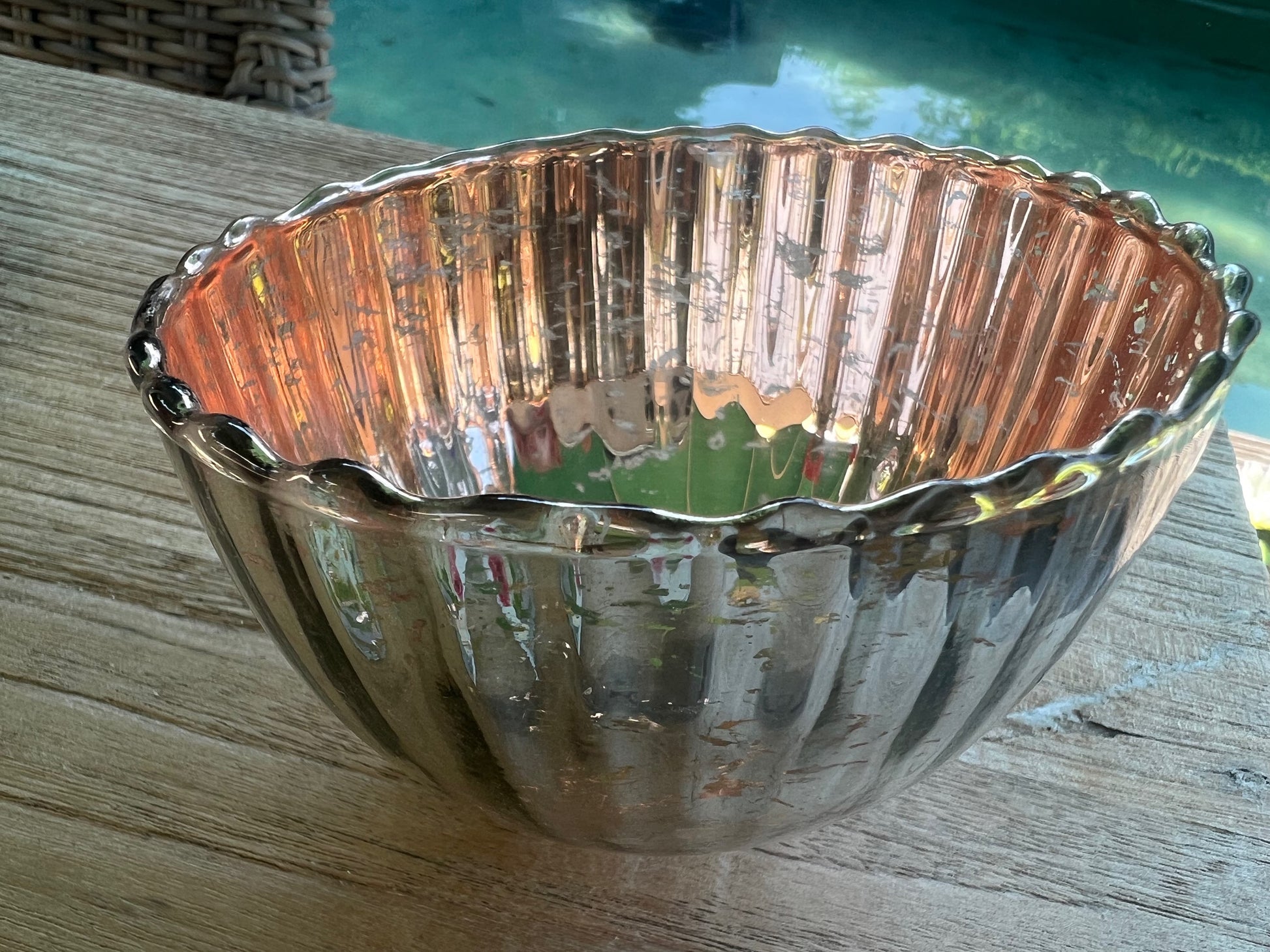 Glänzende Silberschale schwimmend - innen ist die Farbe Türkisblau.