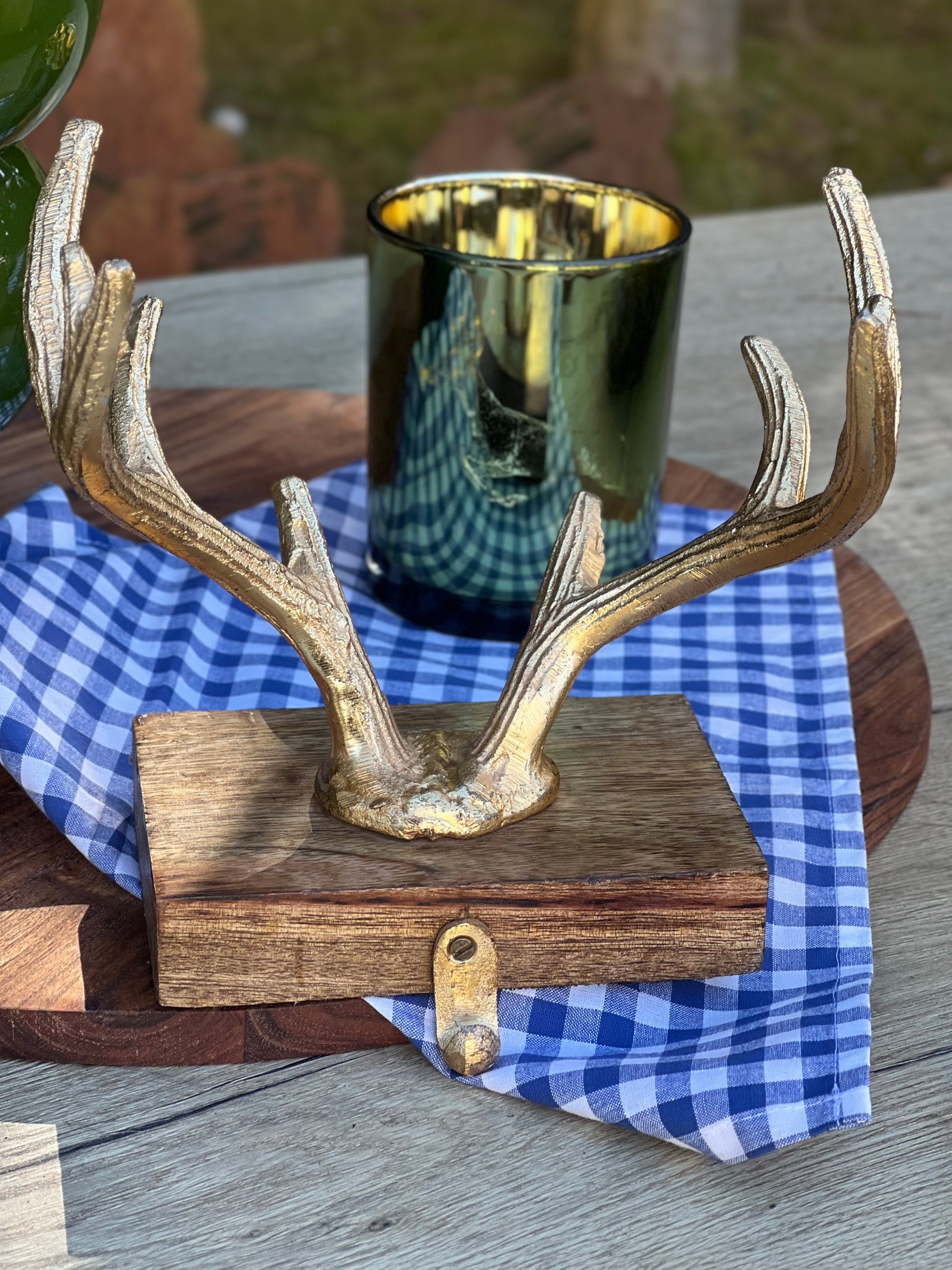 An den sehr schweren Holzsockel mit einem goldenen Geweih und einem Haken lassen sich wunderbar kleine Accessoires oder Geschirrtücher anhängen.