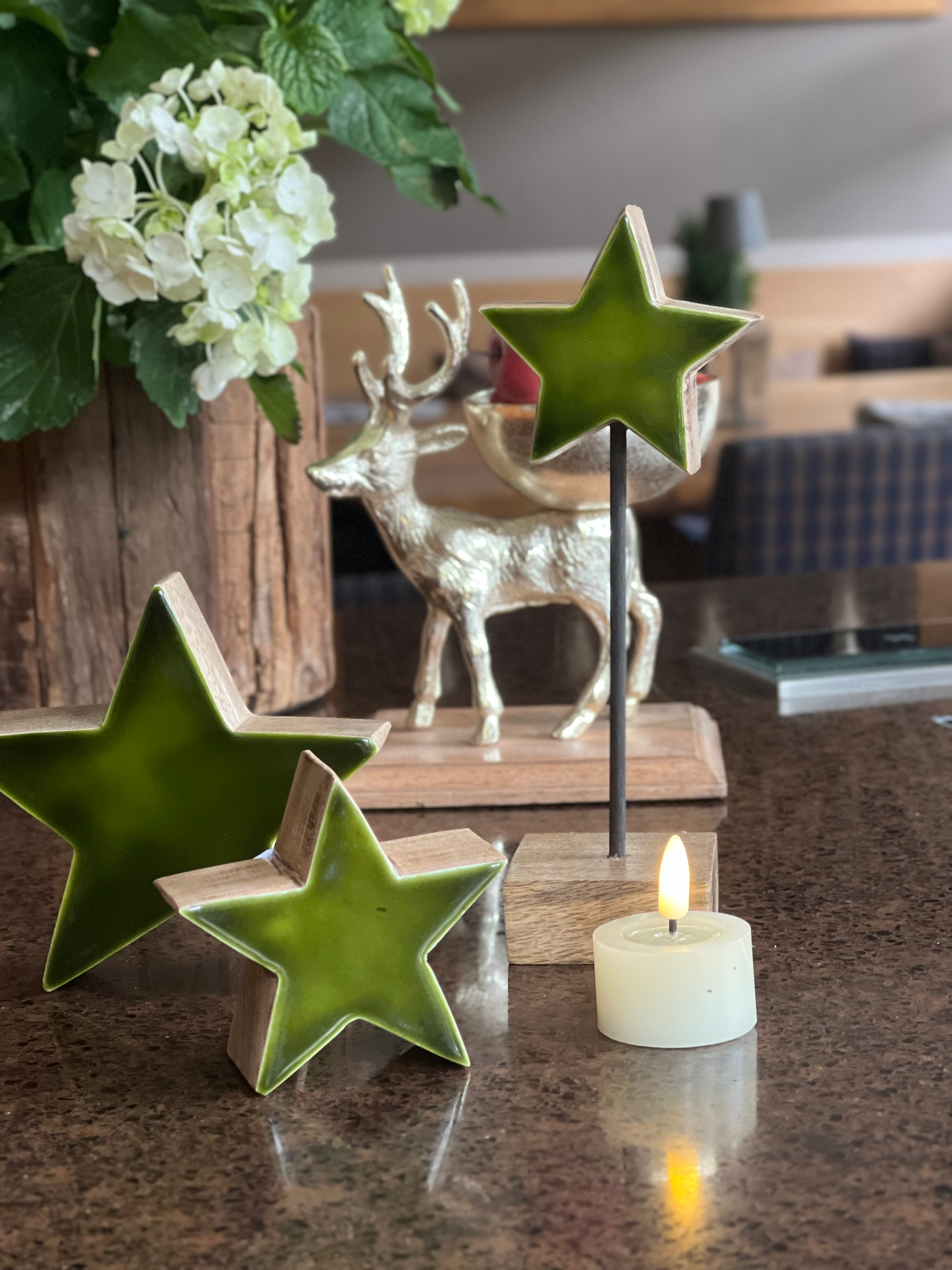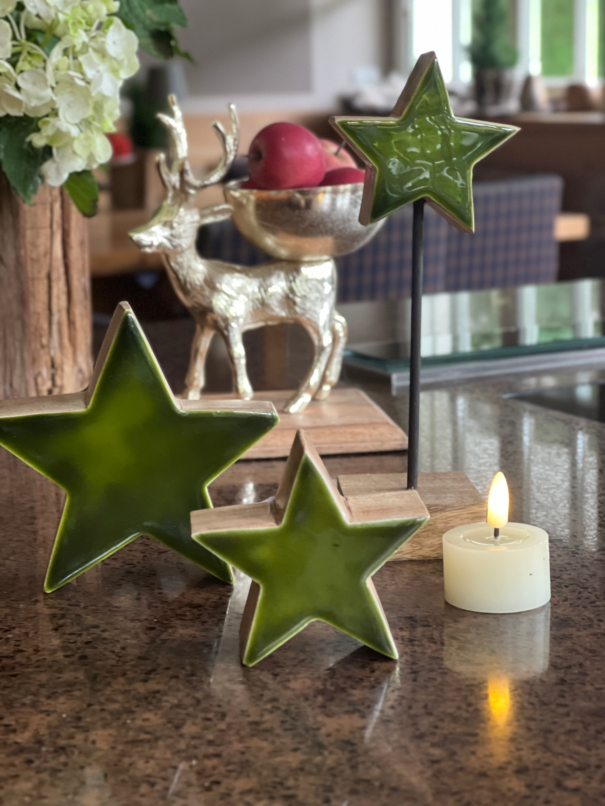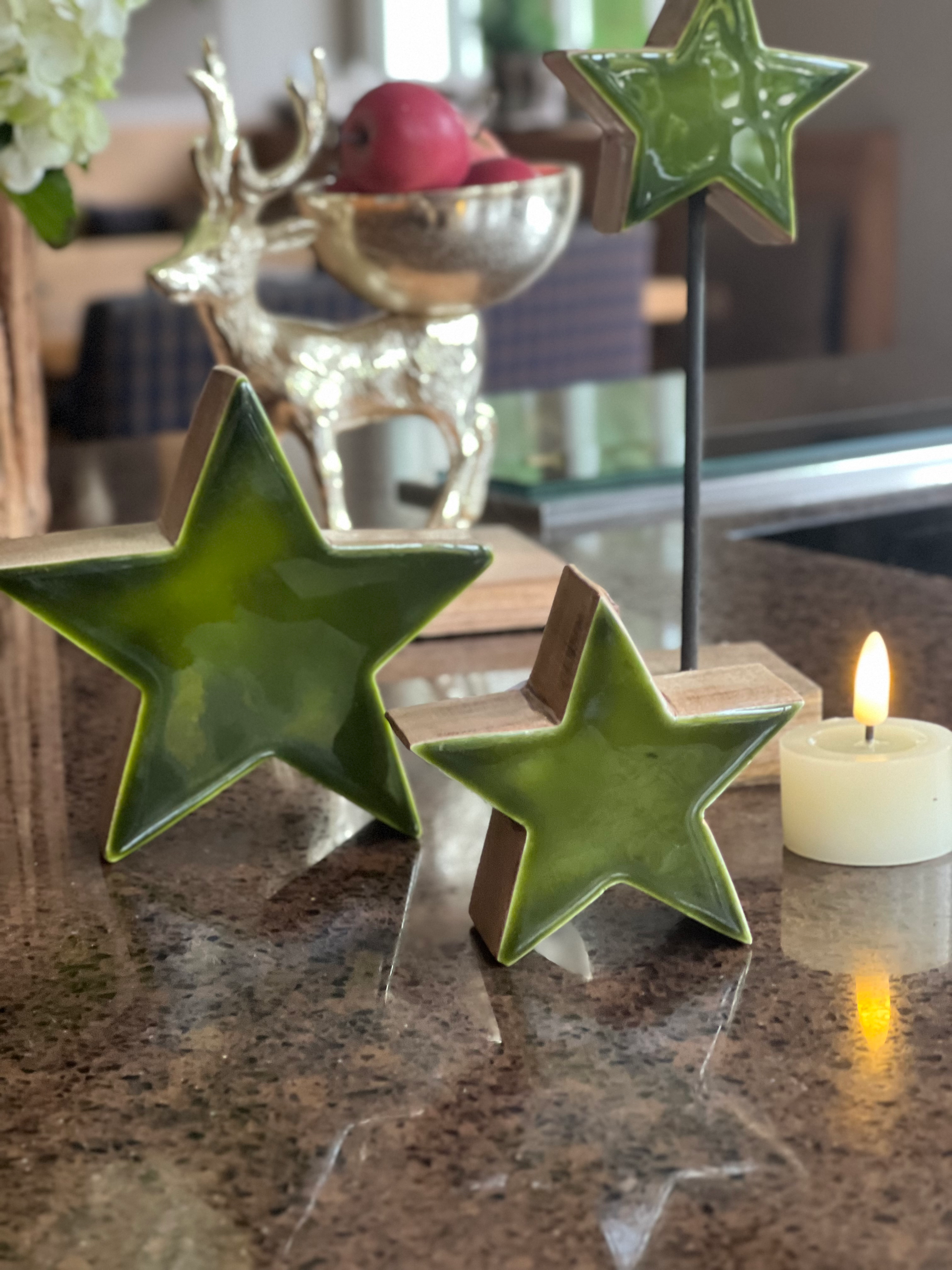 Diese wunderschönen Sterne aus Holz bringen weihnachtliche Eleganz in jedes Zuhause. Das glänzende Grün harmoniert perfekt mit der natürlichen Holzoptik und macht die Sterne zu einem besonderen Blickfang – ob einzeln arrangiert oder als harmonisches Trio.