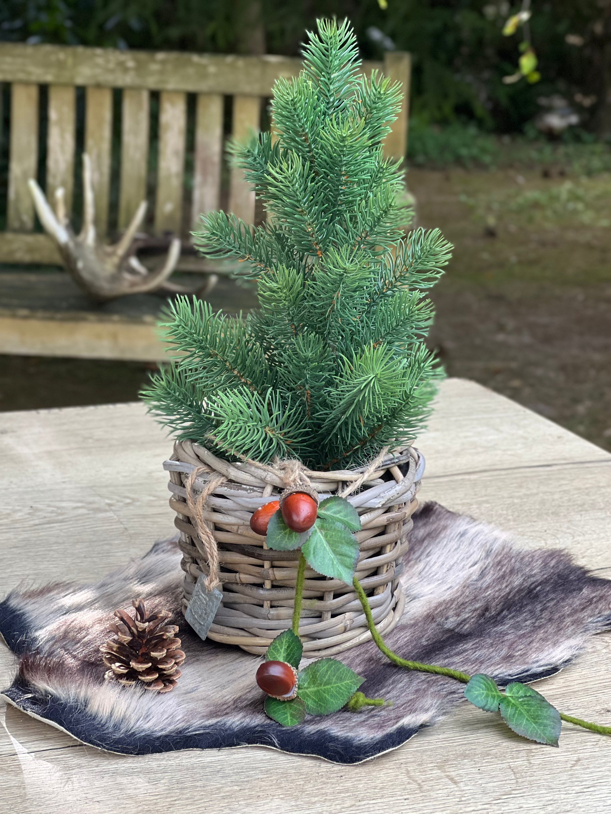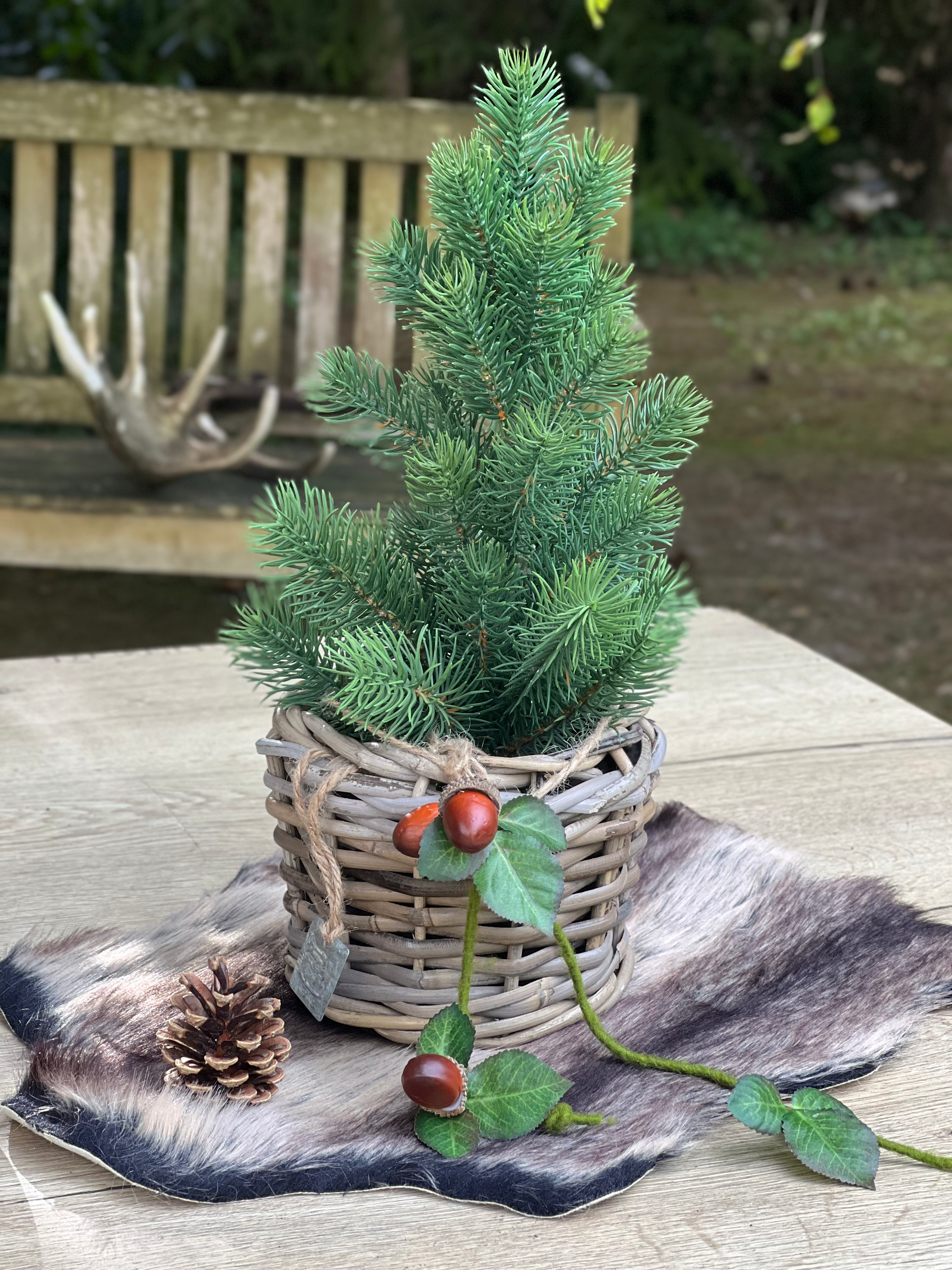 Dieses liebevoll arrangierte Tannenbäumchen bringt natürliche Gemütlichkeit in dein Zuhause. Der realistisch gearbeitete Mini-Tannenbaum sitzt in einem hochwertigen, geflochtenen Korb (Drypot).