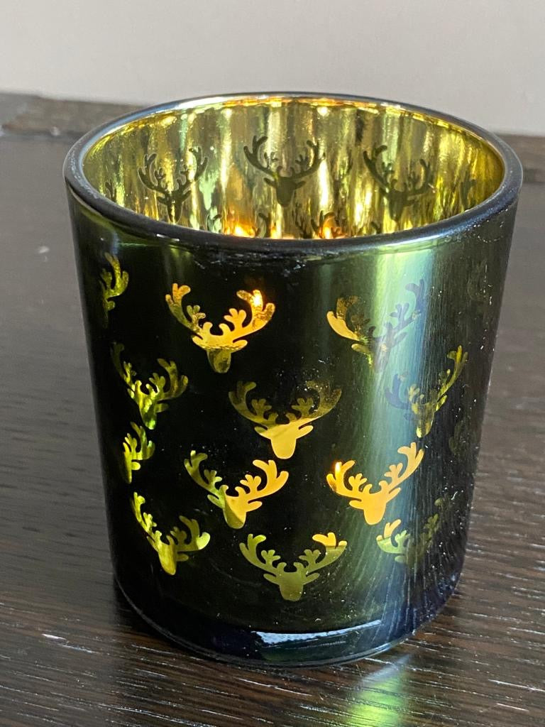 Süßes kleines Windlicht für Teelichter in grün mit transparenten Hirschköpfen. Die Teelichthalter machen ein ganz wunderbares Licht.
