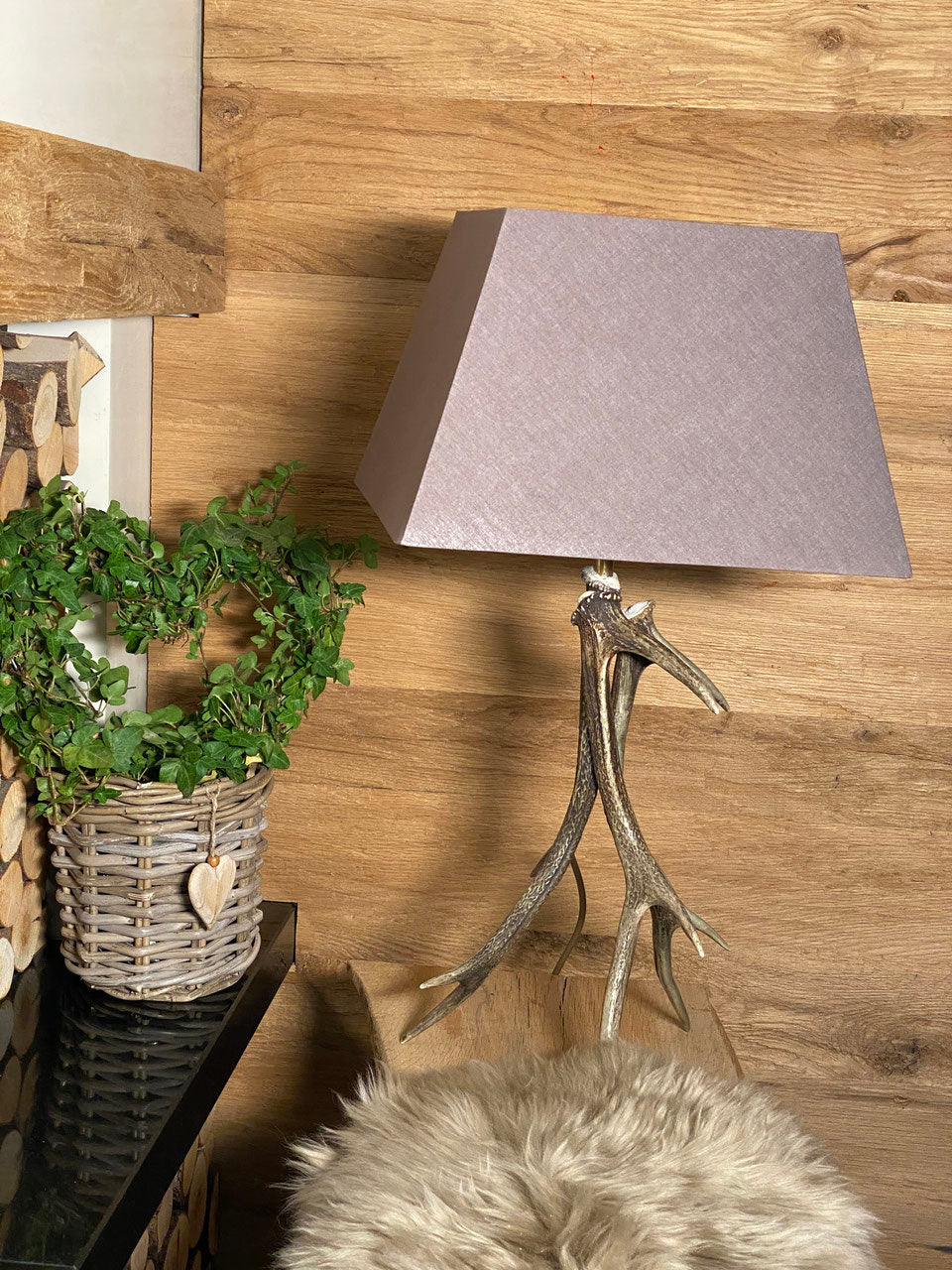 Diese wunderschöne Tischlampe wurde aus drei Rothirsch Abwurfstangen. Der handgefertigte Schirm, welcher eine E27 Fassung umschließt, hat die Farbe Taupe und kann selbstverständlich auf Ihre Farbwünsche angepasst werden. In Bezug auf Form und Stoffmuster sind wir hierbei flexibel.