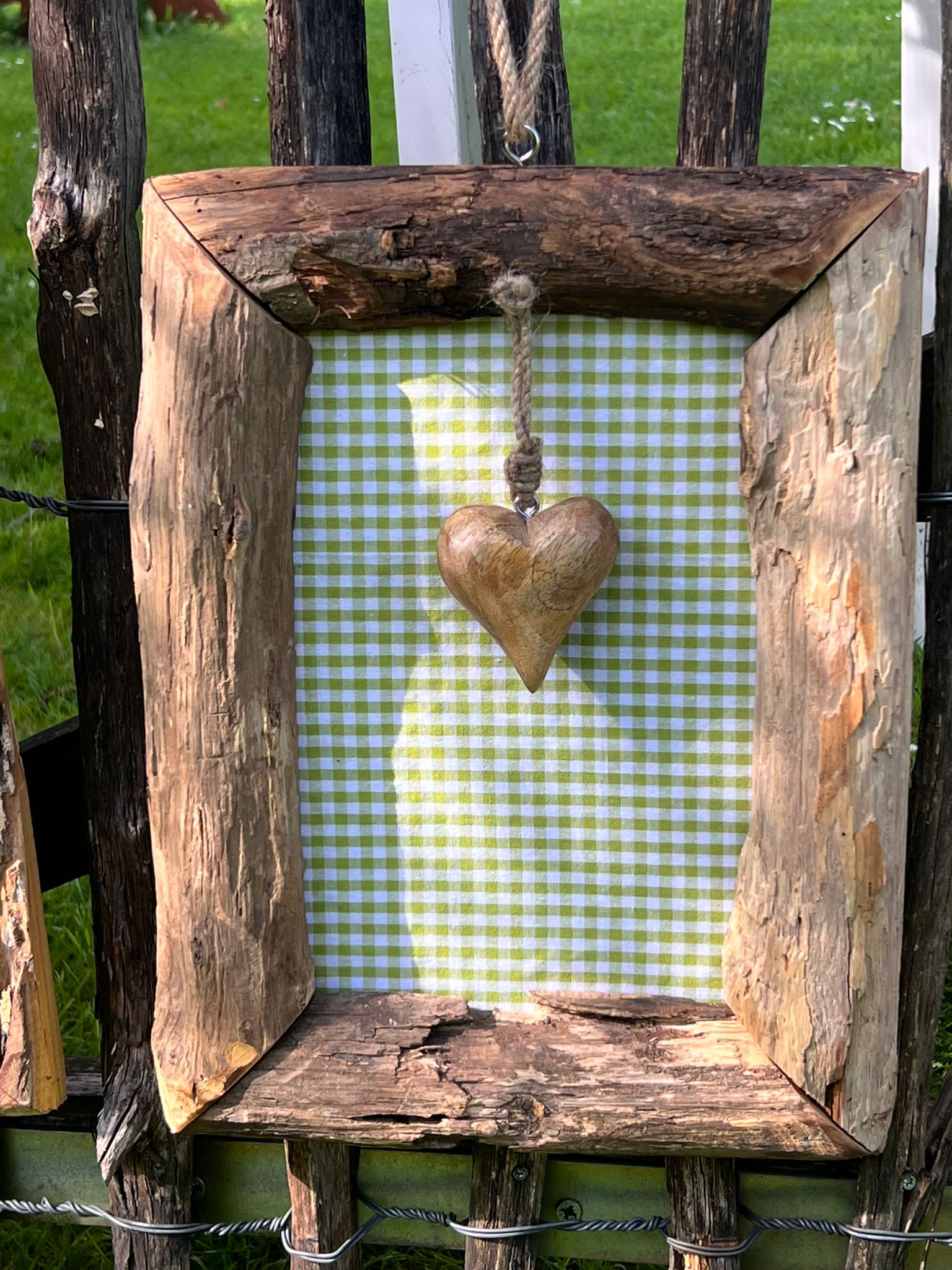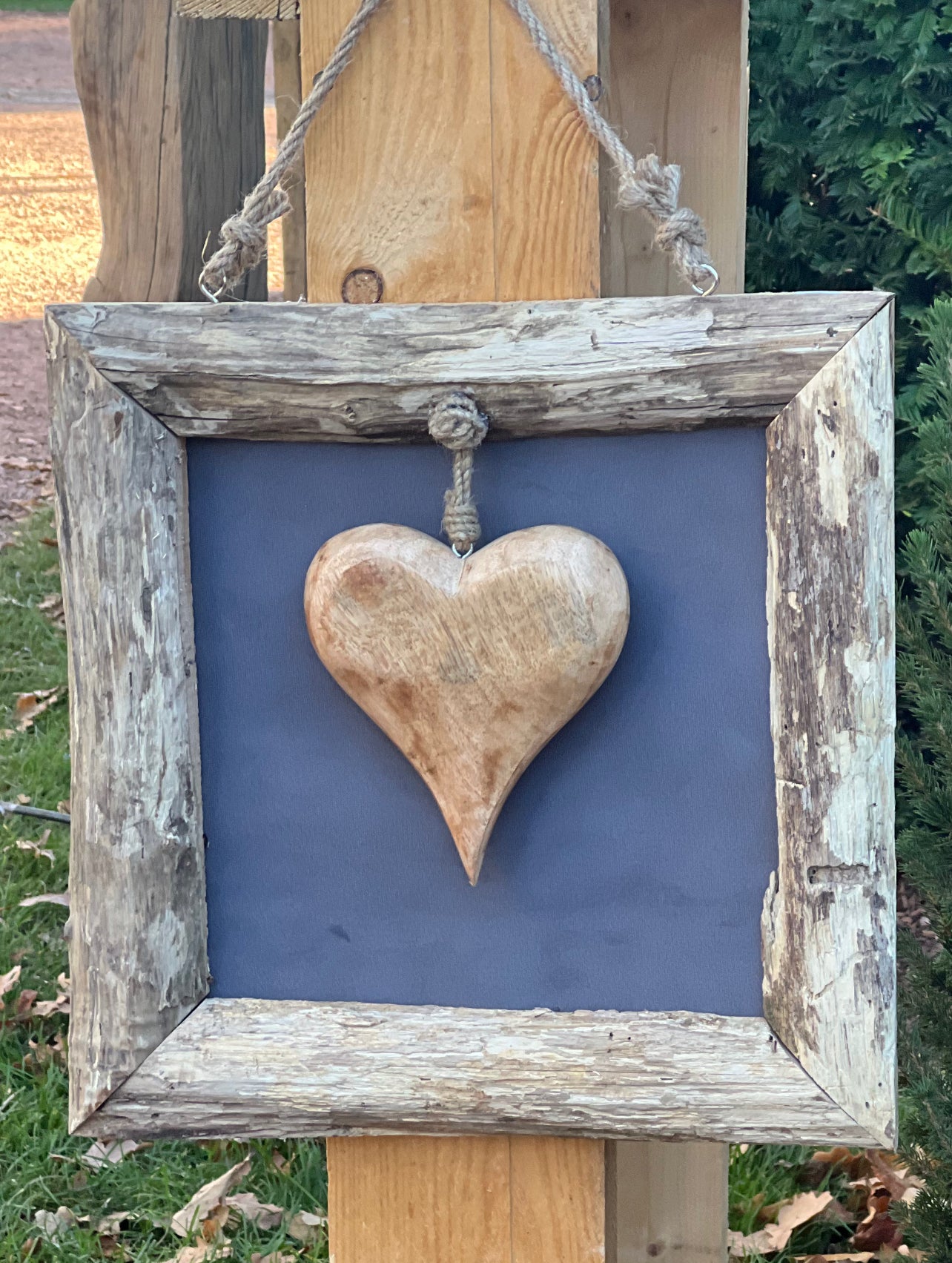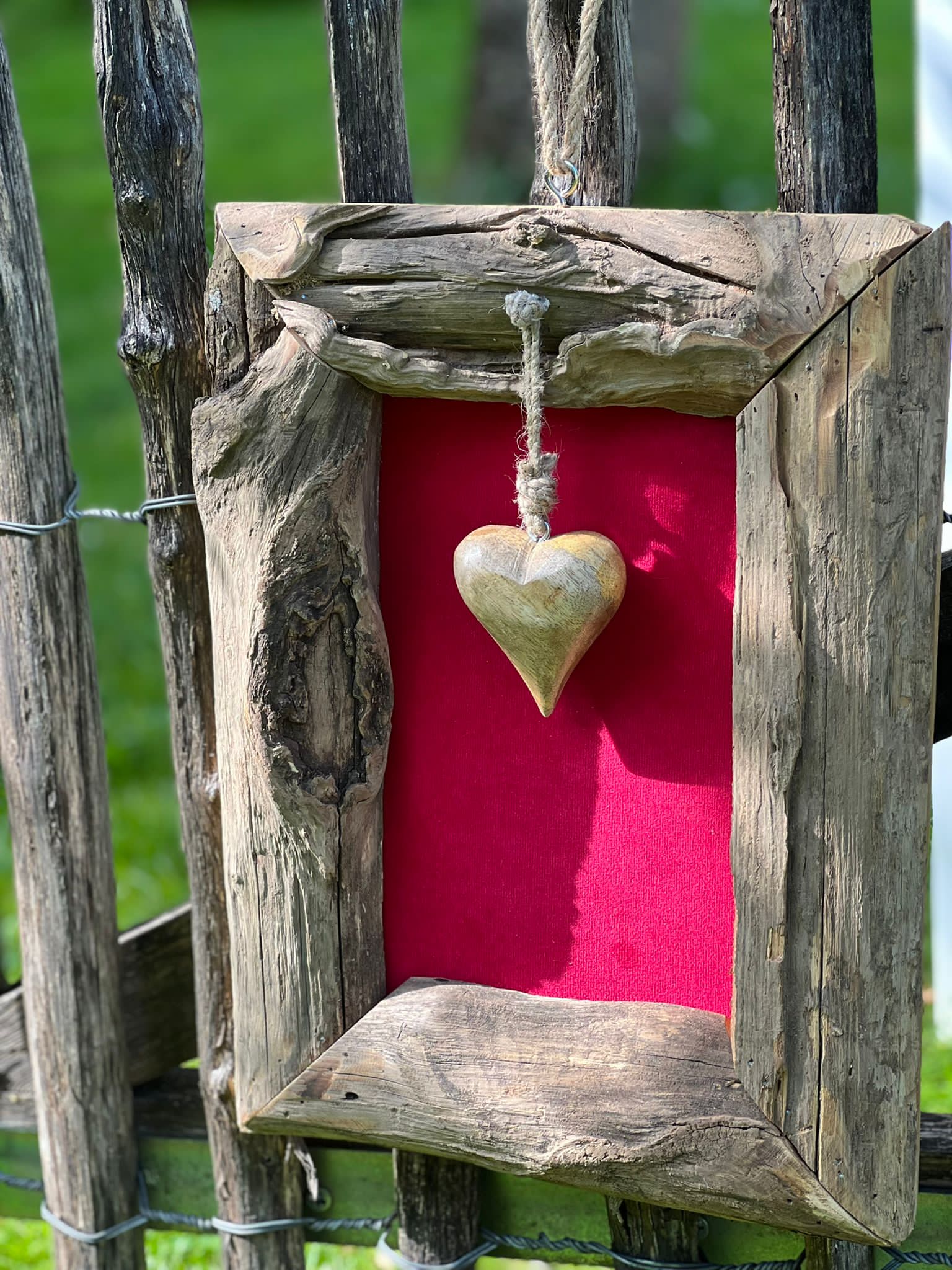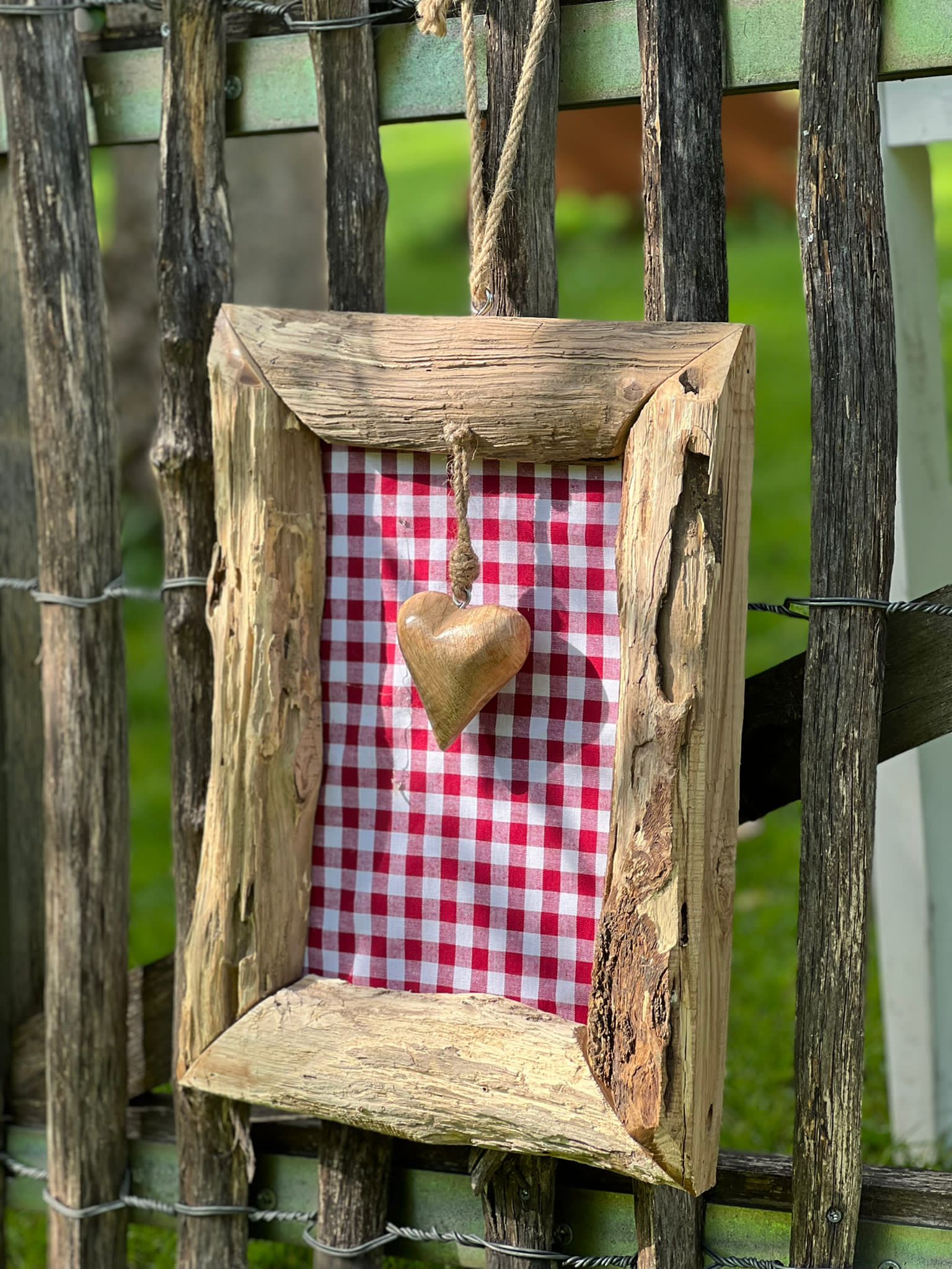 Urige Altholzbilder mit verschiedenen Stoffen bespannt und eingehängtem Holzherz.