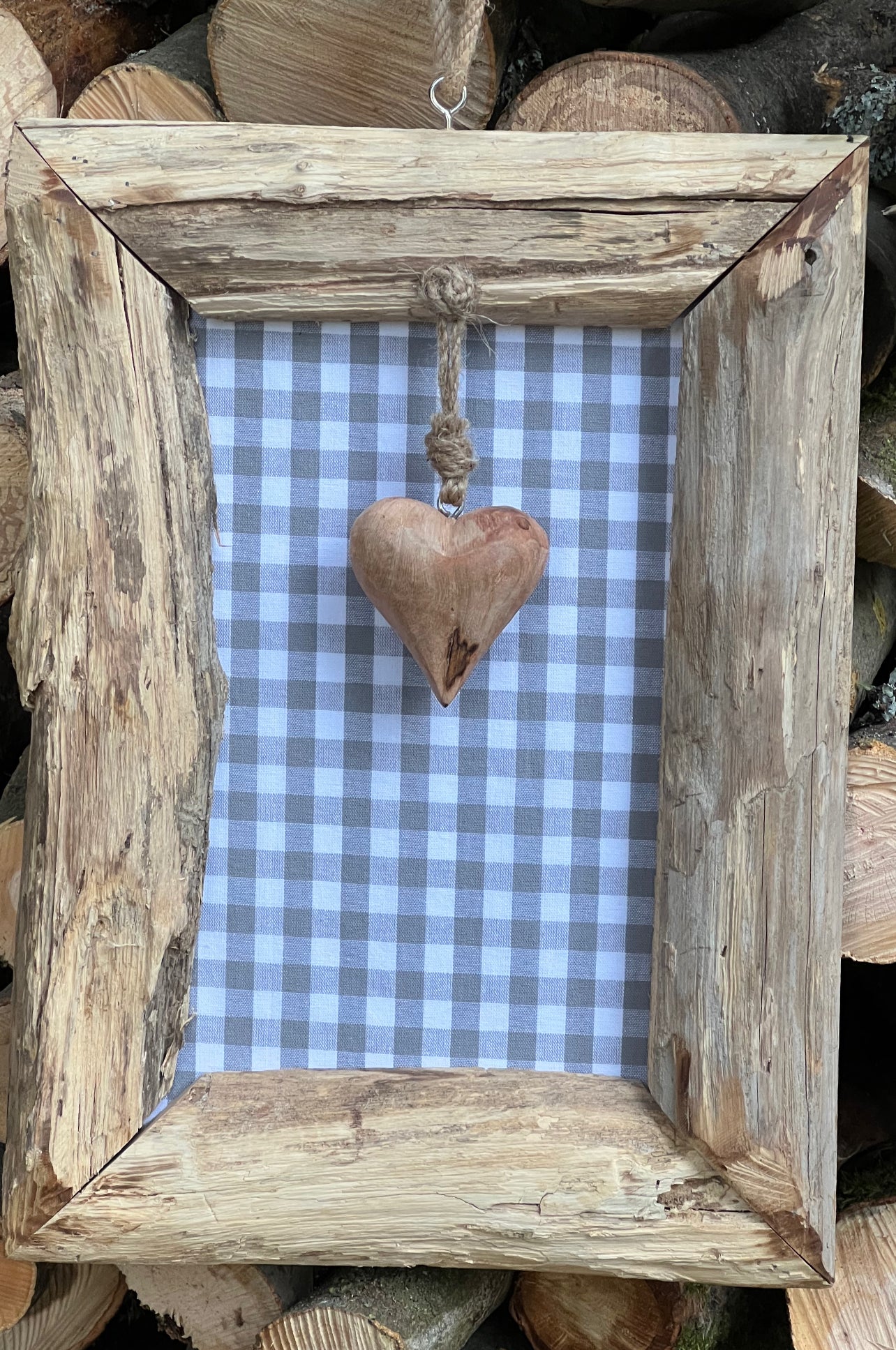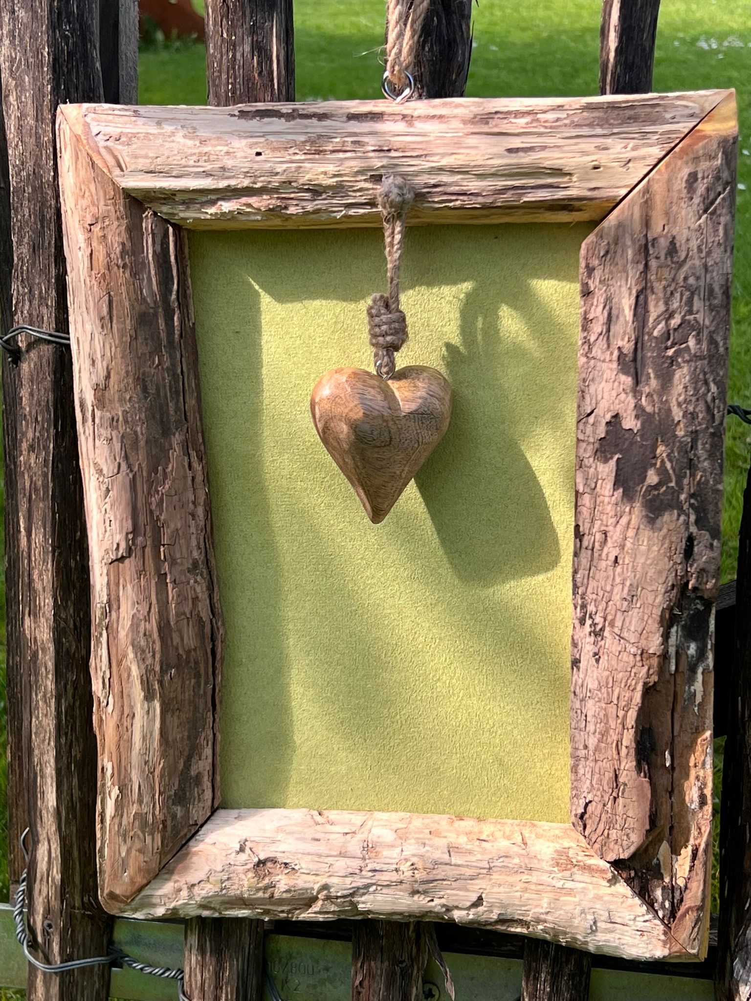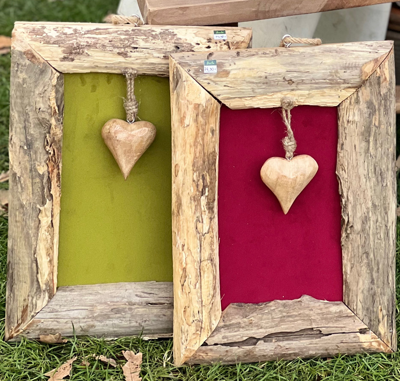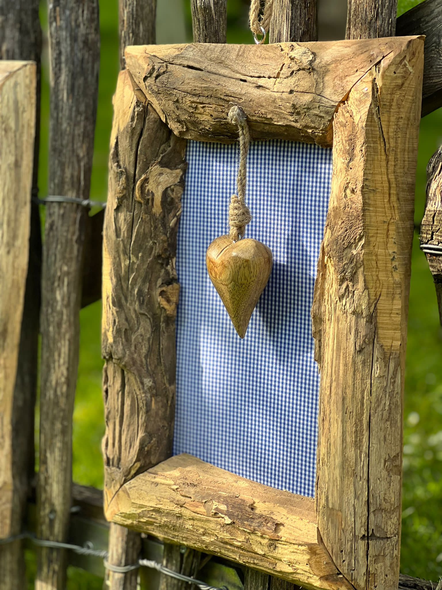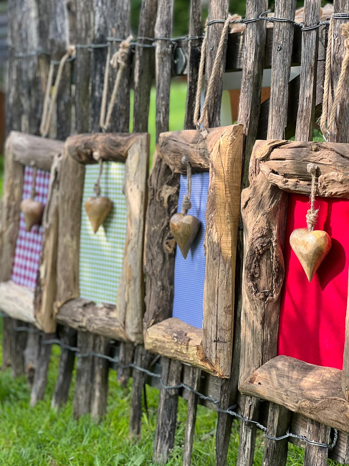 Urige Altholzbilder mit verschiedenen Stoffen bespannt und eingehängtem Holzherz.